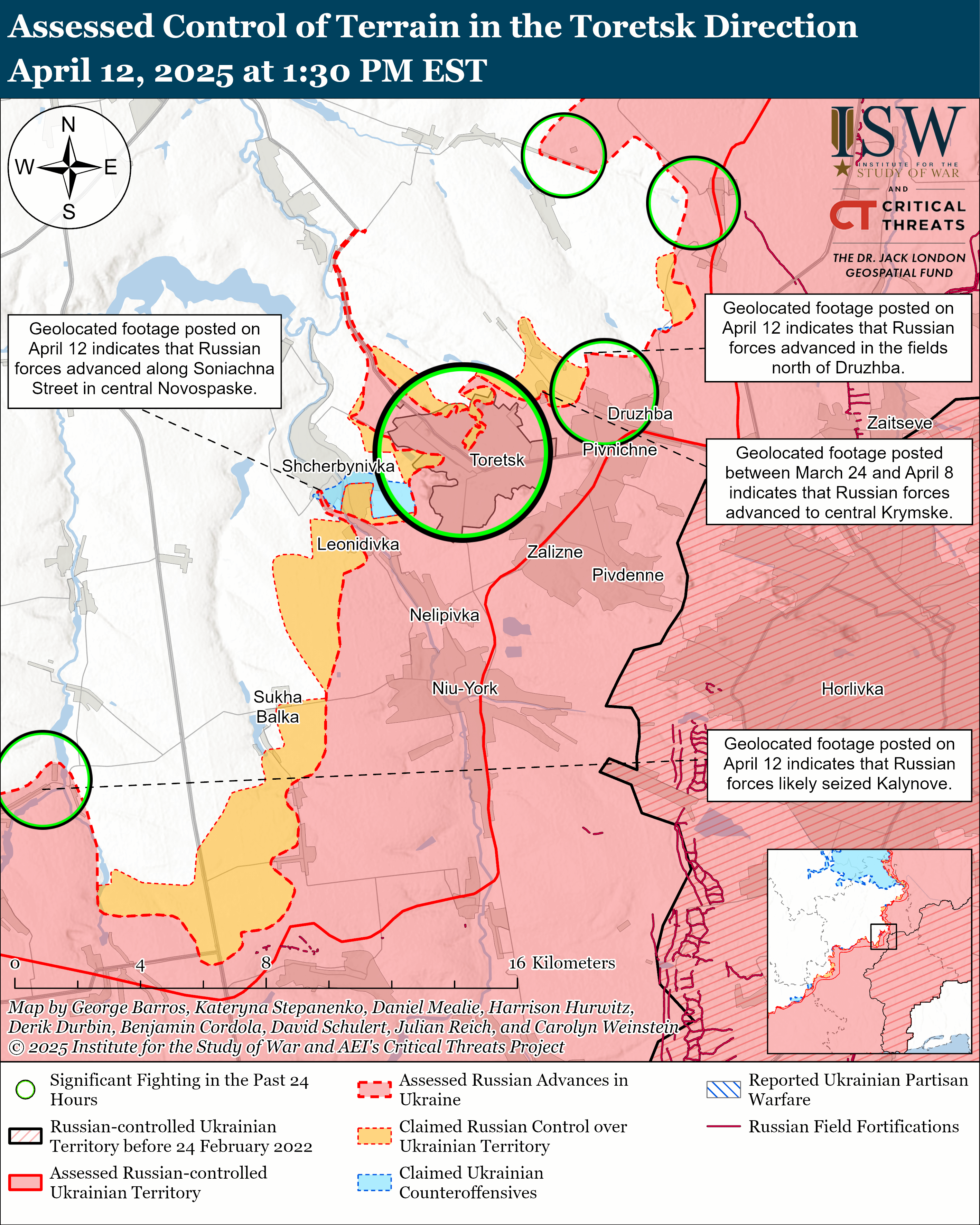 Russian forces attacked near Toretsk itself, northwest of Toretsk near Ivanopillya, north of Toretsk near Dachne and Dyliivka, east of Toretsk near Druzhba, and southwest of Toretsk near Oleksandropil and Valentynivka on April 11 and 12.[50]