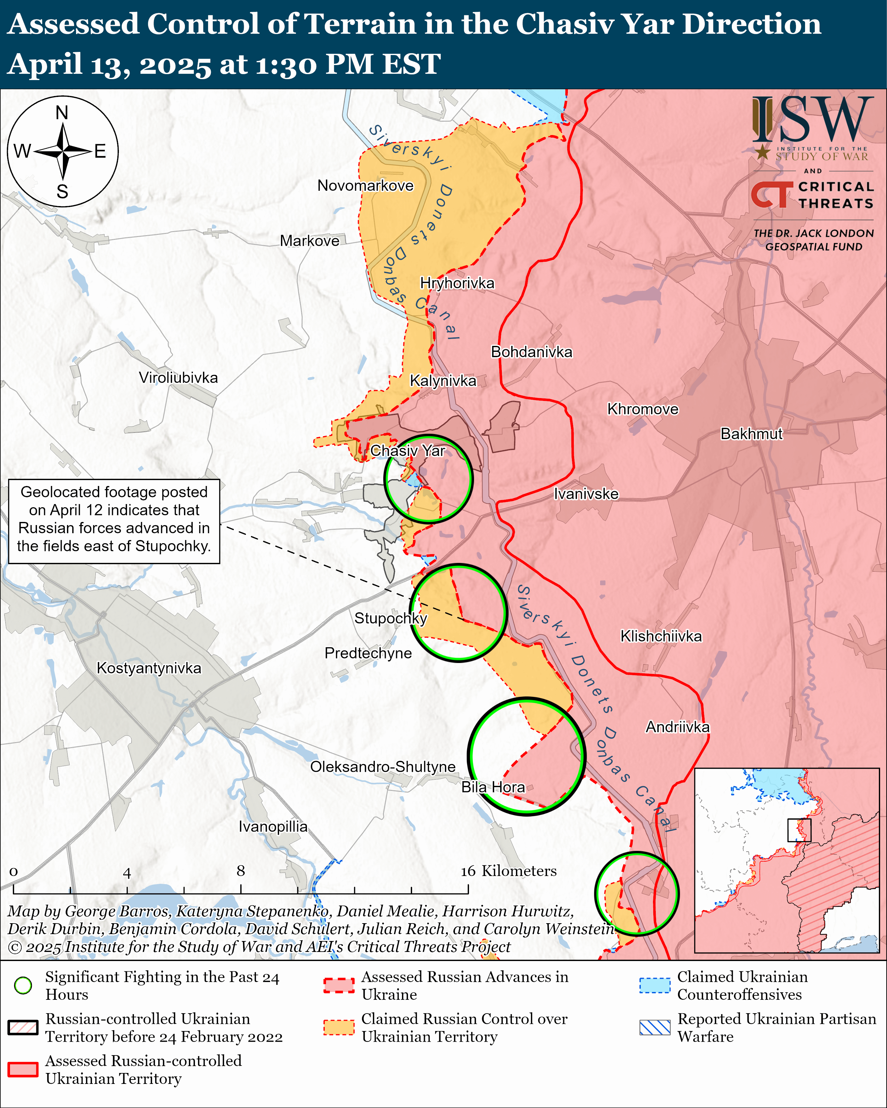Russian forces continued assaults in Chasiv Yar itself and south of Chasiv Yar from Andriivka and in the direction of Predtechyne on April 12 and 13.[57]