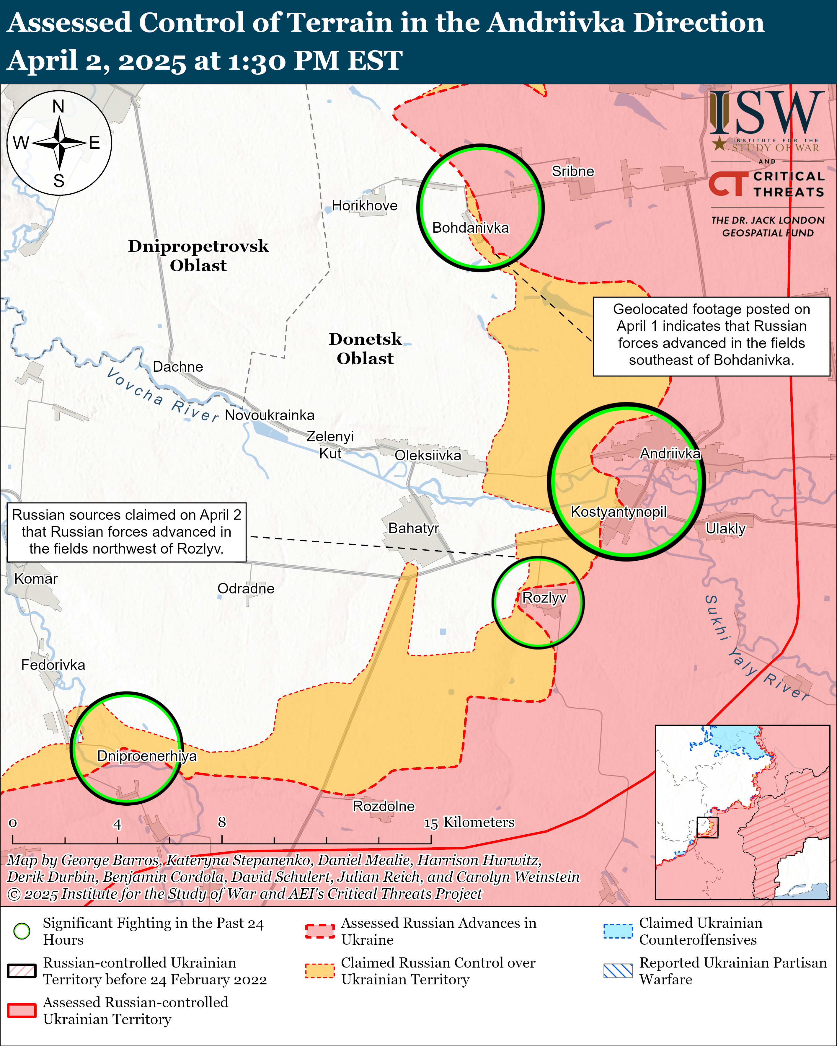 Russian forces conducted offensive operations near Pokrovsk itself; northeast of Pokrovsk near Tarasivka and Berezivka; east of Pokrovsk near Vodyane Druhe, Yelyzavetivka, Promin, and Kalynove; southeast of Pokrovsk near Lysivka; south of Pokrovsk near Zelene and Vidrodzhennya (formerly Novyi Trud); and southwest of Pokrovsk near Kotlyne, Udachne, Kotlyarivka, Uspenivka, Sribne, Novooleksandrivka, Bohdanivka, and Novoserhiivka on April 1 and 2.[69] Ukraine’s Khortytsia Group of Forces reported on April 1 that Ukrainian forces repelled a platoon-sized mechanized assault consisting of three infantry fighting vehicles (IFVs) and an unspecified number of motorcycles in the Novopavlivka direction (southwest of Pokrovsk).[70] Russian milbloggers claimed that Ukrainian forces are counterattacking near Lysivka, Shevchenko, Novooleksandrivka, and Udachne and are accumulating forces for future counterattacks.[71]