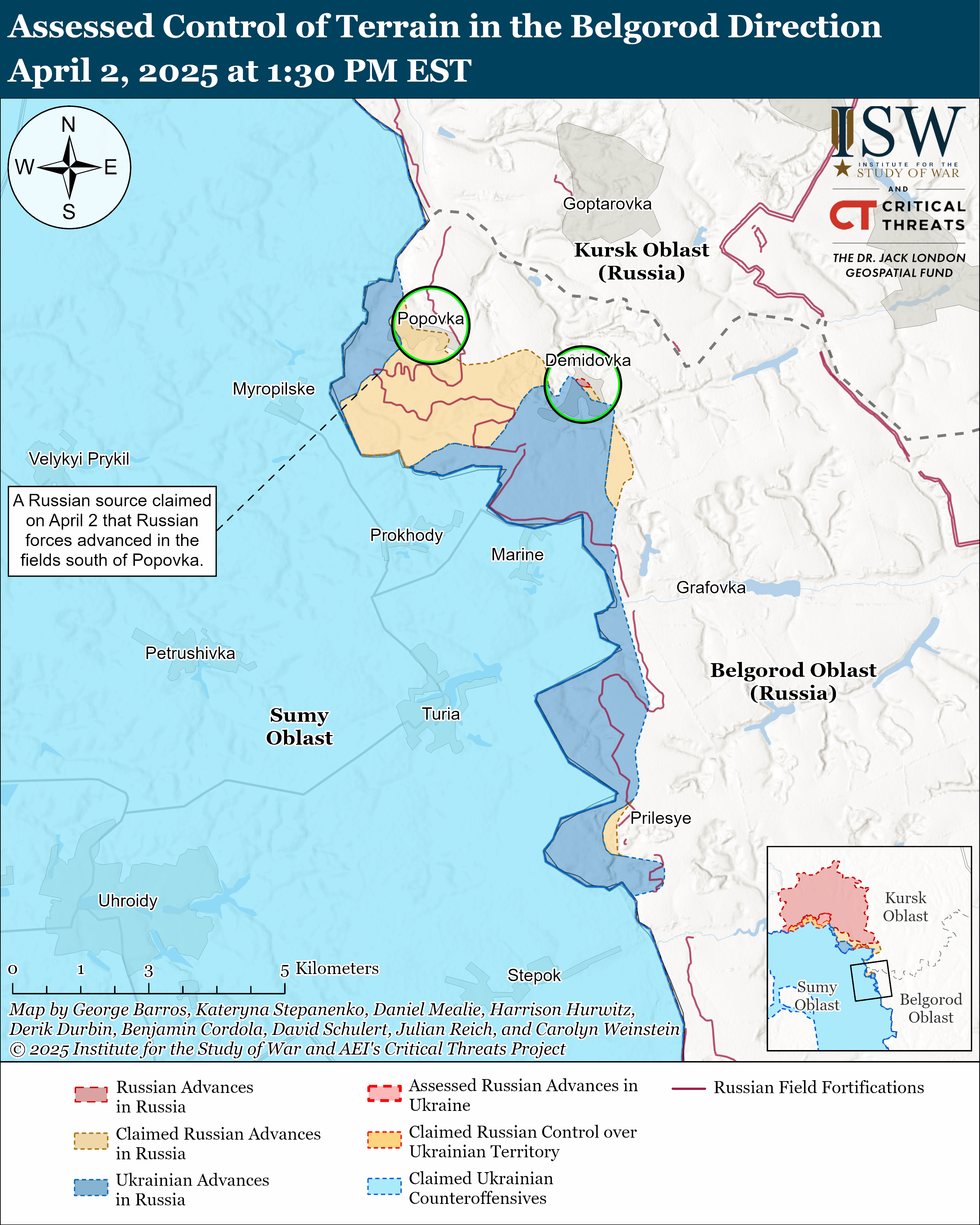 Unconfirmed claims: A Russian milblogger claimed on April 2 that Russian forces advanced south of Popovka and west of Demidovka (both northwest of Belgorod City).[29]