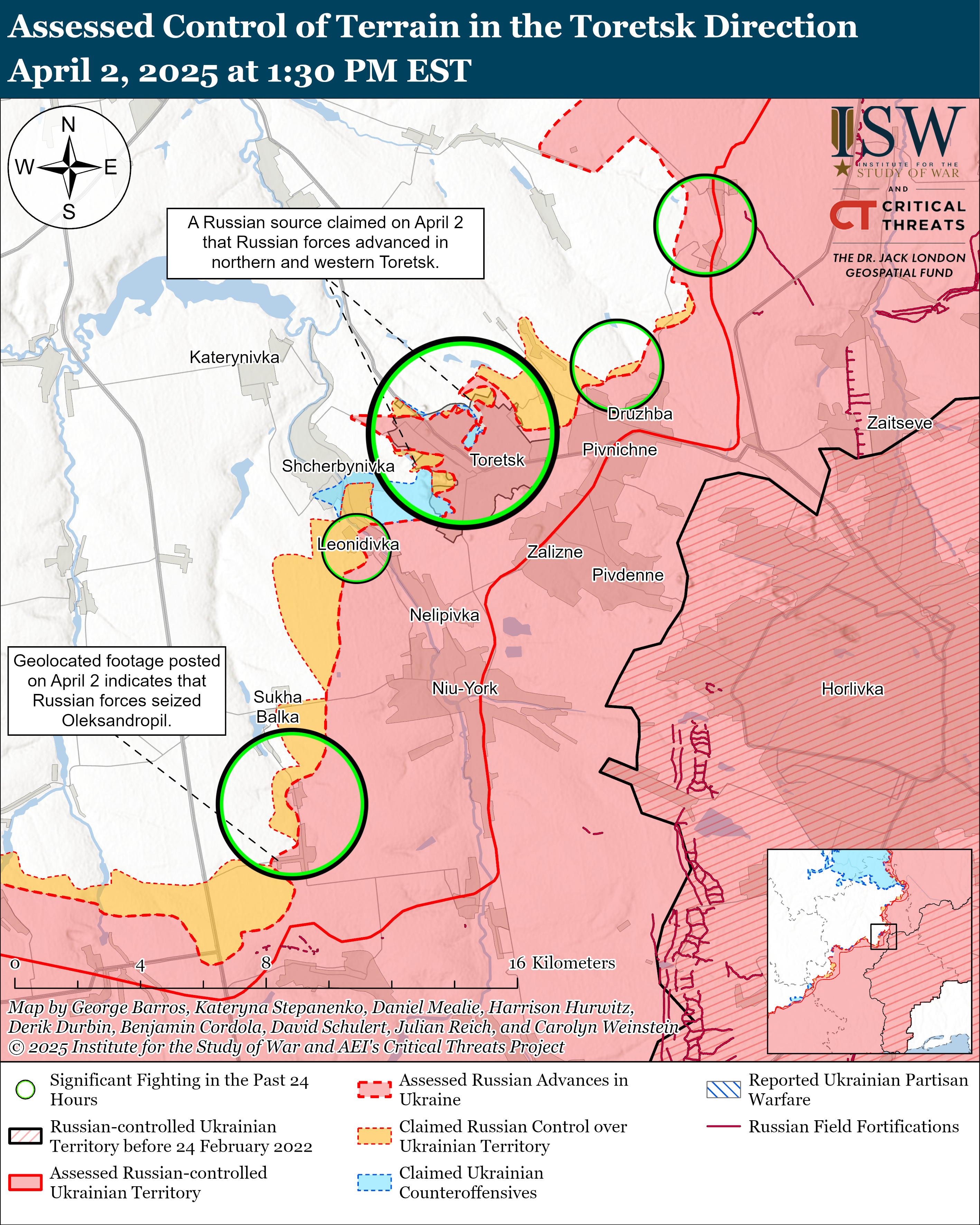 Russian forces attacked near Toretsk itself; north of Toretsk near Dachne and Dyliivka; east of Toretsk near Krymske; west of Toretsk near Romanivka, Shcherbynivka, and Leonidivka; and southwest of Toretsk near Panteleymonivka, Oleksandropil, Valentynivka, and Sukha Balka on April 1 and 2.[61]