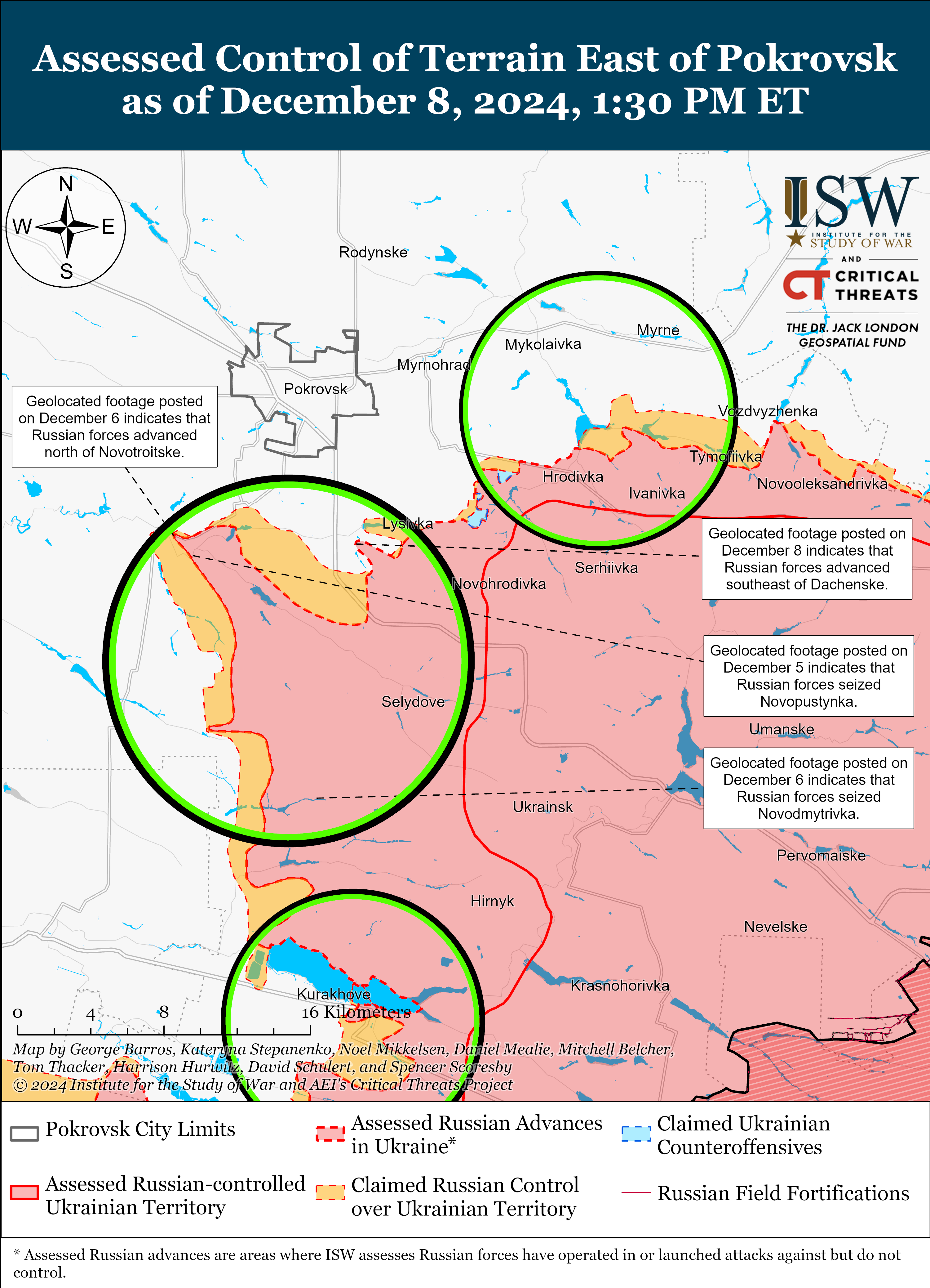 Russian forces recently advanced in the Pokrovsk direction amid continued Russian offensive operations in the area on December 8. Geolocated footage published on December 7 and 8 indicates that Russian forces recently advanced east of Ukrainka (southwest of Pokrovsk) and southeast of Dachenske (southeast of Pokrovsk).[52] Russian milbloggers claimed that Russian forces seized Novotroitske (southwest of Pokrovsk) and advanced within Shevchenko and Zelene (both south of Pokrovsk) and southeast of Novotroitske.[53] ISW has not observed confirmation of these claims. Russian forces continued attacking east of Pokrovsk near Myrolyubivka, Myrnohrad, Hrodivka, and Promin; southeast of Pokrovsk near Lysivka and Sukhyi Yar; south of Pokrovsk near Zhovte, Dachenske, Pushkine, Shevchenko, Novyi Trud, and Zelene; and southwest of Pokrovsk near Novotroitske on December 7 and 8.[54]