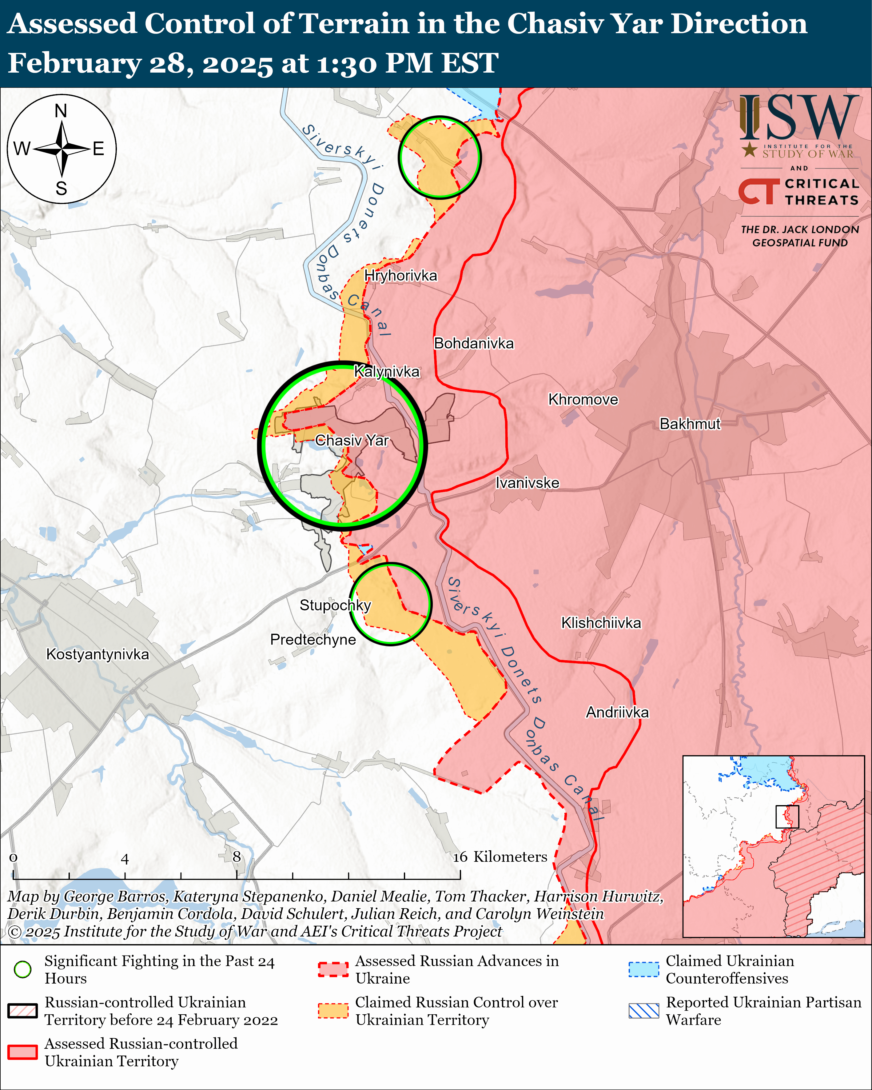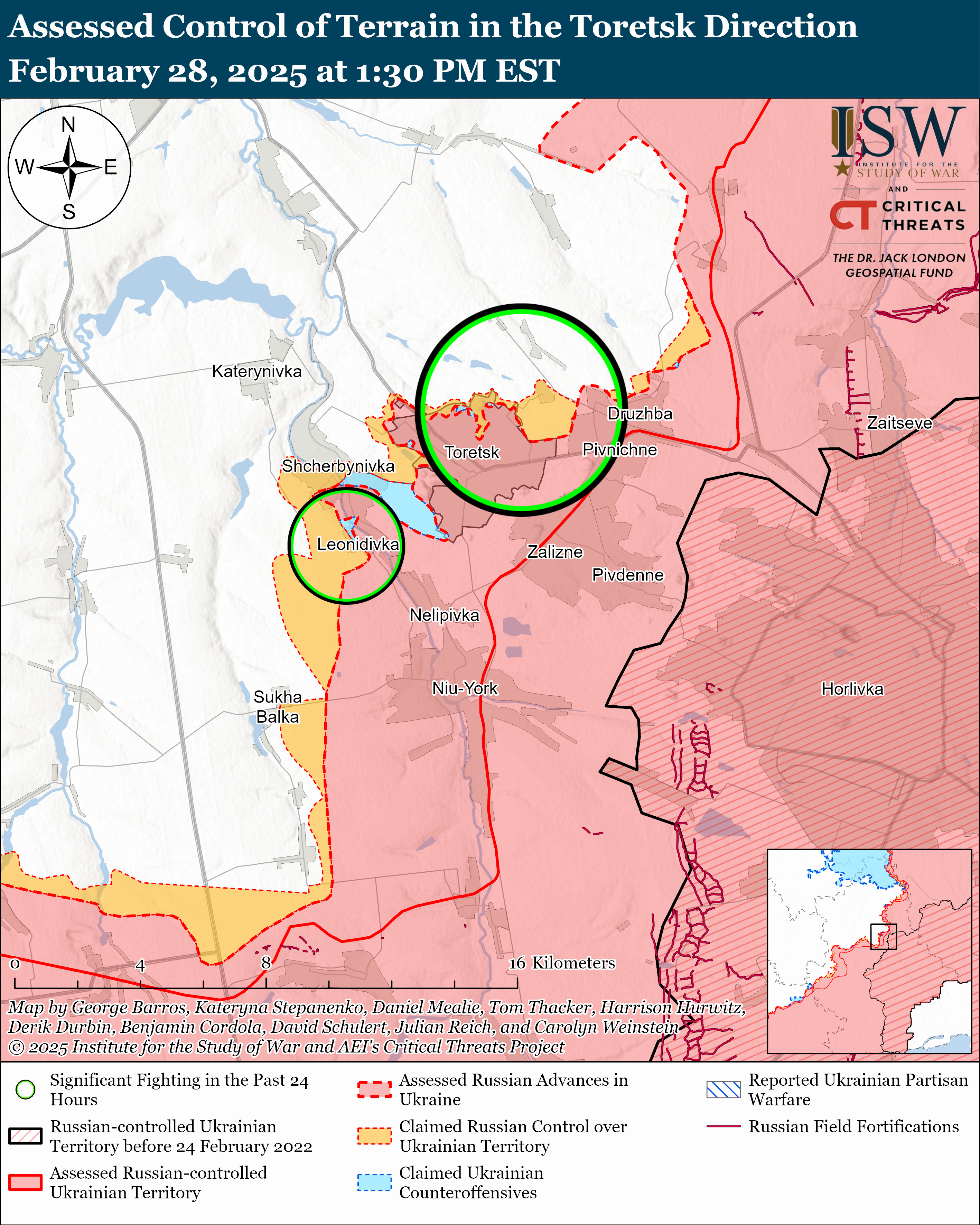 Russian forces continued offensive operations in the Toretsk direction on February 28 but did not advance. Russian forces continued attacking near Toretsk itself; north of Toretsk near Krymske; northeast of Toretsk near Dachne; west of Toretsk near Shcherbynivka; and southwest of Toretsk near Leonidivka on February 27 and 28.[46] Russian milbloggers claimed that Ukrainian forces counterattacked on the western outskirts of Toretsk and in Shcherbynivka.[47]