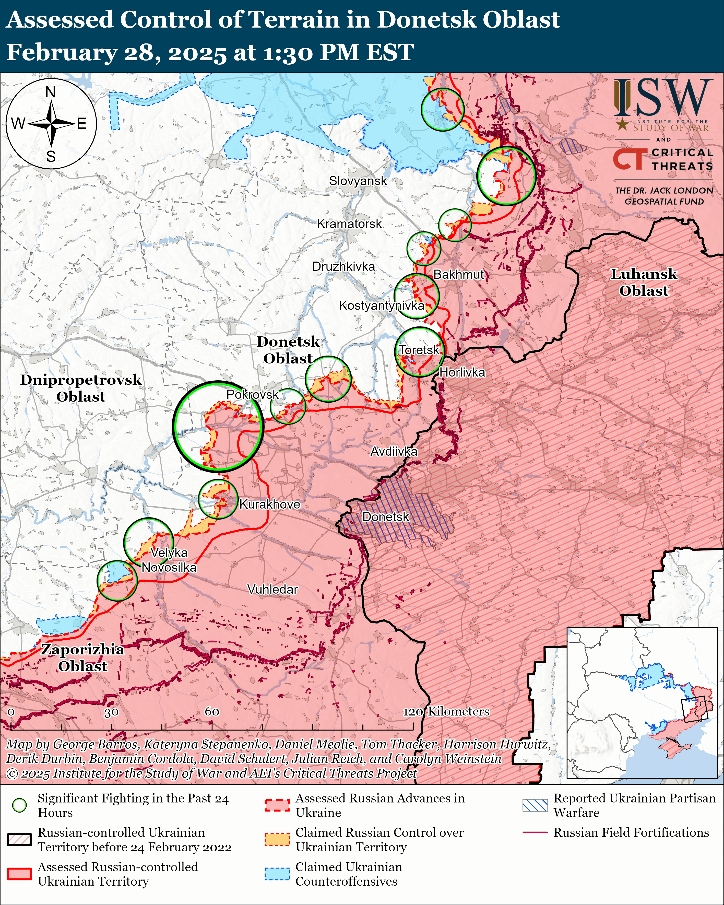 Ukrainian President Volodymyr Zelensky and US President Donald Trump held a contentious meeting at the White House on February 28.[1] Zelensky observed that Russia has repeatedly violated previous ceasefire agreements, as ISW has reported.[2] Zelensky said that Ukraine will not accept a ceasefire agreement with Russia without sufficient external security guarantees, as such an agreement will fail to preserve Ukraine’s sovereignty and prevent war in Europe in the long term. Zelensky stated that Russian strikes have not “completely destroyed” Ukraine and that Ukraine is “alive” and continuing to defend itself against Russian aggression. Zelensky reiterated that no country wants to end the war more than Ukraine and that any negotiations to end the war will be between Ukraine and Russia with US and European mediation efforts. Trump declined to comment on the possibility of future US security guarantees for Ukraine and US troop deployments to Ukraine. Secretary of State Marco Rubio reportedly told Zelensky to leave the White House following the meeting, and the White House canceled the afternoon press conference and the signing of the US-Ukraine mineral deal.[3] ISW continues to assess that supporting Ukraine is a vital American national security interest, as is a strong bilateral relationship between the United States and Ukraine.[4]