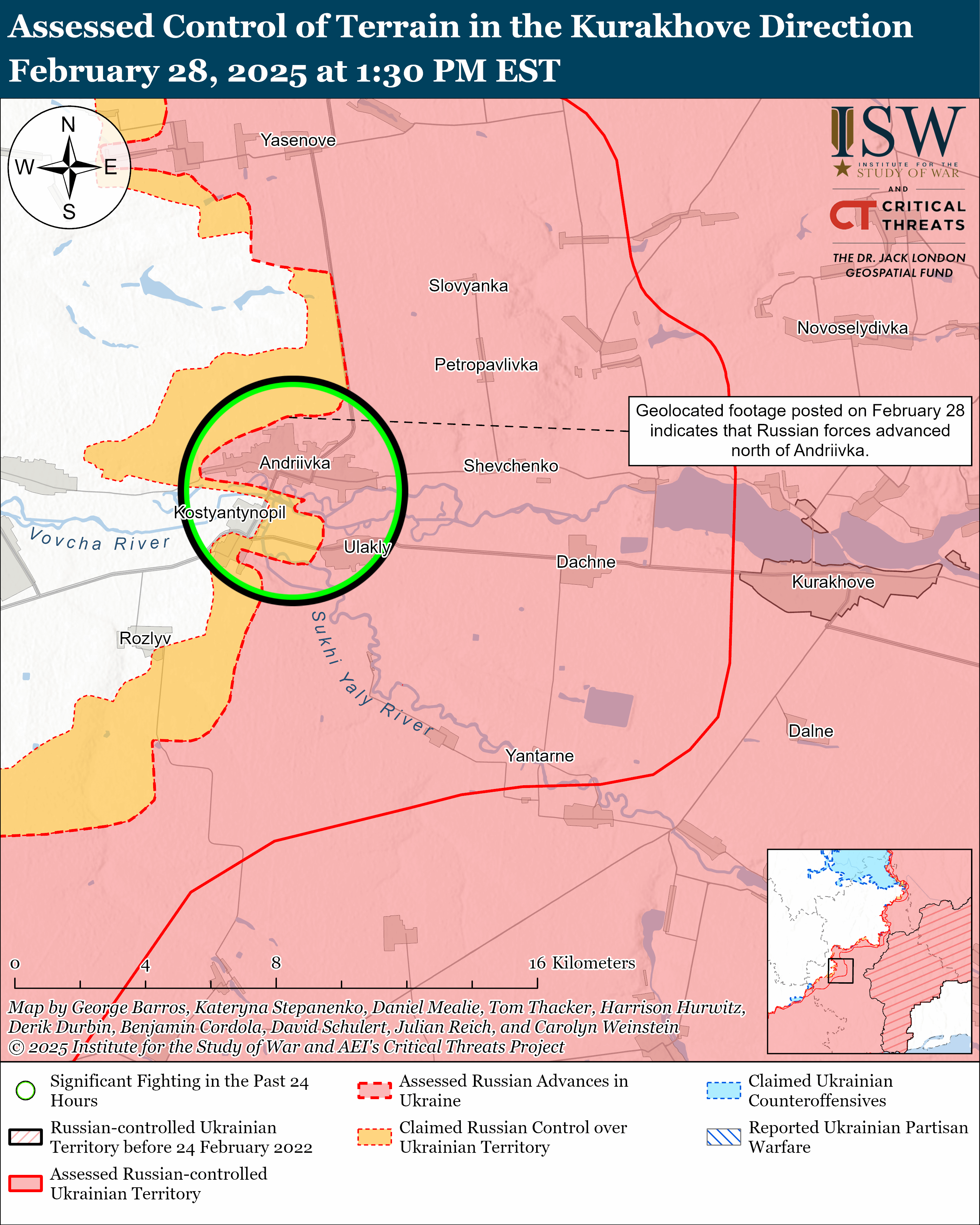 Russian forces recently advanced in the Kurakhove direction. Russian forces attacked west of Kurakhove near Kostyantynopil and Andriivka on February 27 and 28.[55]