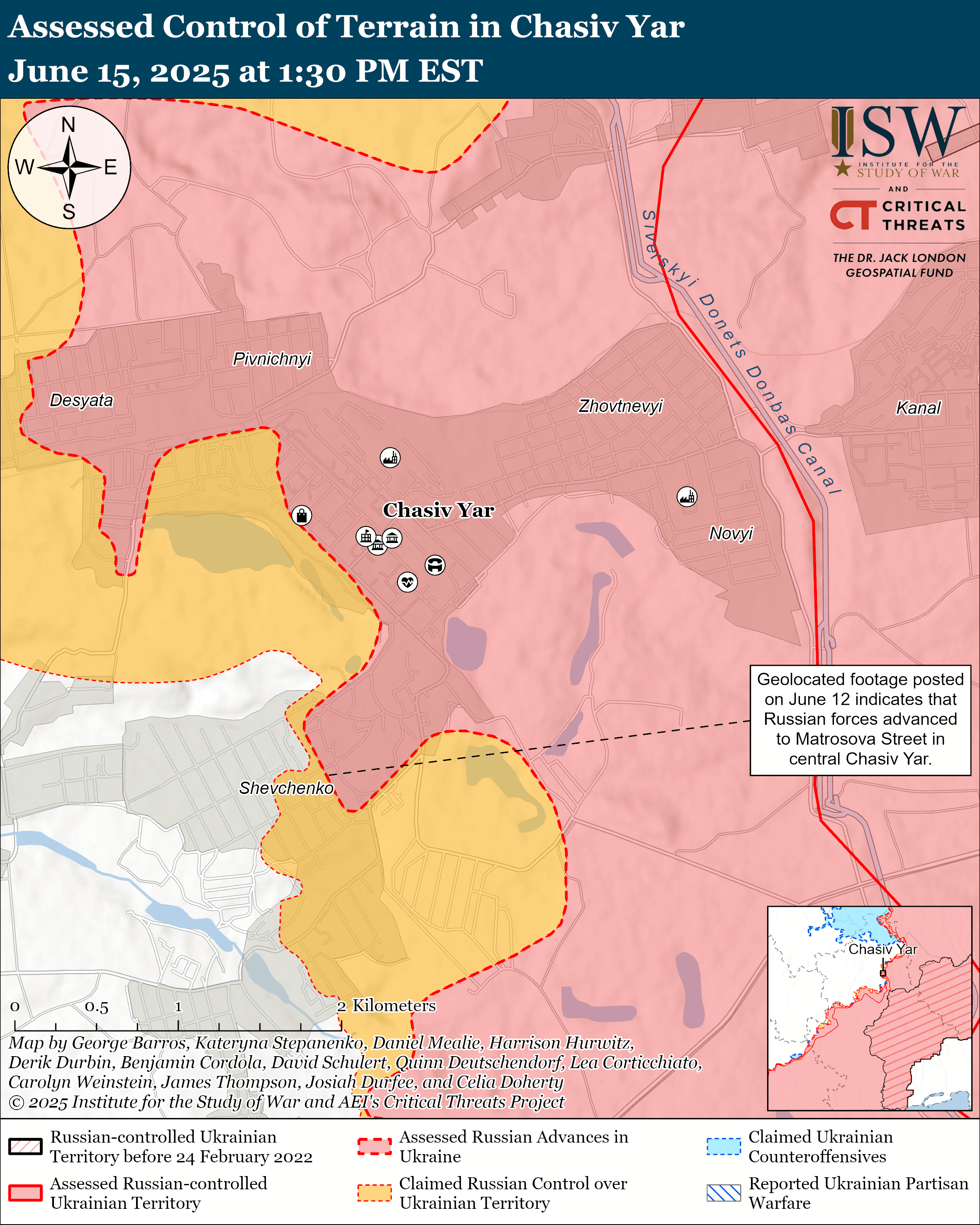 Russian forces continued offensive operations in Chasiv Yar itself; south of Chasiv Yar near Bila Hora and Stupochky and toward Predtechyne; and southeast of Chasiv Yar near Kurdyumivka on June 14 and 15.[38]