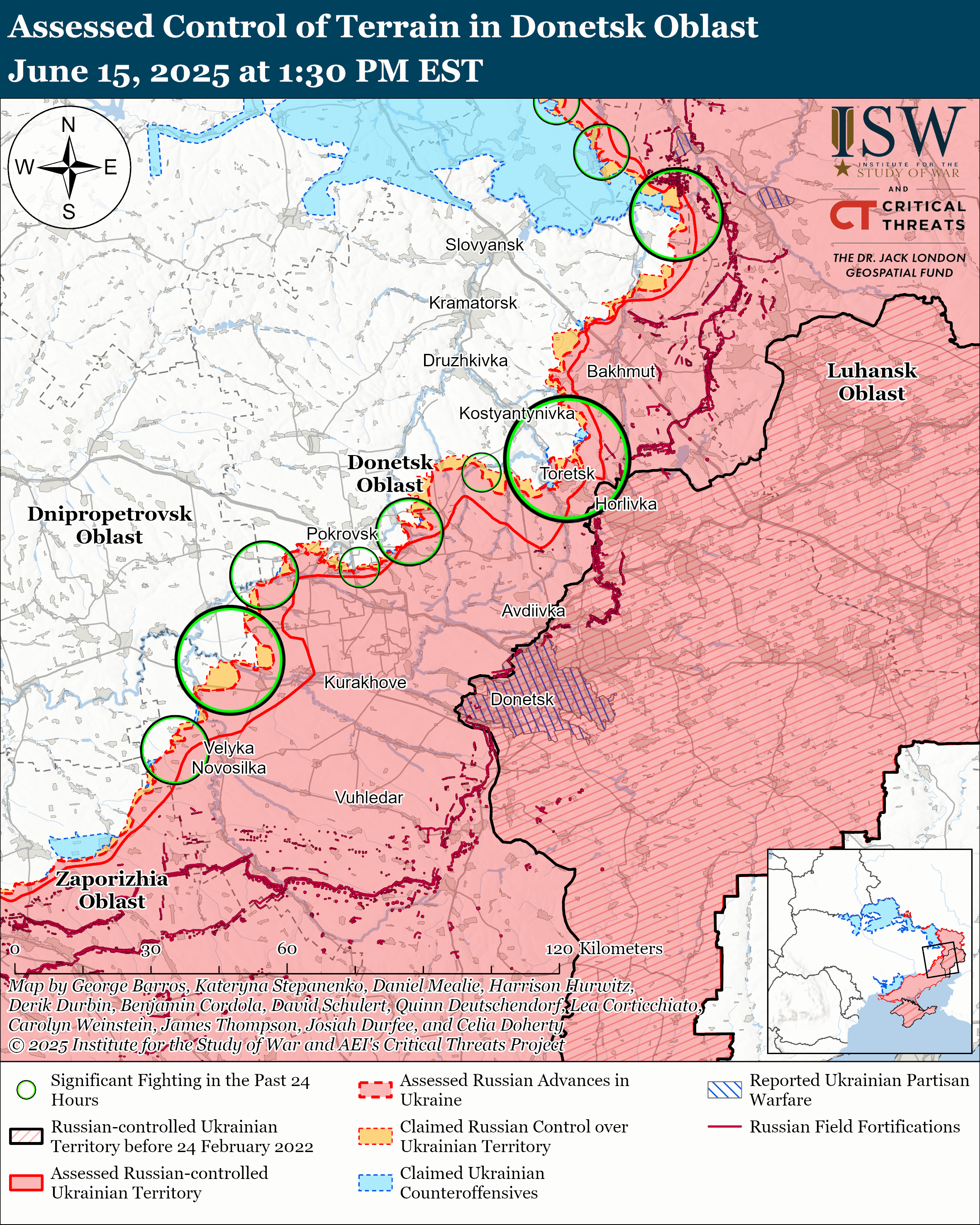 Russian forces attacked toward Novopavlivka itself; northeast of Novopavlivka near Novoserhiivka and Muravka; east of Novopavlivka near Kotlyarivka; southeast of Novopavlivka near Oleksiivka, Novoukrainka, Rozlyv, Kostyantynopil, Odradne, Bahatyr, and Horikhove; south of Novopavlivka toward Zaporizhzhia and Dachne; and southwest of Novopavlivka toward Myrne on June 14 and 15.[47]