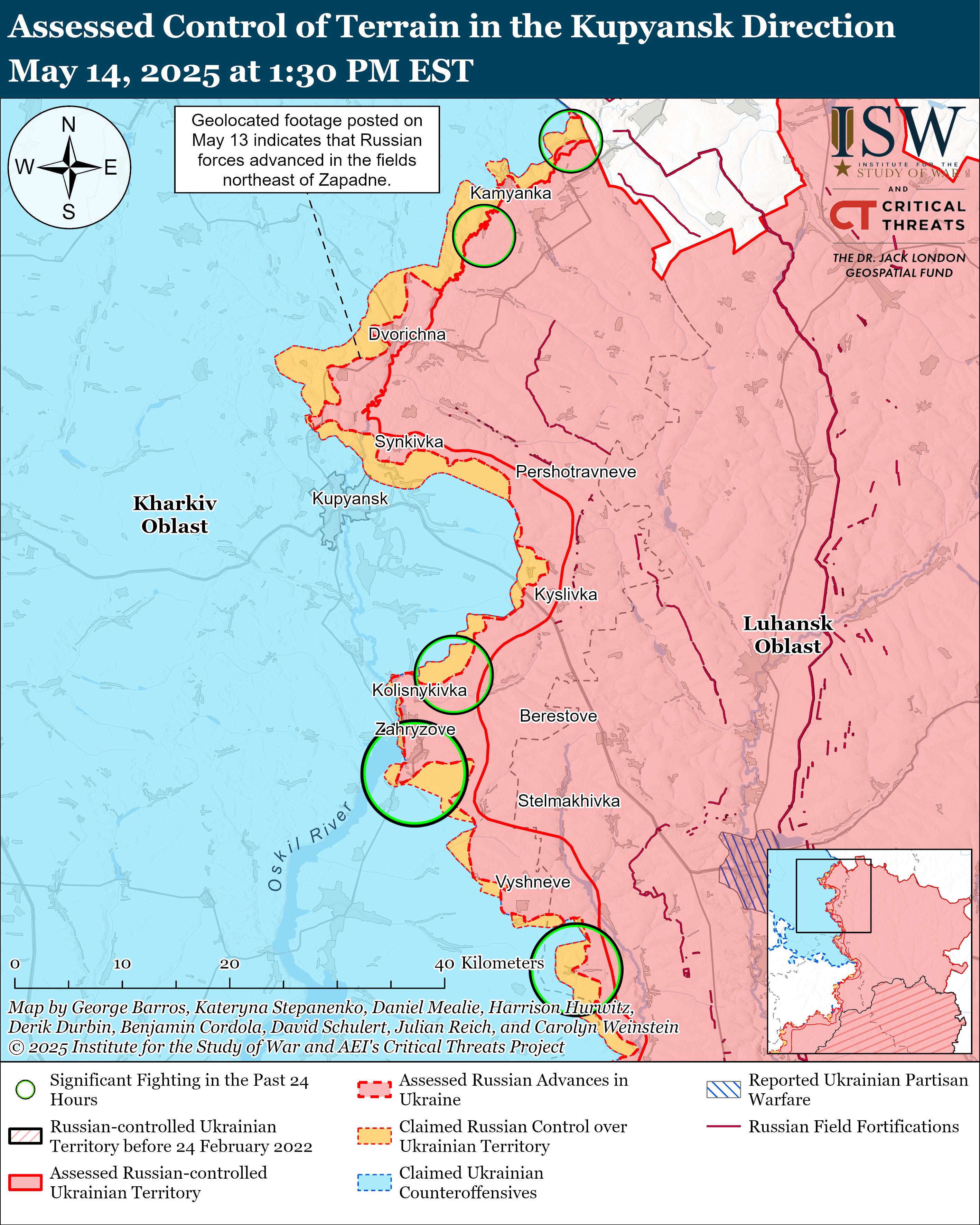 Assessed Russian advances: Geolocated footage published on May 13 indicates that Russian forces recently advanced northeast of Zapadne (north of Kupyansk).[21]