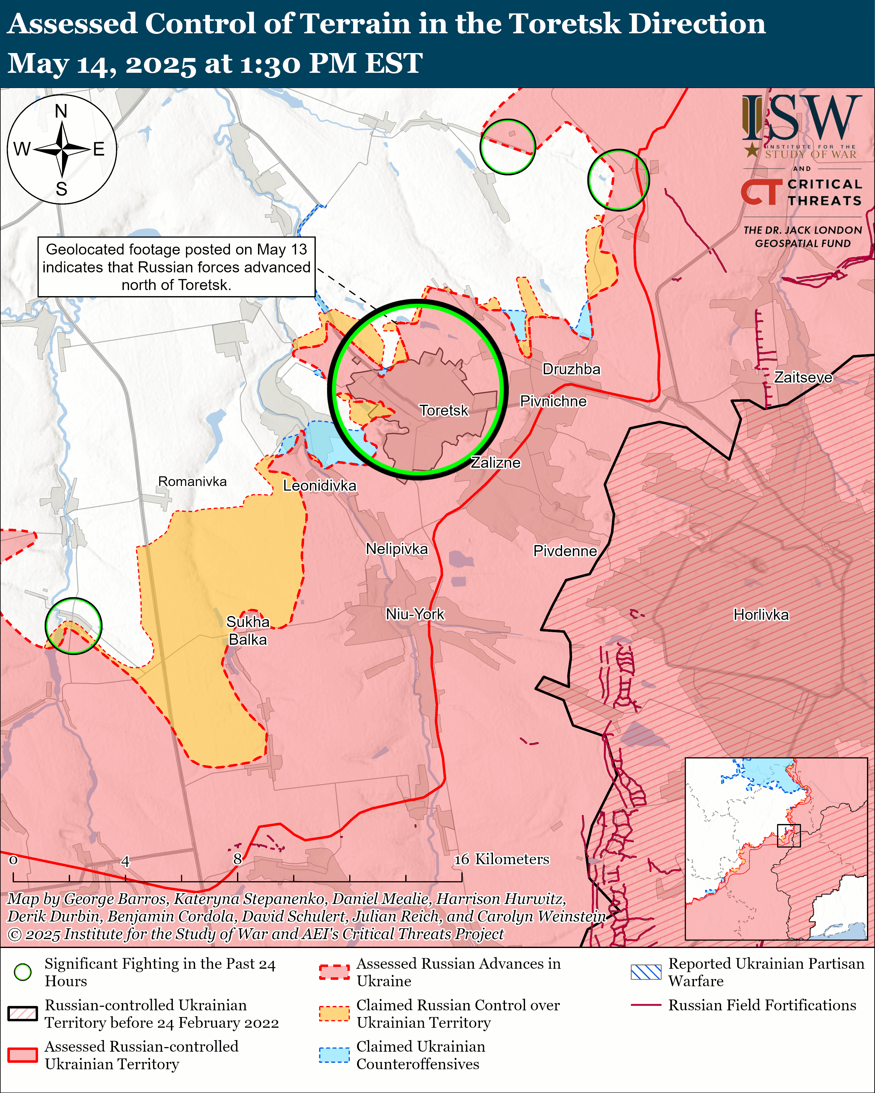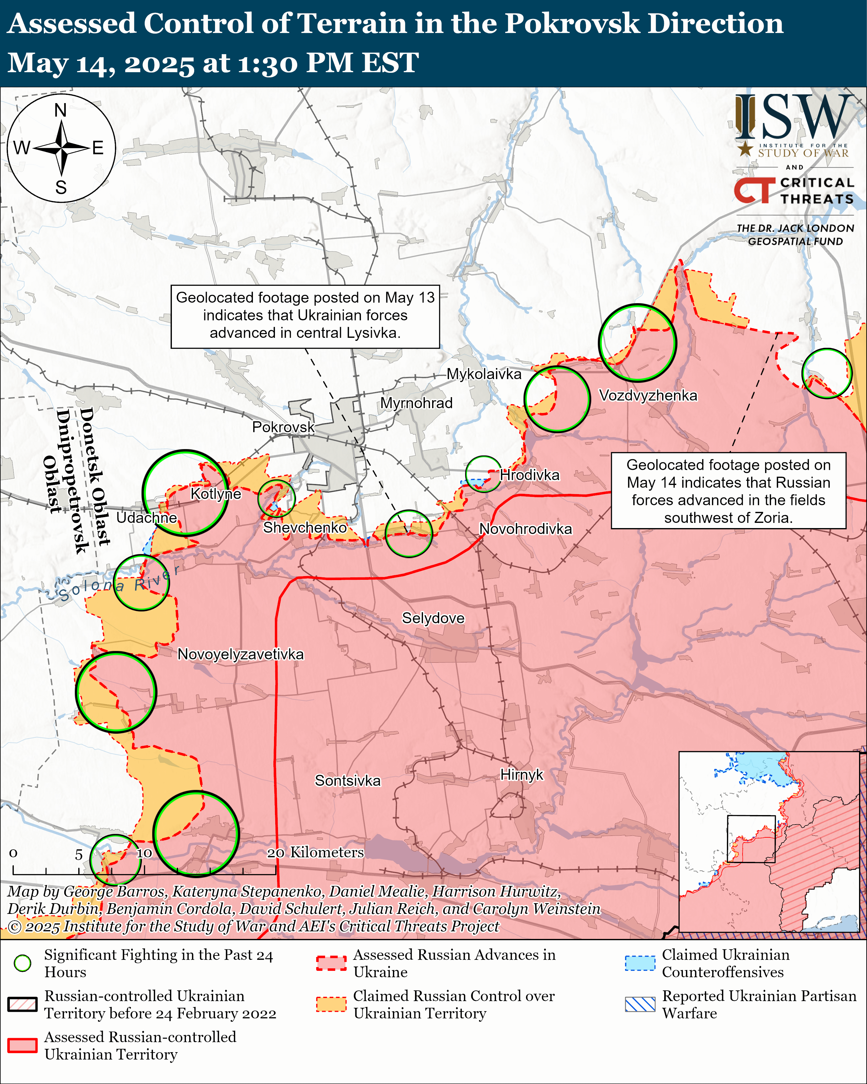 Russian forces attacked east of Pokrovsk near Promin, Malynivka, Myrne, Myrolyubivka, and Novotoretske and toward Mykolaivka; southeast of Pokrovsk near Lysivka; and southwest of Pokrovsk near Zvirove, Kotlyne, and Udachne on May 13 and 14.[46]