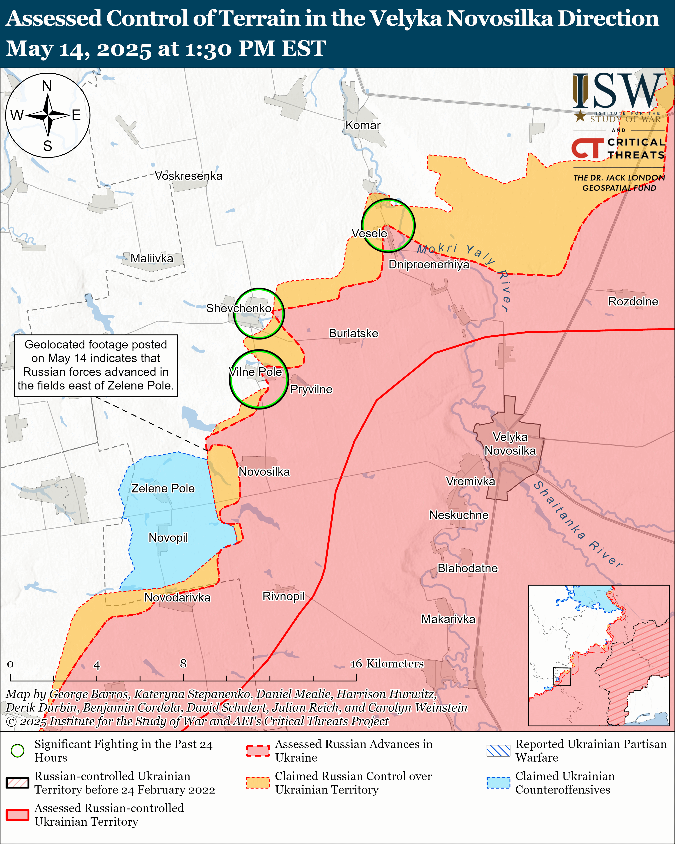 Russian forces continued attacking north of Velyka Novosilka near Skudne; northwest of Velyka Novosilka near Vesele, Komar, Vilne Pole, Pryvilne, and Shevchenko; west of Velyka Novosilka near Novosilka and Zelene Pole; and southwest of Velyka Novosilka near Novopil and Rivnopil on May 13 and 14.[59]