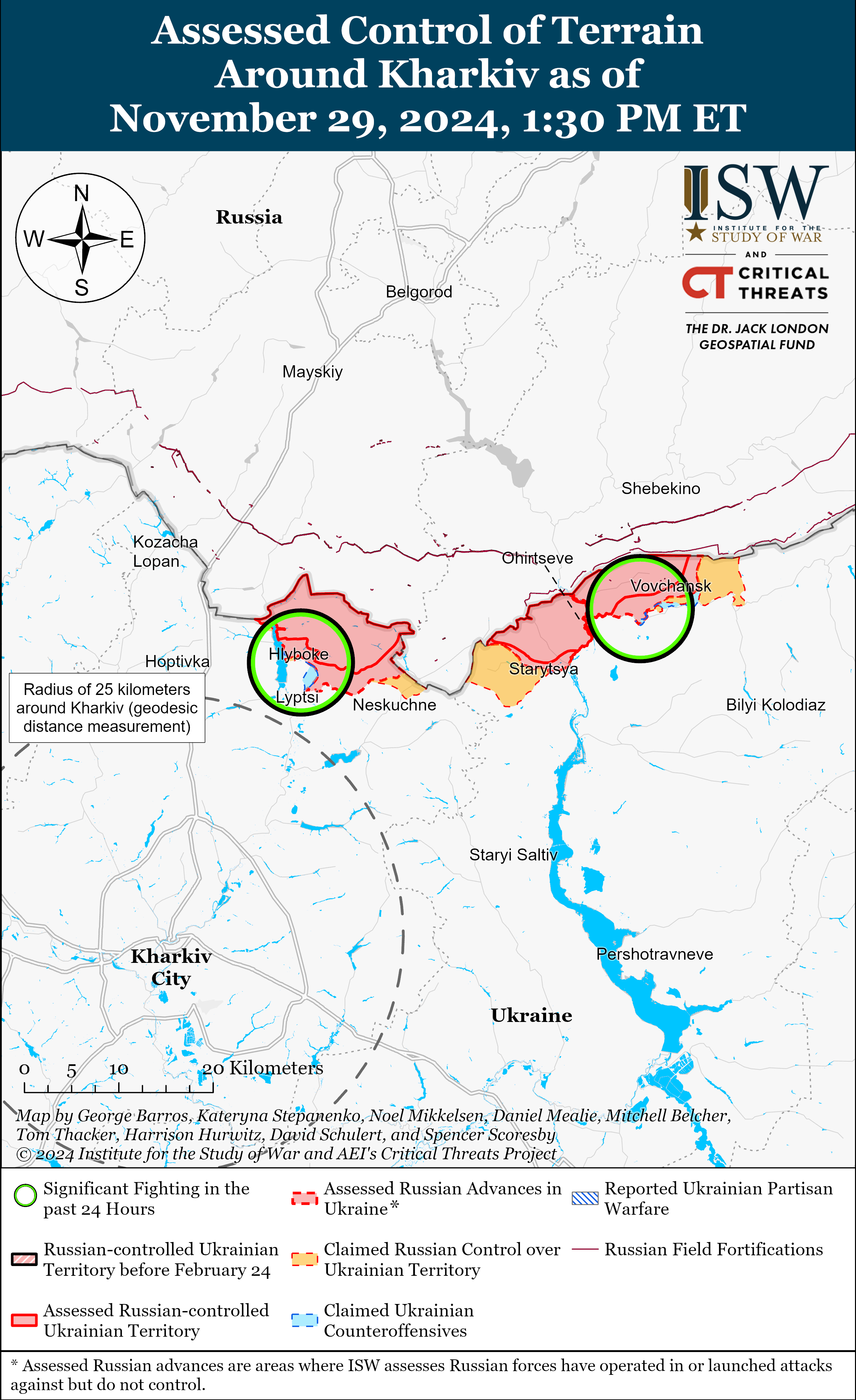 Russian forces continued assaults near Hlyboke (north of Kharkiv City), Vovchansk, (northeast of Kharkiv City), and Tykhe (east of Vovchansk) on November 27, 28, and 29 but did not make any confirmed advances.[53] Russian milbloggers claimed on November 28 and 29 that Russian forces made marginal advances in Vovchansk amid battles in urban areas; that fighting continues near Lyptsi (north of Kharkiv City); and that Russian forces operating along the Kozacha Lopan-Slatyne line (north of Kharkiv City) have become more active in the past two weeks (since mid-November 2024).[54] ISW has not observed confirmation of Russian gains in these areas. ISW has reported an increase in Russian cross-border raids in the Kozacha Lopan direction over the past week, however.[55] Ukrainian military sources reported on November 28 that Ukrainian drone operators repelled a Russian reinforced platoon-sized mechanized assault involving three tracked infantry fighting vehicles and one tank in the Kharkiv direction on an unspecified date.[56] The spokesperson of a Ukrainian brigade and the commander of a Ukrainian drone platoon both operating in the Kharkiv direction reported on November 29 that Ukrainian forces are using drones to control the airspace in northern Kharkiv Oblast, push Russian forces away from Kharkiv City towards the international border with Russia, have largely stopped Russian forces from using armored equipment, and have forced Russian soldiers to move on foot and conduct infantry assaults in northern Kharkiv Oblast.[57]