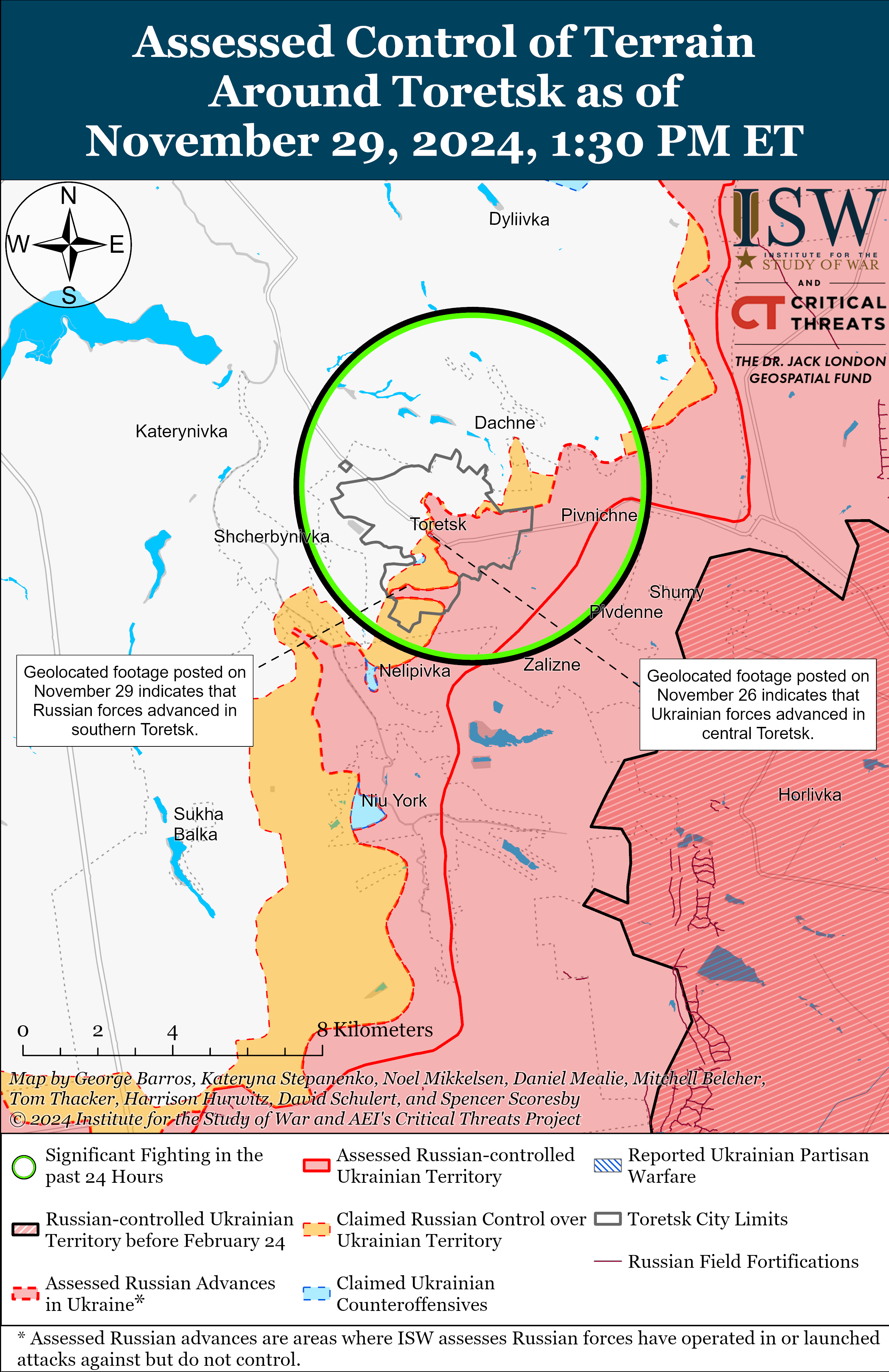 Russian forces recently advanced in southern Toretsk amid continued offensive operations in the Toretsk direction on November 27, 28, and 29. Geolocated footage published on November 29 indicates that Russian forces recently advanced northward along Hinky Street in southern Toretsk.[71] Russian milbloggers claimed on November 28 and 29 that Russian forces recently advanced 250 meters deep in southern Nelipivka (south of Toretsk), advanced 1.2 kilometers wide by 650 meters deep in a forested area south of Toretsk, and advanced 300 meters within the western portion of Zabalka Microraion, southern Toretsk.[72] Ukrainian Luhansk Group of Forces Spokesperson Major Anastasiya Bobovnikova reported on November 28 that the situation in Toretsk remains very difficult due to Russian air and artillery strikes and intense close quarters urban combat.[73] Bobovnikova reported on November 27 that Russian forces are conducting fewer airstrikes against Ukrainian positions in Toretsk because of poor weather but continue to use drones and conduct ground assaults using poorly trained and equipped contract military personnel.[74] The Ukrainian General Staff reported on November 28 and 29 that Russian forces continued ground assaults near Toretsk and northeast of Toretsk near Dyliivka and Druzhba.[75]