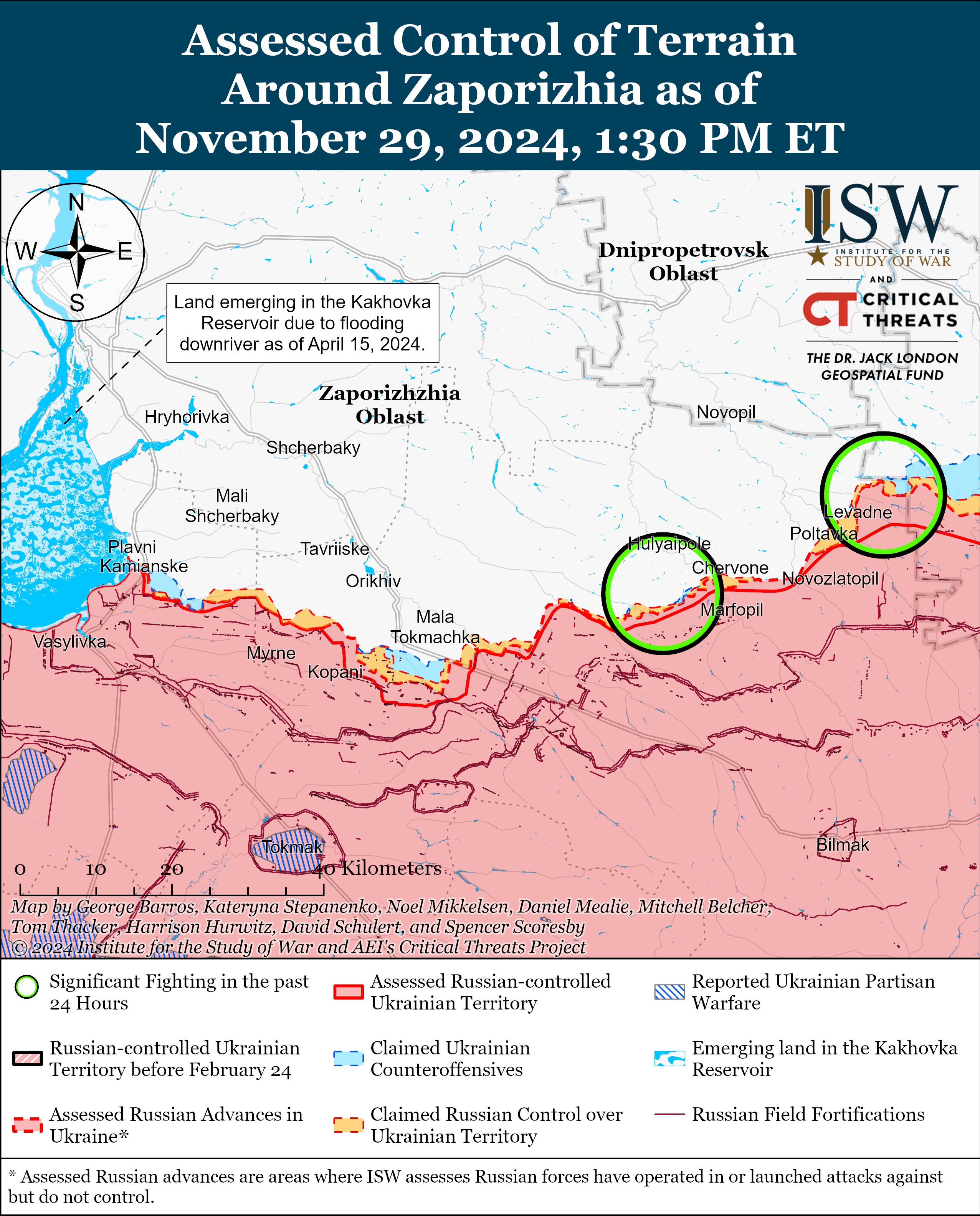 Russian forces recently seized Rozdolne (northeast of Velyka Novosilka) amid continued offensive operations in the Donetsk-Zaporizhia Oblast border area on November 28 and 29. Geolocated imagery published on November 29 indicates that elements of the Russian 37th Motorized Rifle Brigade (36th CAA, EMD) and 40th Naval Infantry Brigade (Pacific Fleet, EMD) recently raised a flag over central Rozdolne and seized the settlement.[93] Russian milbloggers claimed that Russian forces also advanced along the Shaytanka River west of Novodonetske (southwest of Velyka Novosilka) towards Blahodatne (south of Velyka Novosilka) and from Rivnopil (southwest of Velyka Novosilka) towards Makariivka (south of Velyka Novosilka).[94] ISW has not observed visual confirmation of these claims, however. The spokesperson for a Ukrainian brigade operating in the Donetsk-Zaporizhia Oblast border area reported on November 28 that Russian forces have two main objectives in this area: interdict Ukrainian logistics routes between Velyka Novosilka and Kurakhove and seize Velyka Novosilka itself.[95] The spokesperson noted that the situation for Ukrainian forces is more difficult east of Velyka Novosilka where Russian forces recently advanced but stated that worsening weather conditions are complicating Russian drone usage and forcing Russia to rely on foot mobile infantry to advance in the area. An officer in another Ukrainian brigade operating near Velyka Novosilka reported on November 29 that Russian forces are using armored vehicles, motorcycles, all-terrain vehicles (ATVs or “buggies“), and air support to advance in the area, however.[96] Russian forces continued assaults northeast of Velyka Novosilka near Rozdolne; on the northeastern and eastern outskirts of Velyka Novosilka; and southwest of Velyka Novosilka near Rivnopil, Novodarivka, and Novopil on November 27, 28, and 29.[97] Elements of the Russian 5th Tank Brigade (36th CAA, EMD) are reportedly operating near Velyka Novosilka and Rozdolne and drone operators of a tank battalion of the 60th Motorized Rifle Brigade (5th CAA, EMD) are reportedly operating near Makarivka.[98]