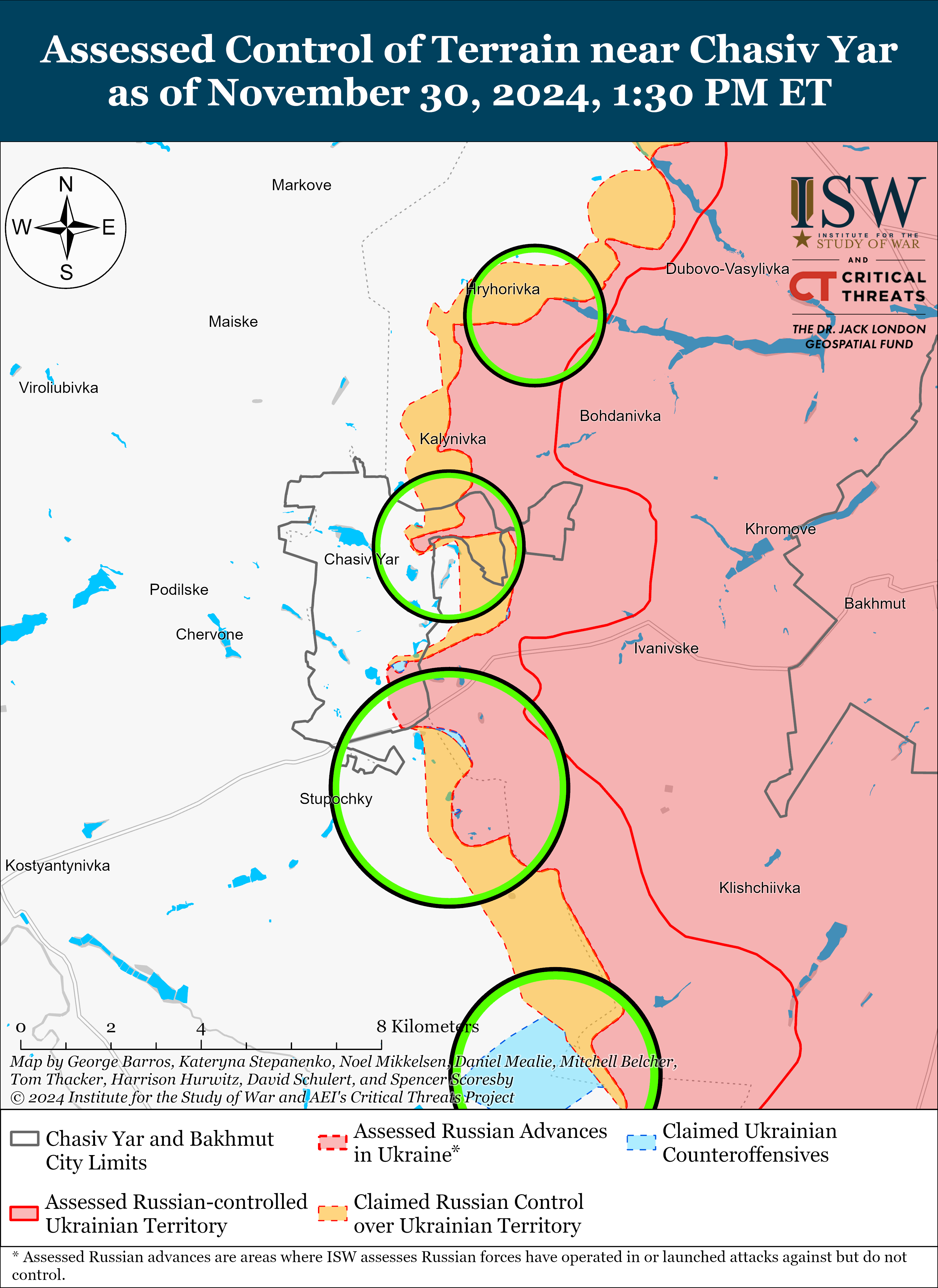 Russian forces continued offensive operations near Chasiv Yar on November 30 but did not make confirmed advances in the area. Russian milbloggers claimed that Russian forces are advancing near the southern outskirts of the refractory plant in Chasiv Yar and south of Chasiv Yar.[22] A Kremlin-affiliated Russian milblogger claimed that Ukrainian forces maintain defensive positions in Novyi Microraion in eastern Chasiv Yar, but that Russian forces recently seized a position in northern Novyi Microraion that could complicate Ukraine’s defense in the area.[23] The milblogger claimed that the Block-9 mine (south of Chasiv Yar) is a contested “gray” zone and that Ukrainian forces are counterattacking near the mine. The representative of a Ukrainian brigade operating near Chasiv Yar reported that Russian forces are trying to bypass Ukrainian positions in the town and are trying to flank Chasiv Yar from the north and south.[24] The representative stated that Russian forces have not established enduring positions on the west bank of the Siversky Donets Donbas Canal within Chasiv Yar, but that Russian forces are penetrating Ukraine’s defensive lines in small groups. The representative noted that Ukrainian drone operators are striking Russian personnel concentrations in the area. Russian forces continued assaults north of Chasiv Yar near Kalynove; within Chasiv Yar itself; and south of Chasiv Yar near Predtechyne, Stupochky, and in the direction of Bila Hora on November 29 and 30.[25]