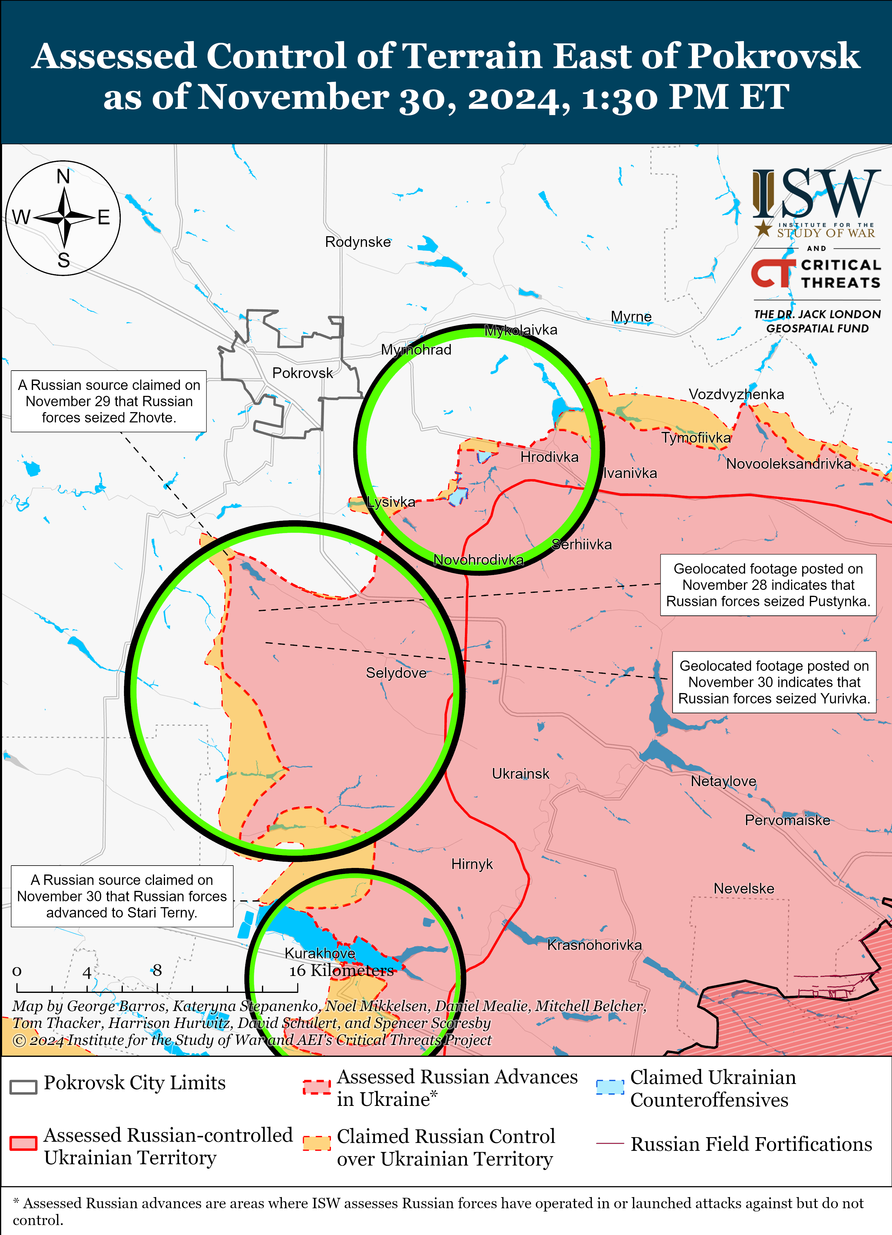 Russian forces recently advanced south of Pokrovsk amid continued offensive operations in the direction on November 30. Geolocated footage published on November 30 indicates that Russian forces recently advanced along the E50 highway northeast of Hryhorivka (south of Pokrovsk), seized the remainder of Yurivka (southwest of Hryhorivka), and advanced west of Pushkine (further southwest of Yurivka).[28] Russian milbloggers claimed on November 29 and 30 that Russian forces operating south of Pokrovsk advanced towards Ukrainka, to the outskirts of Novopustynaka, and also seized Zhovte, but ISW has not observed confirmation of these claims.[29] The Ukrainian General Staff reported that fighting continued east of Pokrovsk near Myrolyubivka, Myrnohrad, and Promin; southeast of Pokrovsk near Lysivka, Krasnyi Yar, and Krutyi Yar; and south of Pokrovsk near Novyi Trud, Pustynka, Dachenske, Chumatske, and Zhovte on November 29 and 30.[30]