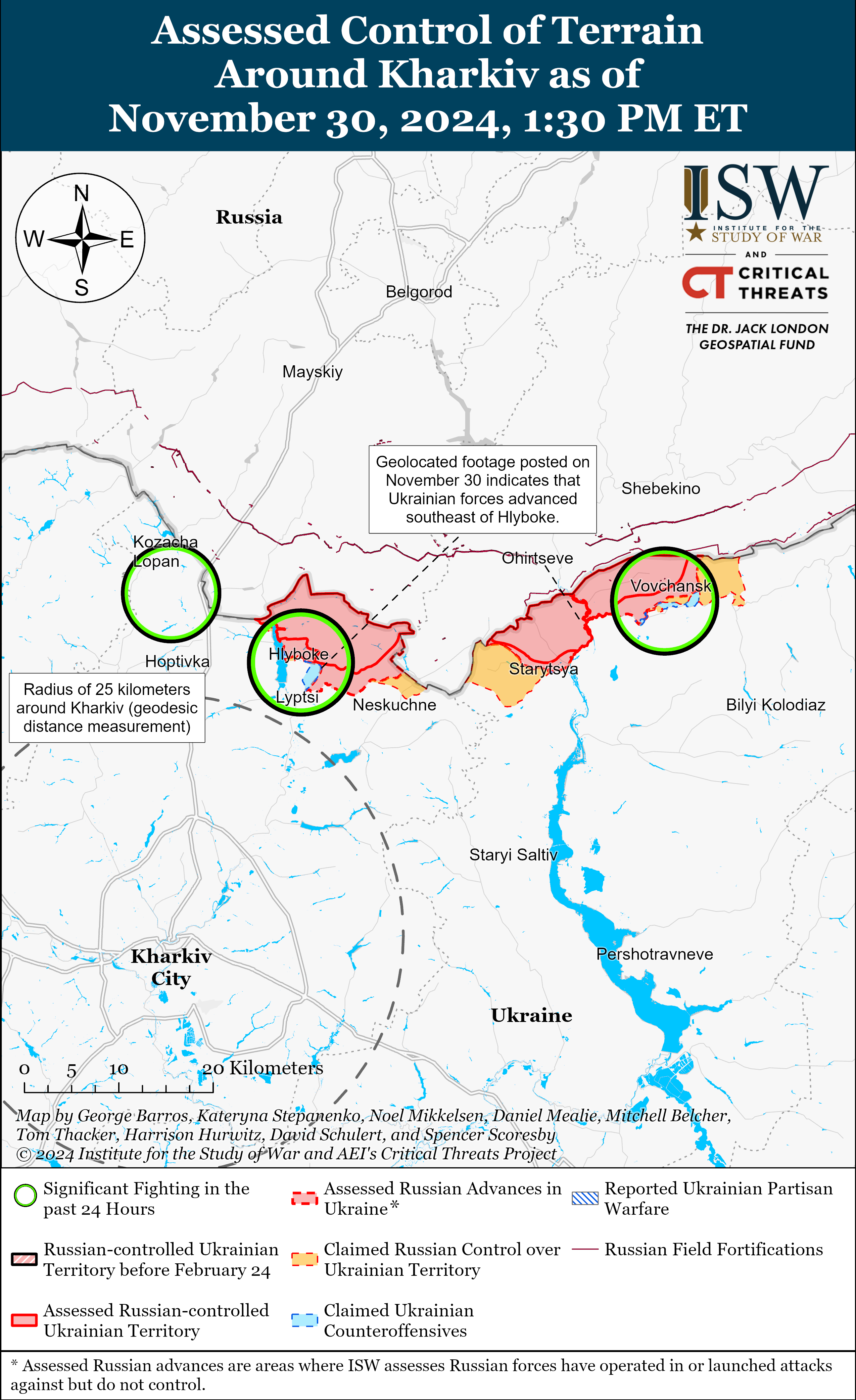Ukrainian forces recently regained lost positions north of Kharkiv City amid continued Russian offensive operations in the Kharkiv direction on November 30. Geolocated footage published on November 30 shows Russian forces striking Ukrainian forces in a forested area southeast of Hlyboke (north of Kharkiv City), indicating that Ukrainian forces recently regained tactical positions in the area.[13] Russian milbloggers claimed that Ukrainian forces unsuccessfully counterattacked with armored vehicle support between Lyptsi (north of Kharkiv City) and Hlyboke.[14] A Russian milblogger claimed that Russian drone strikes are preventing Ukrainian forces from crossing the Vovcha River in Vovchansk (northeast of Kharkiv City).[15] Russian forces continued assaults along the international border northwest of Kharkiv City near Kudiivka, Hoptivka, and Kozacha Lopan; north of Kharkiv City near Hlyboke; and northeast of Kharkiv City near Vovchansk and Tykhe on November 29 and 30.[16]