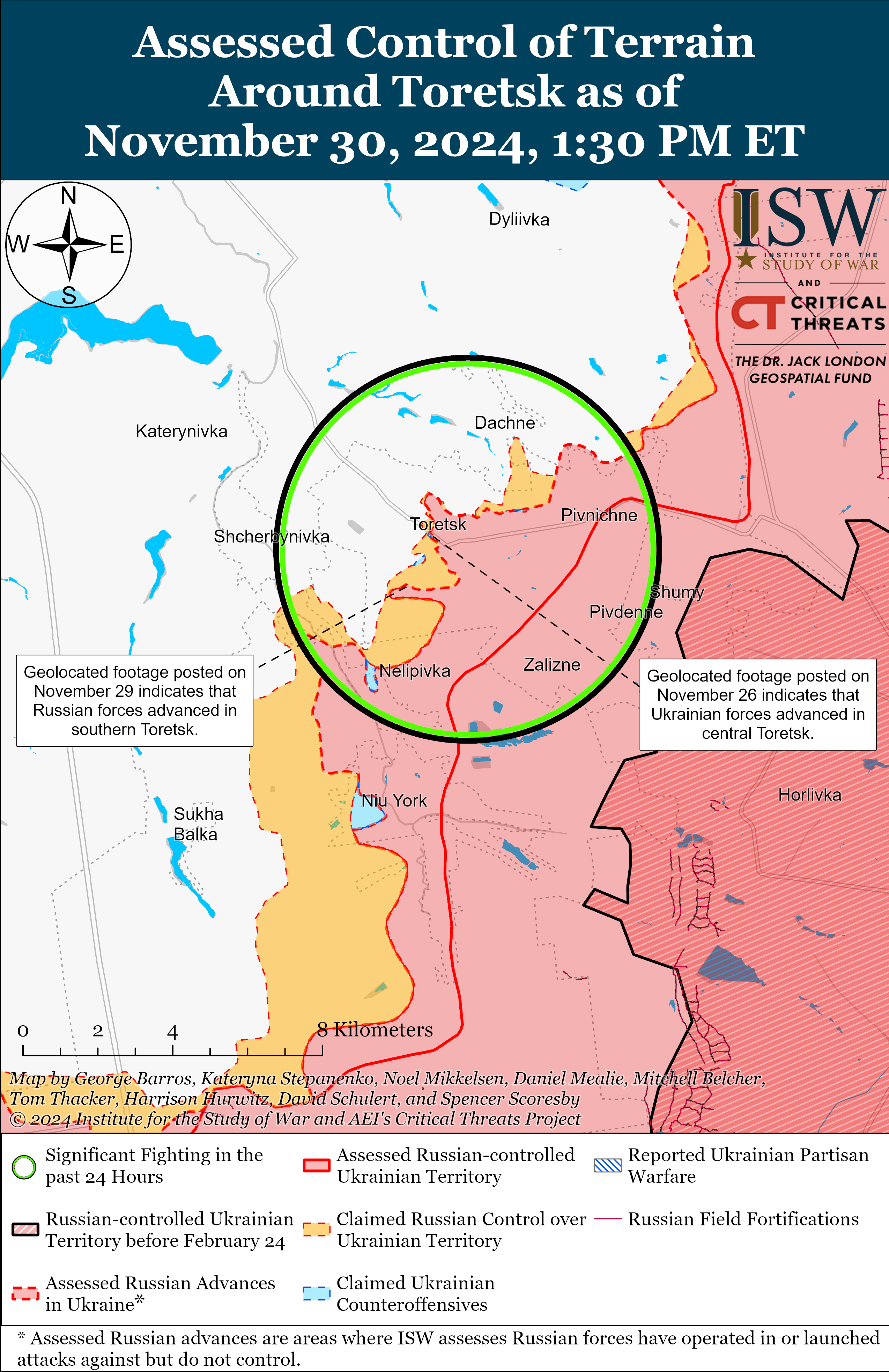 Russian forces continued offensive operations in the Toretsk direction on November 30 but did not make confirmed advances. The commander of a Ukrainian brigade operating in the Toretsk direction reported that Russian infantry are attacking only on foot in some areas of the Toretsk direction and are using vehicles to support assaults in other areas of this direction.[26] The commander stated that the Russian military command recently deployed more forces to the Toretsk area in order to penetrate Ukraine’s defensive lines. Russian forces continued assaults north of Toretsk near Druzhba, near Toretsk itself, and south of Toretsk near Nelipivka and Shcherbynivka on November 29 and 30.[27]