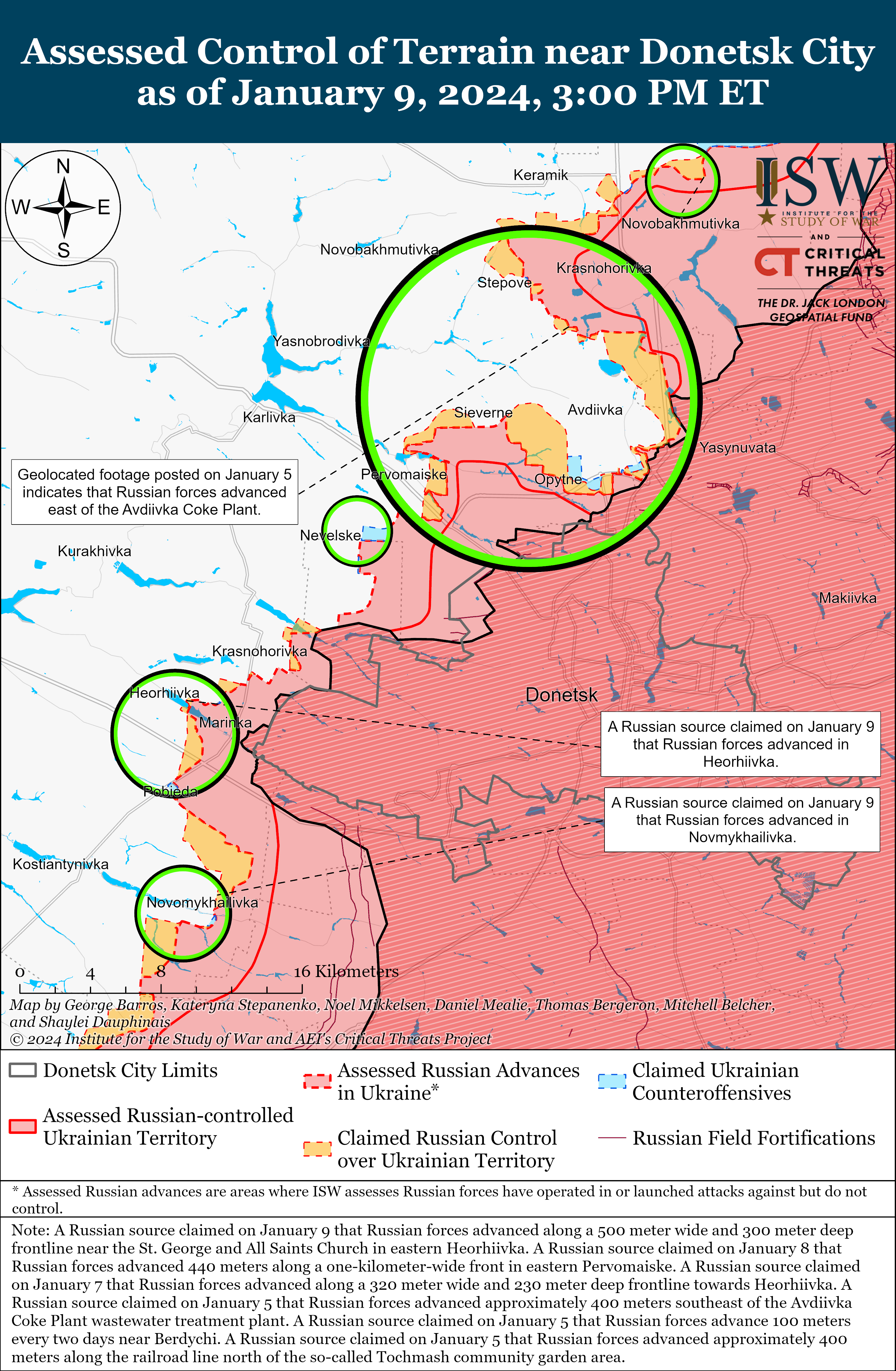 Russian forces recently advanced southwest of Donetsk City, and both Russian and Ukrainian forces reportedly made additional gains west and southwest of Donetsk City on January 9. Geolocated footage published on January 9 indicates that Russian forces advanced in southern Novomykhailivka (southwest of Donetsk City) on December 26.[58] Russian milbloggers claimed on January 9 that Russian forces made marginal gains on the southeastern outskirts of Novomykhailivka and that Ukrainian forces counterattacked south of Novomykhailivka and pushed Russian forces out of unspecified positions in the area.[59] A Russian milblogger claimed that Russian forces captured the St. George and All Saints Church in Heorhiivka (west of Donetsk City) and advanced 500 meters in width and 300 meters in depth in the area.[60] Several Russian sources claimed that Russian forces advanced near Heorhiivka with select sources claiming that Russian forces reached the eastern outskirts of the settlement.[61] ISW has not observed visual confirmation of any of the claimed Russian advances near Heorhiivka or reported Ukrainian advances near Novomykahilivka. The Ukrainian General Staff reported that Ukrainian forces repelled at least 14 Russian assaults near Heorhiivka, Novomykhailivka, and Pobieda (southwest of Donetsk City).[62]