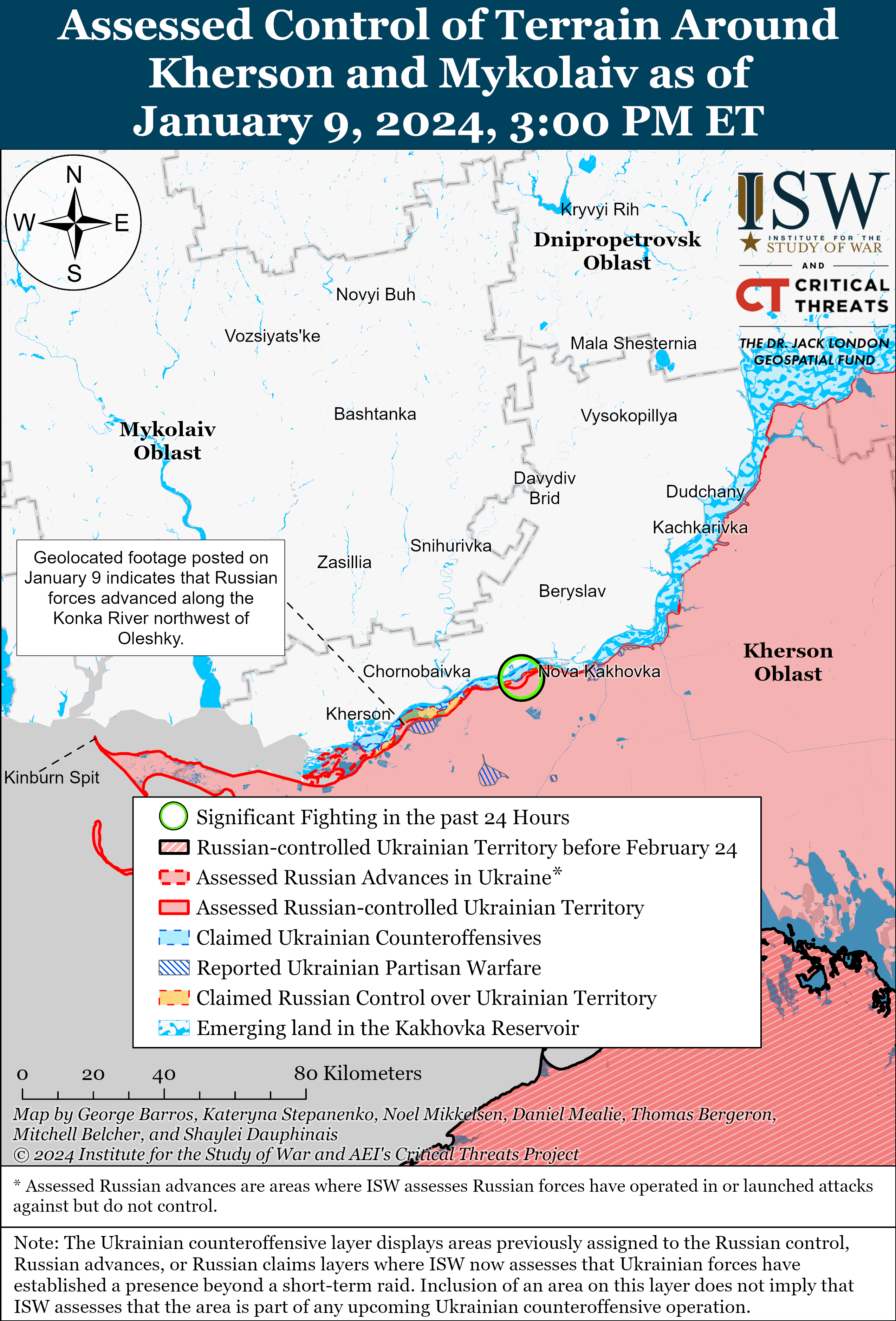 Geolocated footage posted on January 9 confirms that Russian forces hold positions along the Konka River northwest of Oleshky on the east bank of the Dnipro River.[70] Russian and Ukrainian sources also reported that positional engagements continued in and around Krynky, but there were no confirmed changes to the frontline on the east bank.[71]