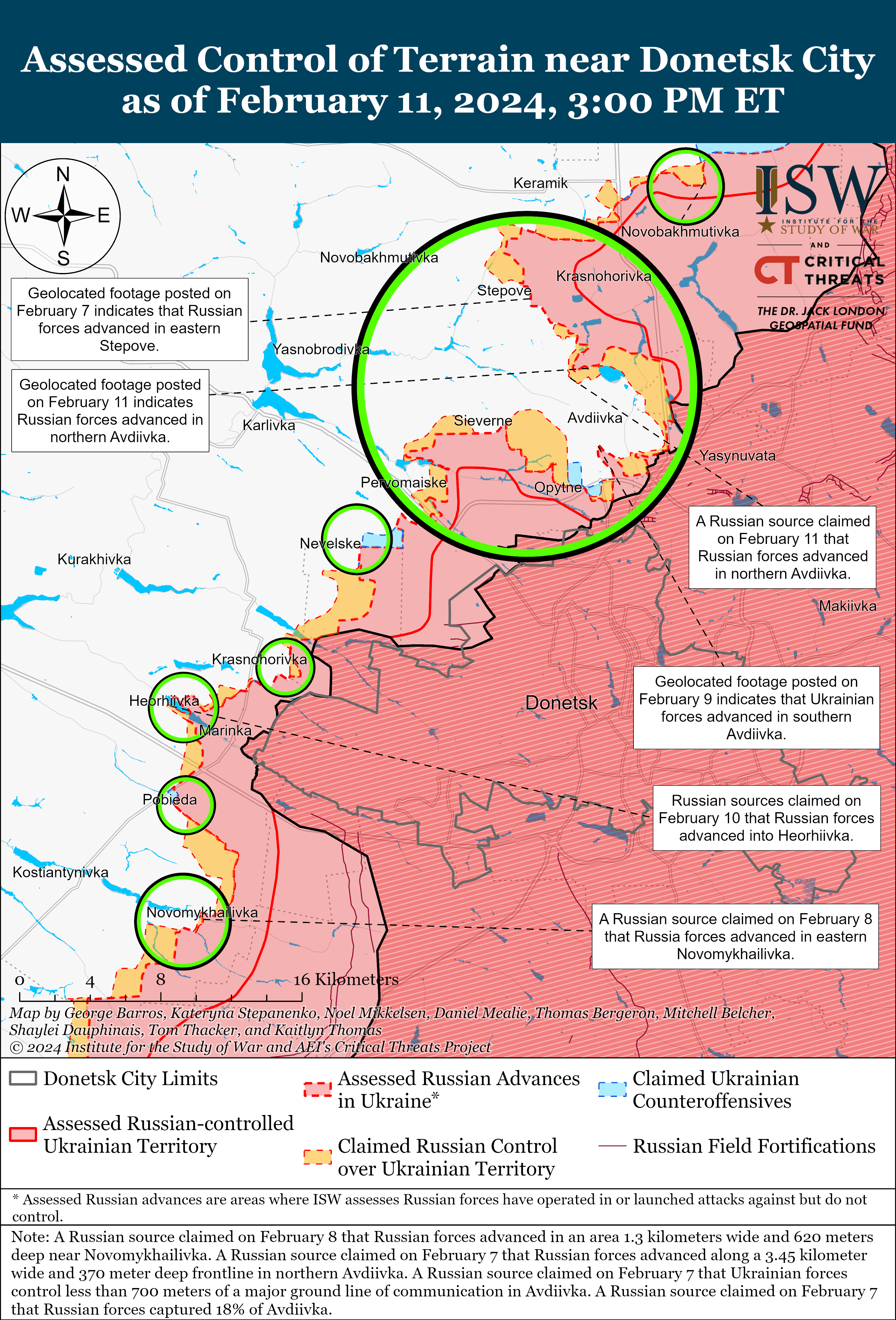Russian forces recently made confirmed advances near Avdiivka amid continued positional battles in the area on February 11. Geolocated footage published on February 11 indicates that Russian forces recently advanced along Zaliznychnyi Lane in northern Avdiivka and east of Nevelske (southwest of Avdiivka).[26] Russian milbloggers claimed that Russian forces advanced along Tymiryazyeva and Silhosptekhniky streets in northern Avdiivka and near Pervomaiske, although ISW has not observed visual evidence of these claims.[27] Positional engagements continued northwest of Avdiivka near Novokalynove and Novobakhmutivka; in Avdiivka itself; west of Avdiivka near Tonenke and Sieverne; and southwest of Avdiivka near Perovmaiske and Nevelske.[28] Russian sources claimed that Russian forces continue attempts to interdict Ukrainian forces’ alleged main ground line of communication (GLOC) into Avdiivka.[29] Ukrainian Tavriisk Group of Forces Commander Brigadier General Oleksandr Tarnavskyi stated that Russian forces are increasingly using groups of armored vehicles during infantry assaults in the Tavriisk direction (from Avdiivka through western Zaporizhia Oblast).[30]
