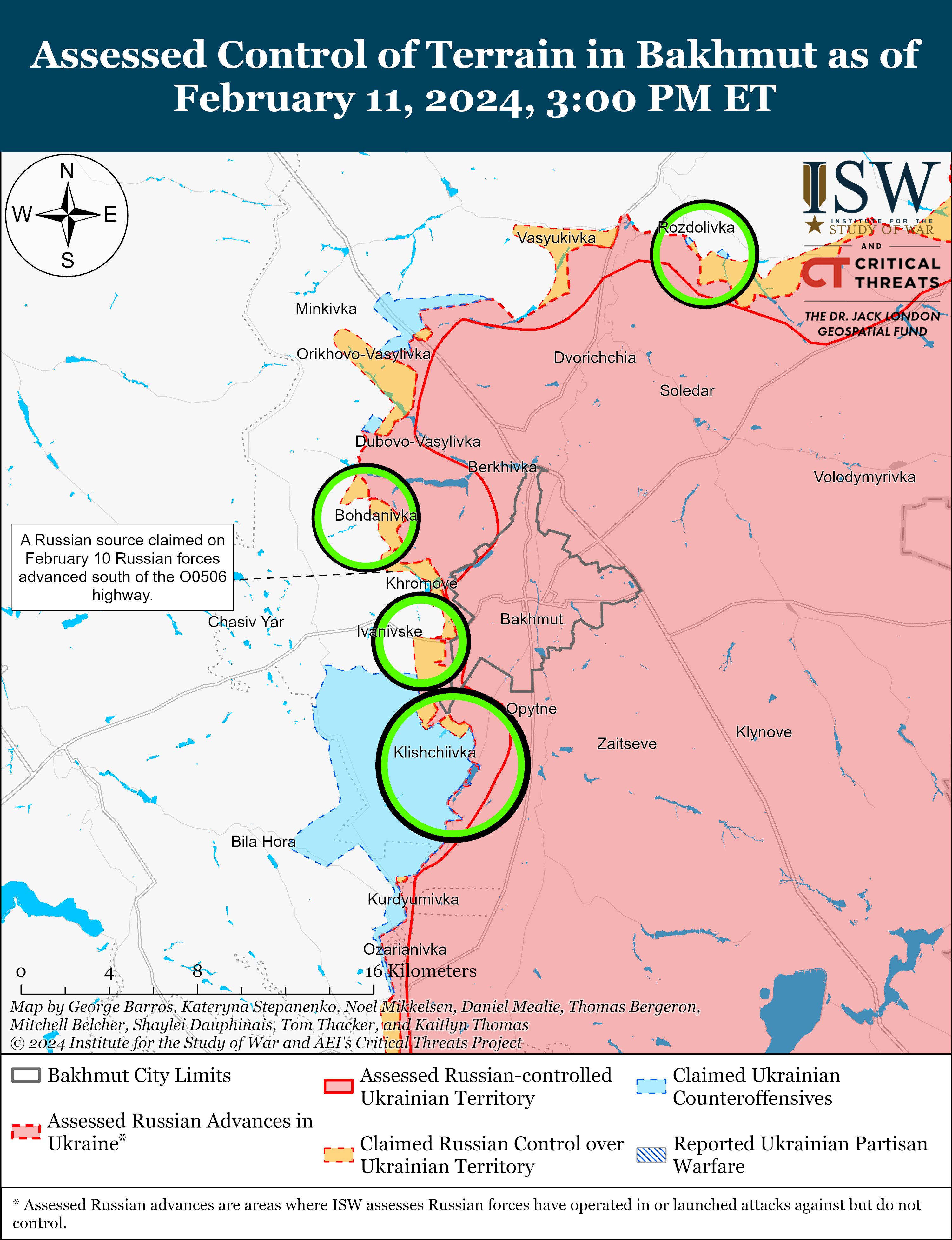 Russian forces reportedly advanced near Bakhmut amid continued positional engagements in the area on February 11. Russian milbloggers claimed that Russian forces advanced near Bohdanivka (northwest of Bakhmut) and are two kilometers away from Chasiv Yar (west of Bakhmut), although ISW has not observed visual evidence confirming these claims.[22] ISW currently assesses that Russian forces are about 2.3 kilometers from the eastern outskirts of Chasiv Yar.[23] Positional engagements continued near Bohdanivka; west of Bakhmut near Ivanivske; southwest of Bakhmut near Klishchiivka and Andriivka; and south of Bakhmut near Mayorske, Pivdenne, and Niu York.[24] Elements of the Russian 331st Airborne (VDV) Regiment (98th VDV Division) reportedly continue to operate in the direction of Chasiv Yar, and elements of the Russian 83rd Separate Guards VDV Brigade continue to operate near Klishchiivka and Andriivka.[25]