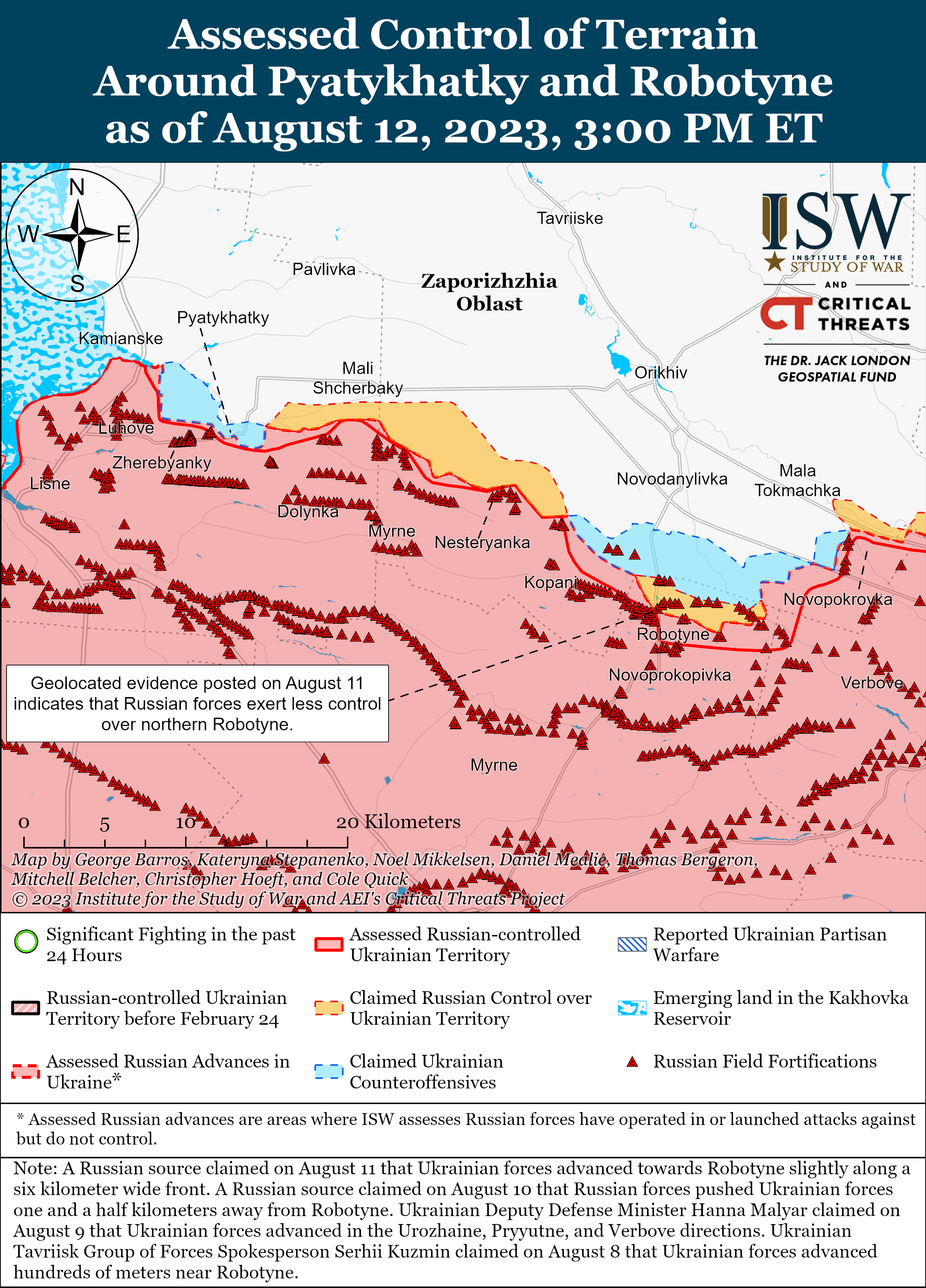 Ukrainian forces continued counteroffensive operations in western Zaporizhia Oblast and did not make any confirmed advances on August 12. The Ukrainian General Staff reported that Ukrainian forces continued offensive operations in the Melitopol (western Zaporizhia Oblast) direction.[44] The Russian MoD claimed that Russian forces repelled three Ukrainian attacks near Robotyne (10km south of Orikhiv).[45] A Russian milblogger claimed that Ukrainian infantry groups attacked Robotyne but did not specify the outcome of those attacks.[46] Another milblogger claimed that Ukrainian forces achieved partial success near the settlement.[47] Elements of a volunteer battalion from North Ossetia-Alania reportedly defending near Pyatykhatky (25km southwest of Orikhiv) and Zherebyanky (26km southwest of Orikhiv) claimed that there is active fighting in the area.[48] Another milblogger claimed that Ukrainian forces conducted unsuccessful attacks near Zherebyanky.[49]