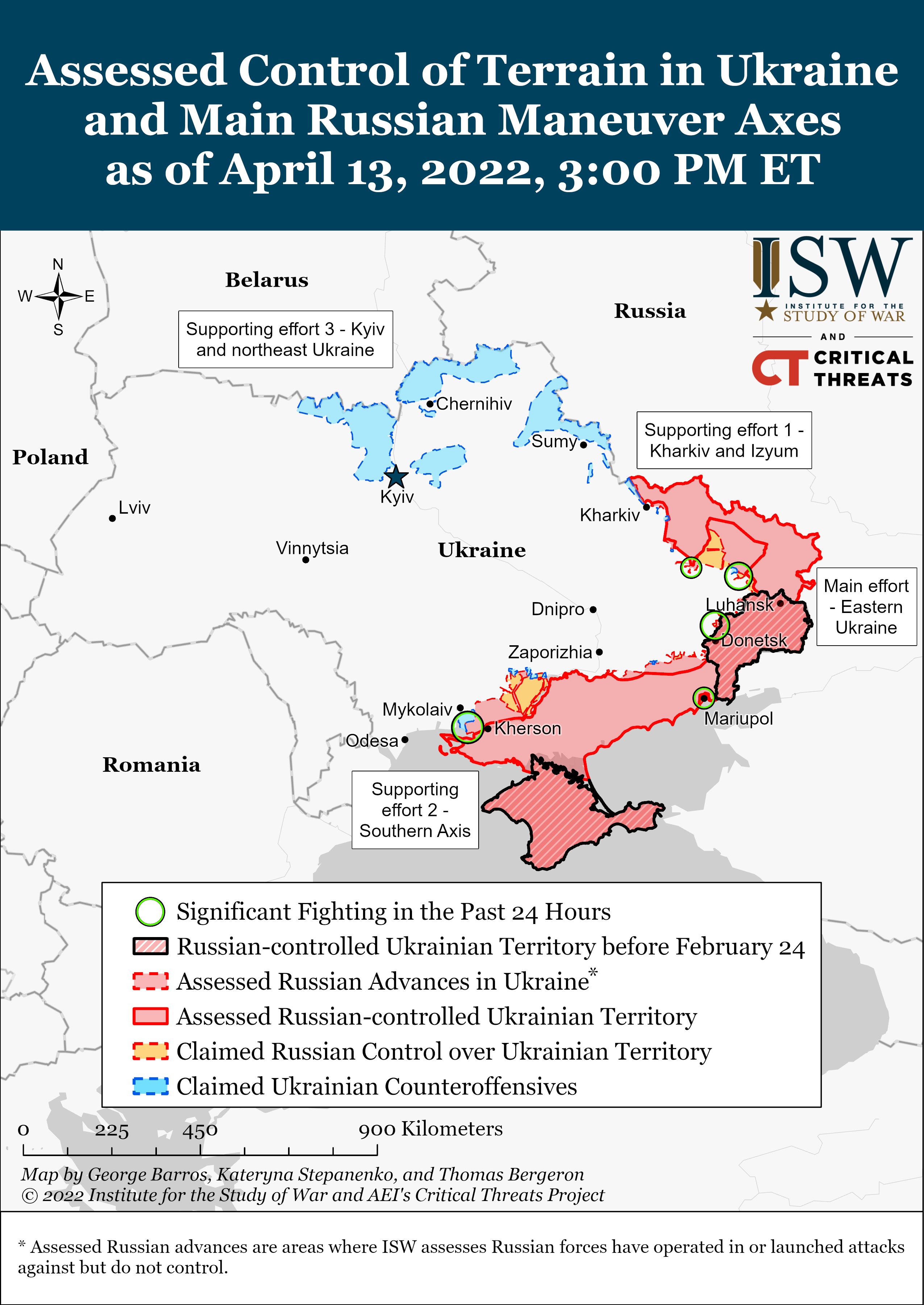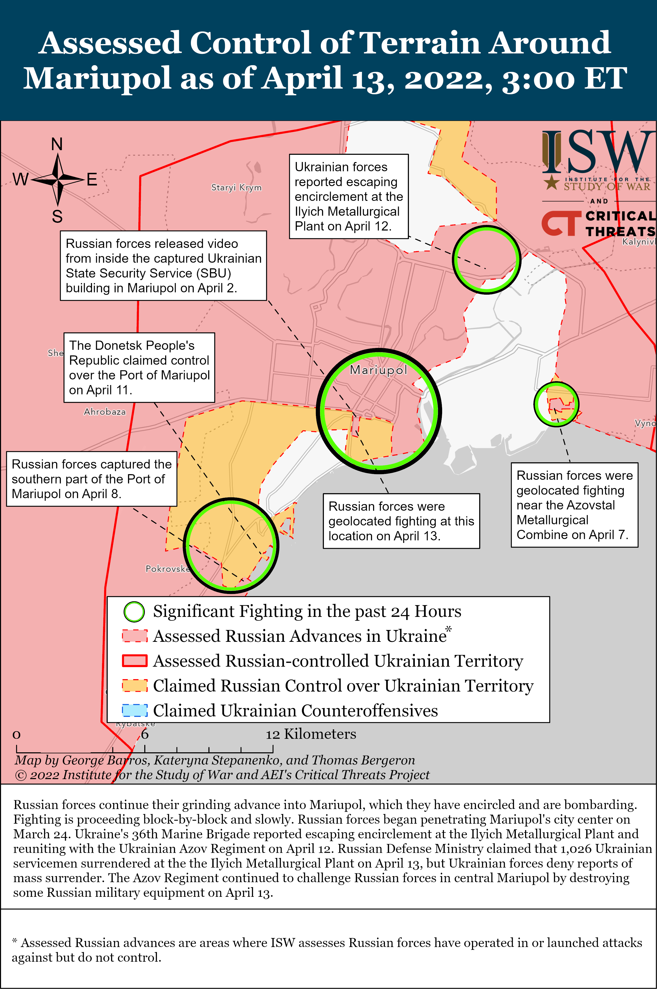 Russian claims of a mass Ukrainian surrender in Mariupol are likely false, but Russian forces forced Ukrainian troops to abandon the Ilyich metal plant in northern Mariupol on April 13, further constricting the two remaining pockets of Ukrainian defenders. Russian forces will likely capture Mariupol in the coming week. Russian forces continued to conduct small-scale limited offensive operations on both the Izyum and Severodonetsk axes and has not yet begun a broader offensive campaign.