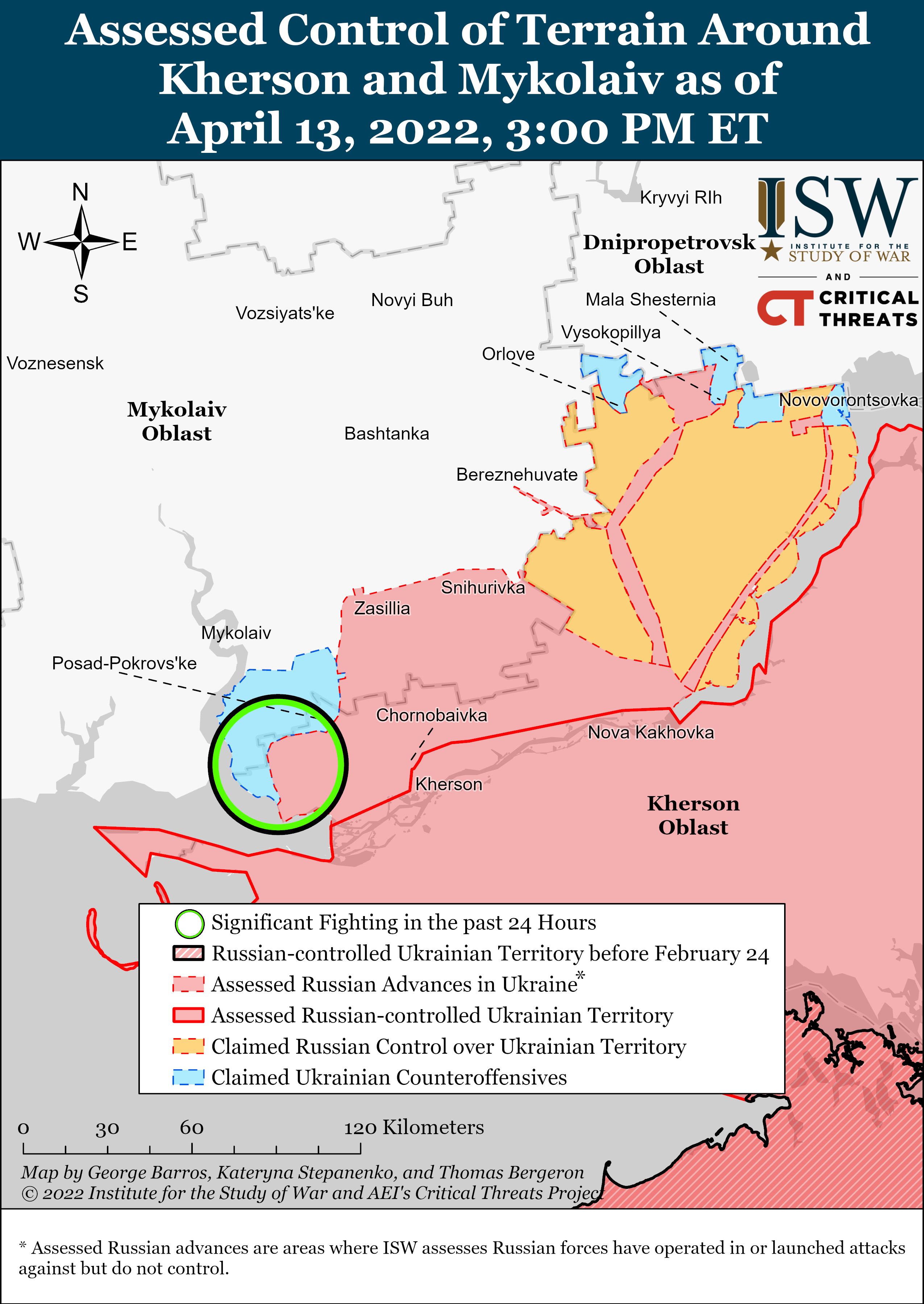 Russian forces conducted minor attacks in Kherson Oblast without success on April 13.[16] US intelligence sources stated on April 13 Russian forces have likely established two resupply bases in Crimea and southern Ukraine to resupply operations in Mariupol and Kherson.[17]