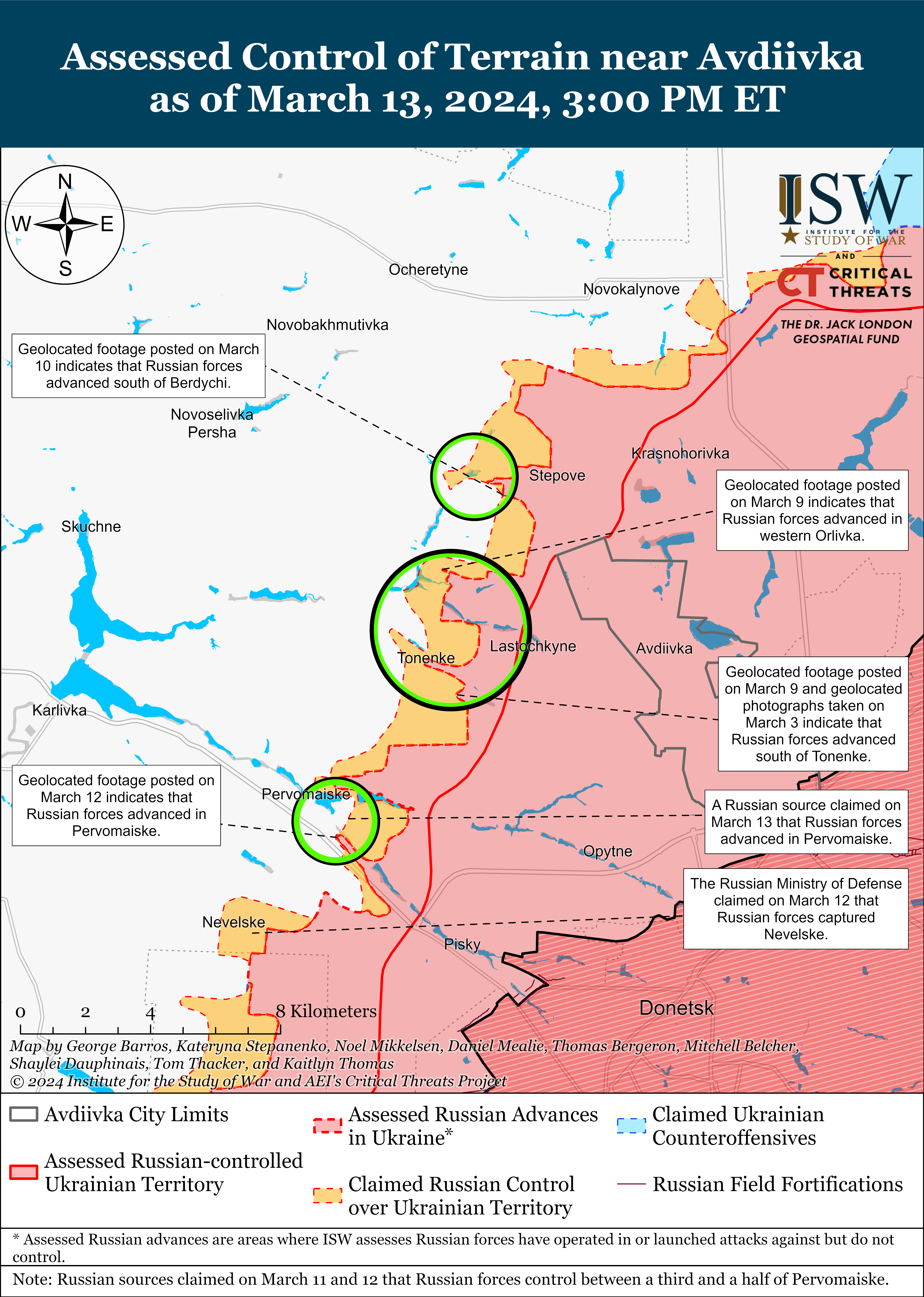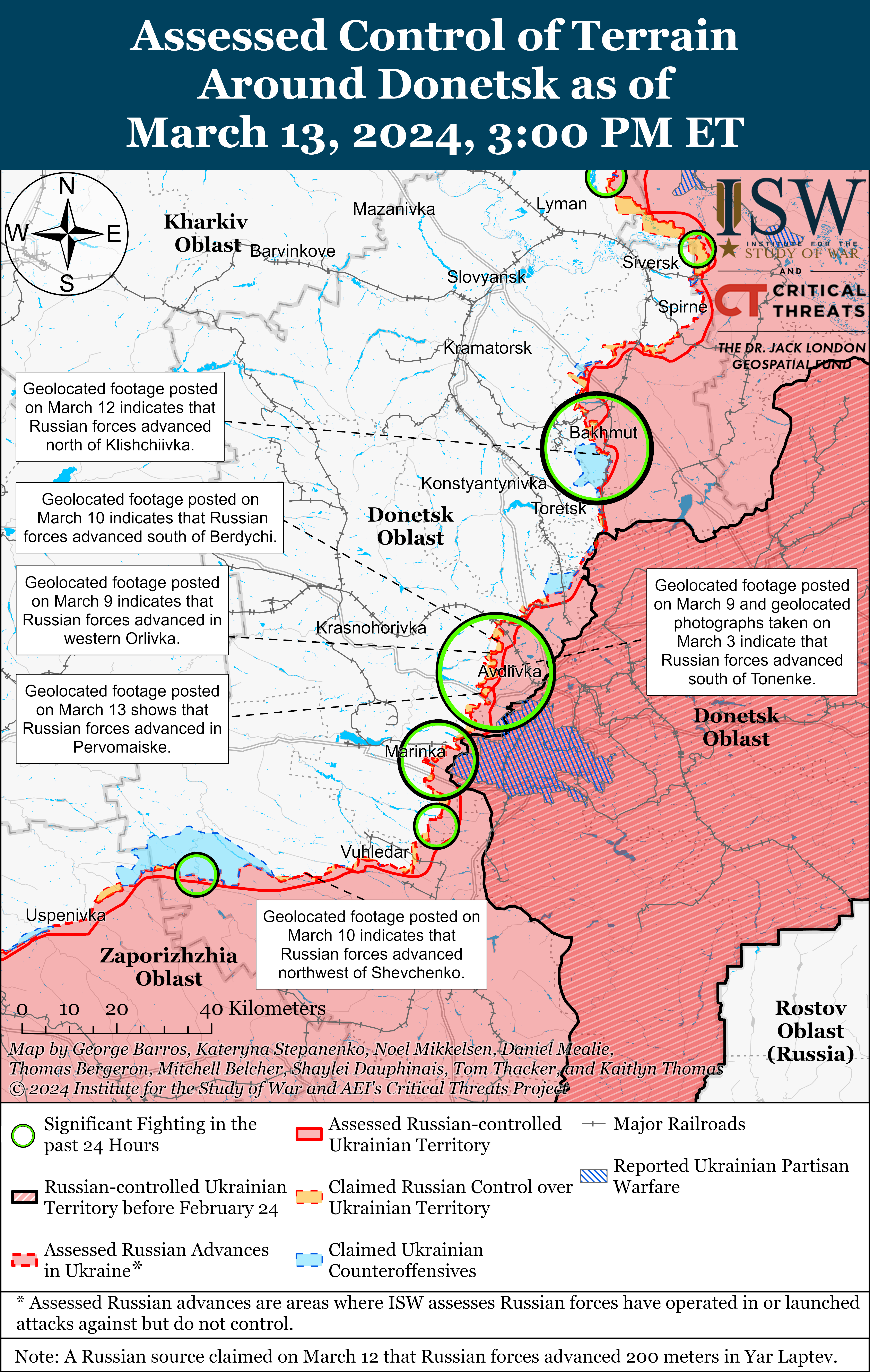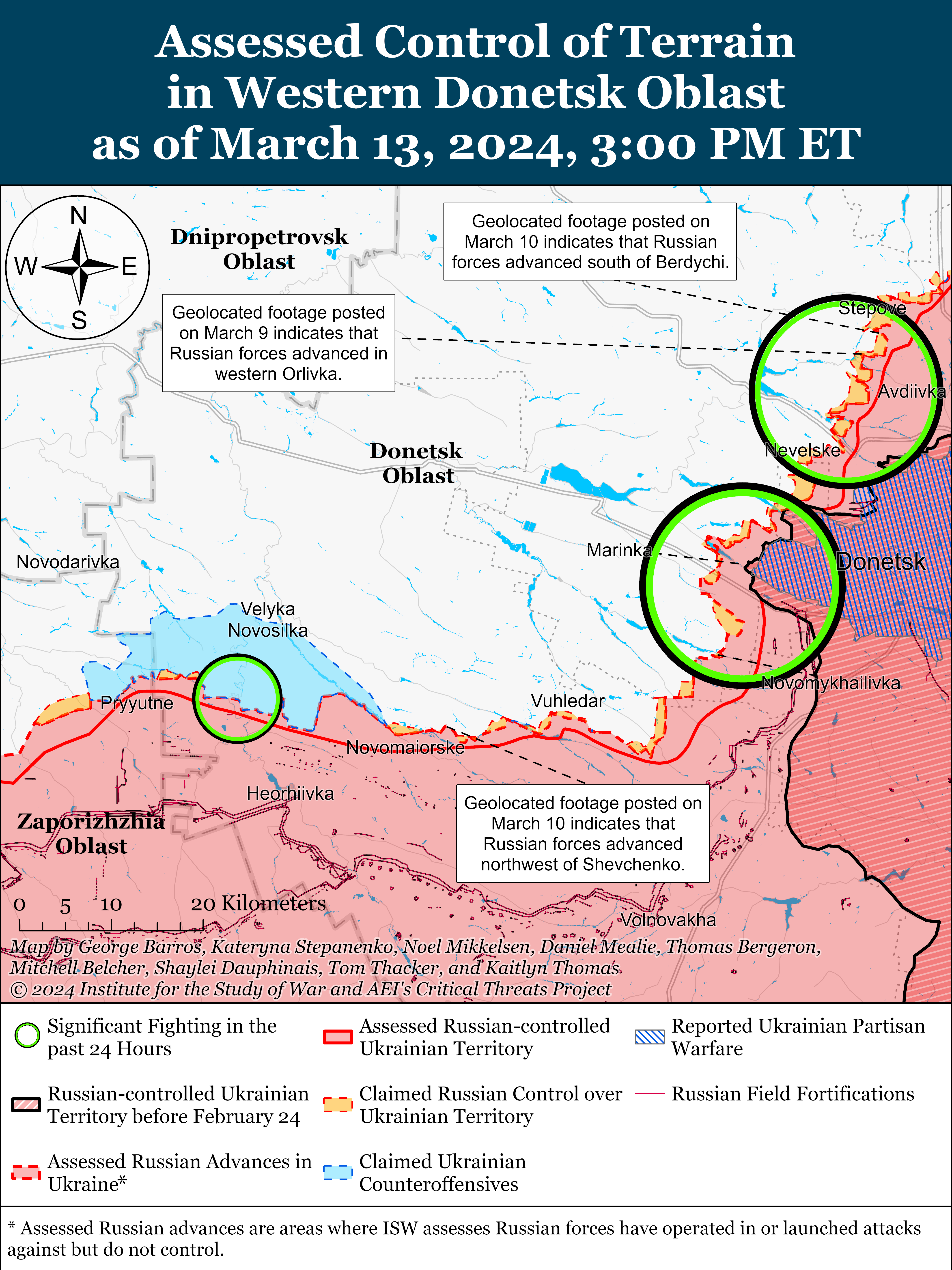 - Russian forces recently made confirmed advances near Avdiivka amid continued positional engagements along the entire frontline on March 13.
