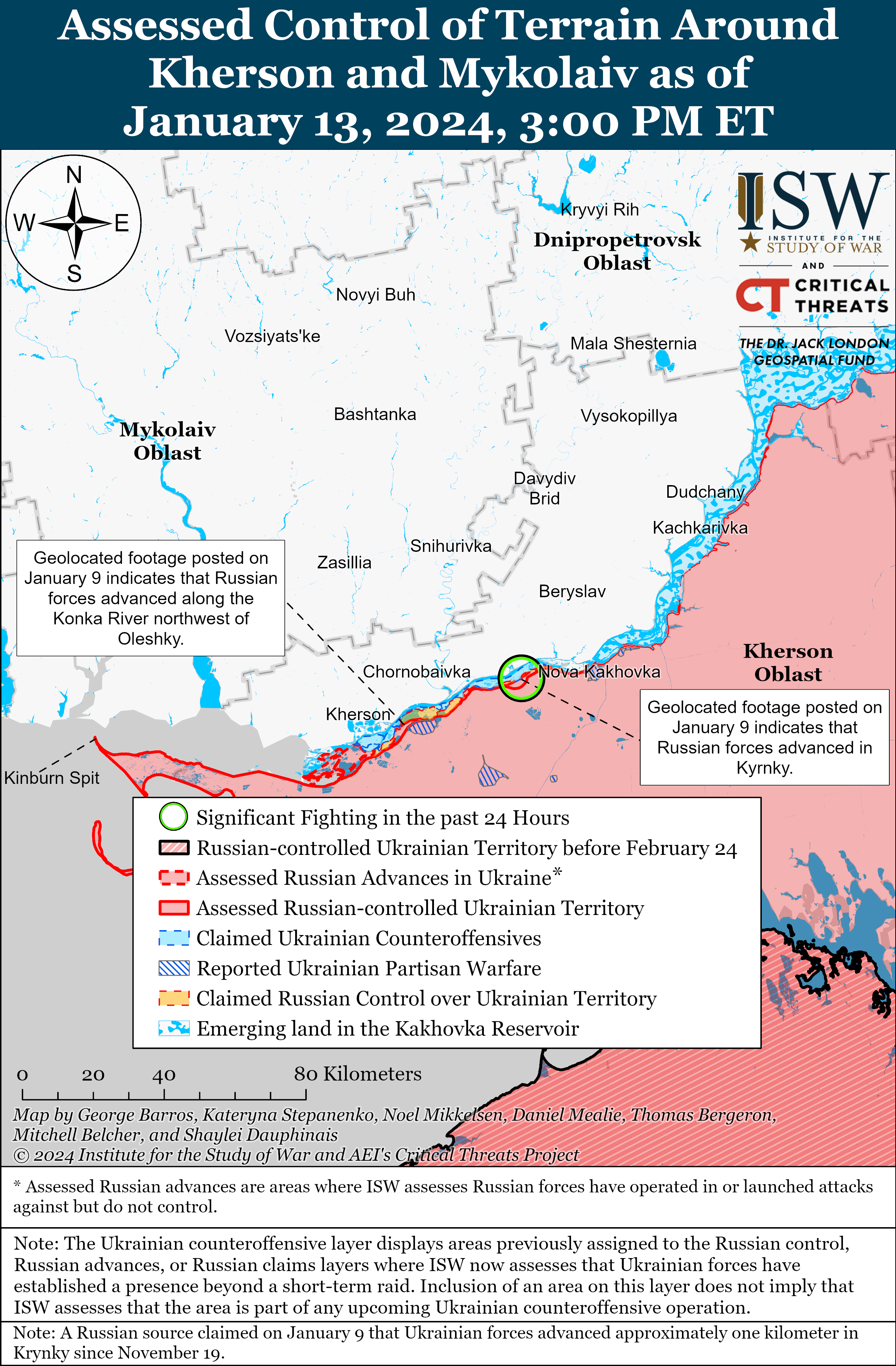 Russian and Ukrainian forces continued positional engagements in western Zaporizhia Oblast on January 13, but there were no confirmed changes to the frontline in the area. A Russian milblogger claimed that Russian forces advanced less than a kilometer southeast of Robotyne and west of Verbove (east of Robotyne).[45] Another milblogger claimed that Russian forces have recently intensified tactical actions near Nesteryanka (northwest of Robotyne) and captured an unspecified Ukrainian position in this area on January 12.[46] ISW has not observed evidence of these claimed Russian advances, however. Russian and Ukrainian sources stated that positional fighting continued near Novofedorivka (east of Robotyne), Verbove, Novoprokopivka (south of Robotyne), and Robotyne.[47]
