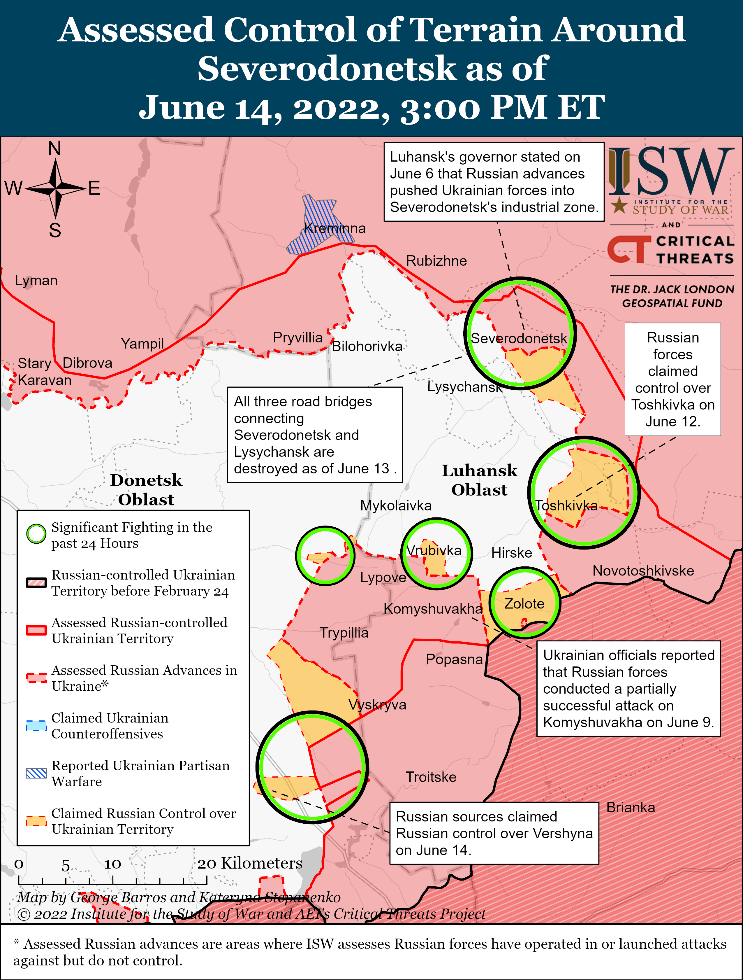 Russian forces continued ground assaults within Severodonetsk and fought for control of the Azot industrial plant on June 14.[7] The Ukrainian General Staff reported that Russian forces moved two battalion tactical groups (BTGs) to the north of Severodonetsk around Kremmina and Rubizhne (in Luhansk Oblast), but as ISW has previously assessed, these BTGs are unlikely to be functioning at full combat capacity.[8] A Russian Telegram channel additionally claimed that Russian forces have encircled Ukrainian troops within the Azot industrial plant, rendering evacuation or withdrawal from the plant impossible, though ISW cannot independently confirm this claim.[9] Russian forces have reportedly destroyed all three bridges spanning the Siverskyi Donets River from Severodonetsk to Lysychansk, indicating that Russian forces likely seek to isolate Ukrainian defenders in Severodonetsk from their critical lines of communication to complete the encirclement of the city, at the cost of preventing Russian forces from easily crossing the river themselves once they capture Severodonetsk.[10] Russian forces conducted continual artillery strikes against Severodonetsk-Lysychansk and the surrounding settlements of Privillya and Borivske.[11]