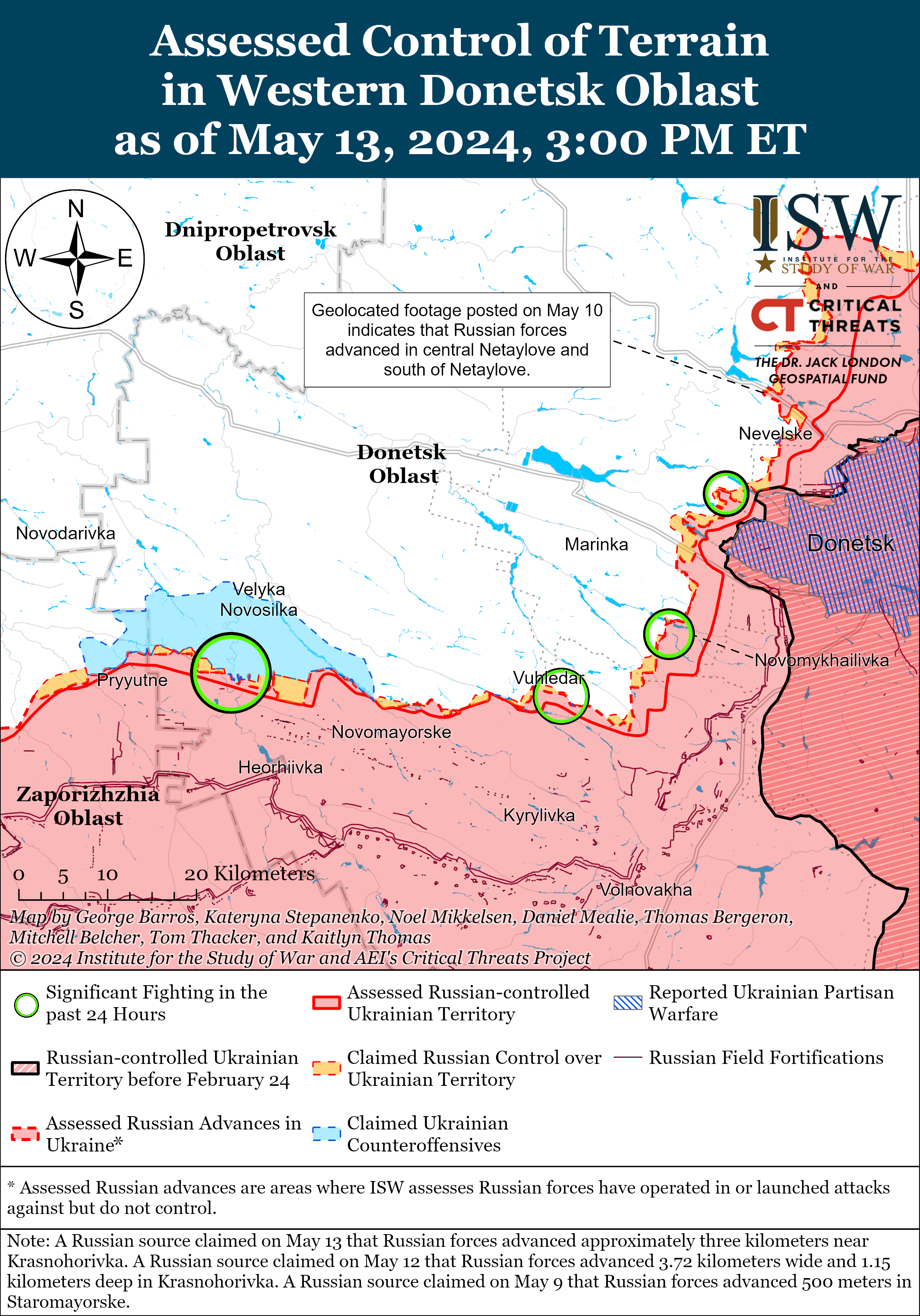 Russian forces reportedly continued to advance west of Avdiivka on May 13. Russian milbloggers claimed that Russian forces advanced west of Ocheretyne (northwest of Avdiivka) towards Novooleksandrivka.[59] Some milbloggers also claimed that Russian forces advanced west of Semenivka (northwest of Avdiivka) and up to 1.13 kilometers deep along a 3.52-kilometer-wide front towards Umanske (west of Avdiivka).[60] ISW has not yet observed visual confirmation of these claims, however. Russian milbloggers claimed that Russian forces are generally attacking north of Avdiivka on the Arkhanhelske line; northwest of Avdiivka on the Solovyove-Novopokrovske line; west of Avdiivka towards Umanske; and southwest of Avdiivka on the Netaylove-Pervomaiske-Nevelske line.[61]