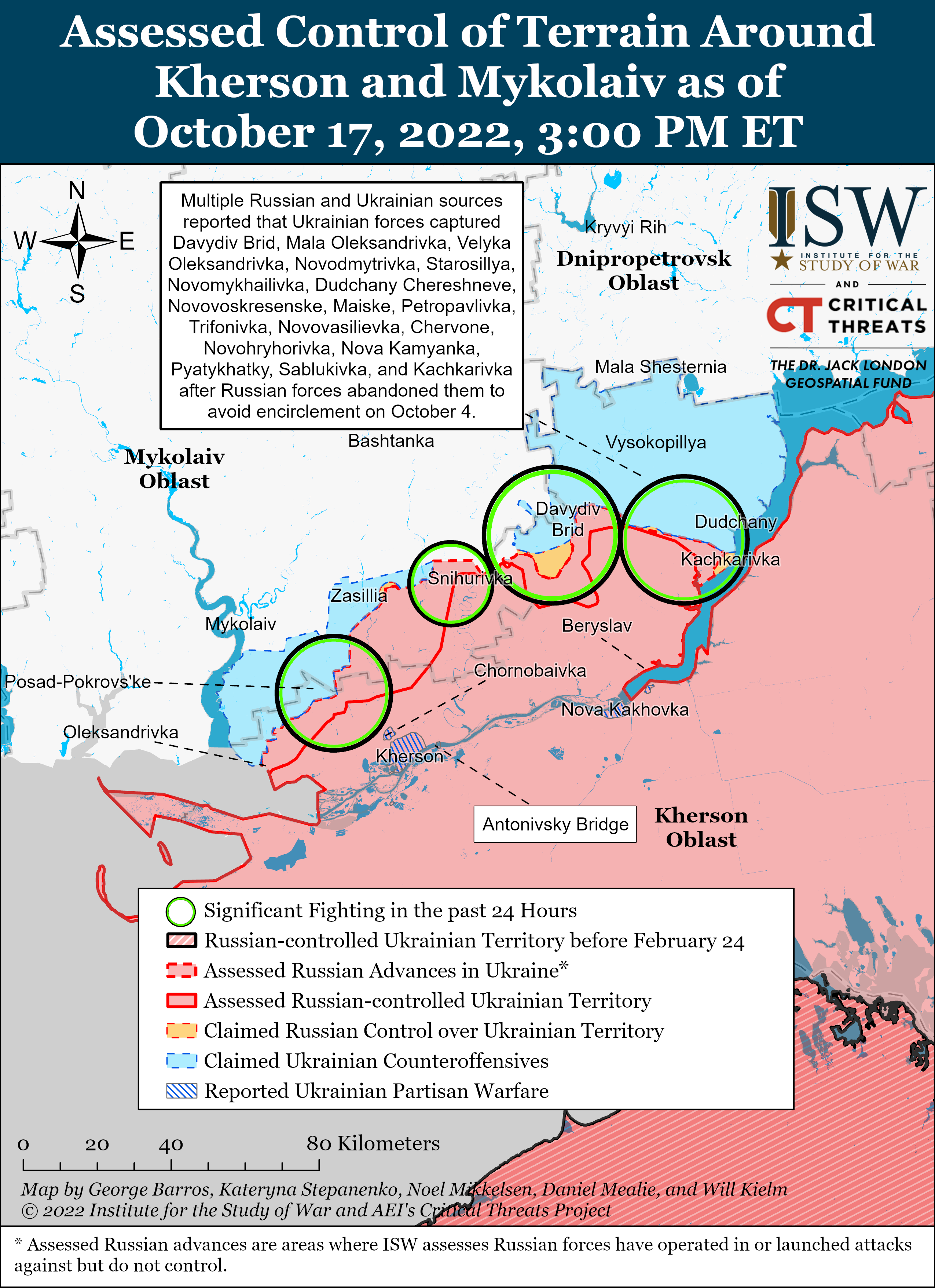 Russian sources continued to claim that Ukrainian forces are conducting counteroffensive operations in northern Kherson Oblast on October 16 and October 17. Ukraine’s Main Intelligence Directorate (GUR) released an intercepted phone call on October 17 wherein a Russian servicemen states that Ukrainian troops will conduct counteroffensive operations in Kherson Oblast in the coming days.[30] Several Russian sources claimed that Ukrainian troops attempted to push south from the Nova Kamianka-Dudchany line towards Mylove and Piatykhatky.[31] Russian sources additionally claimed that Ukrainian troops attempted to break through Russian lines in northwestern Kherson Oblast near Davydiv Brid and that Ukrainian troops northwest of Kherson City conducting artillery preparation of the battlefield.[32] These Russian claims remain unsubstantiated.