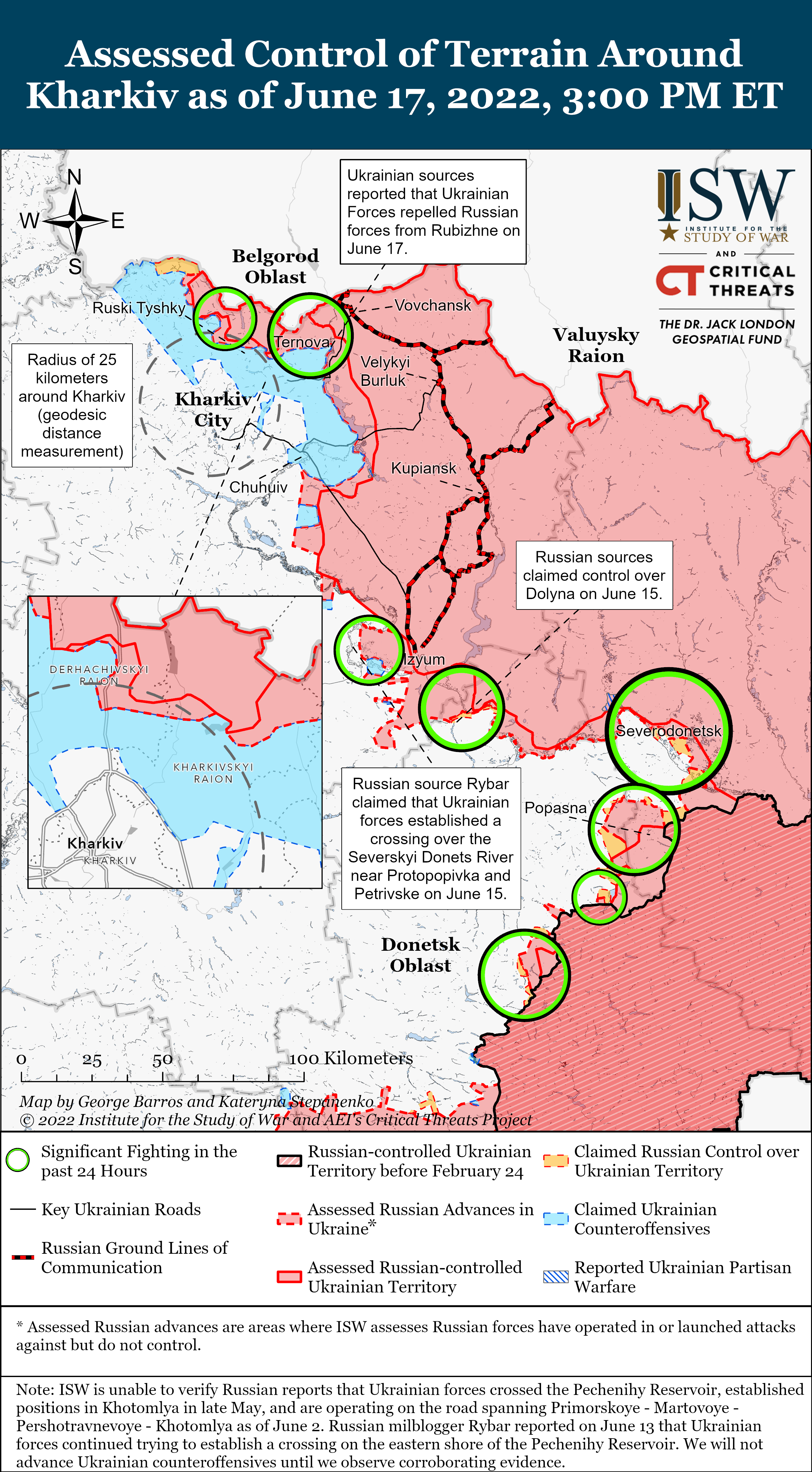Russian forces unsuccessfully attempted to advance north of Slovyansk and southeast of Izyum on June 17. The Ukrainian General Staff reported that Russian forces failed to seize Bohorodychne (approximately 25 km southeast of Izyum) and retreated to previously occupied positions.[20] Russian forces also conducted unsuccessful reconnaissance-in-force operations near Krasnopillia, located along the E40 highway to Slovyansk.[21] Ukrainian forces continued counteroffensives southwest of Izyum and pushed Russian forces out of Dmytrivka.[22]