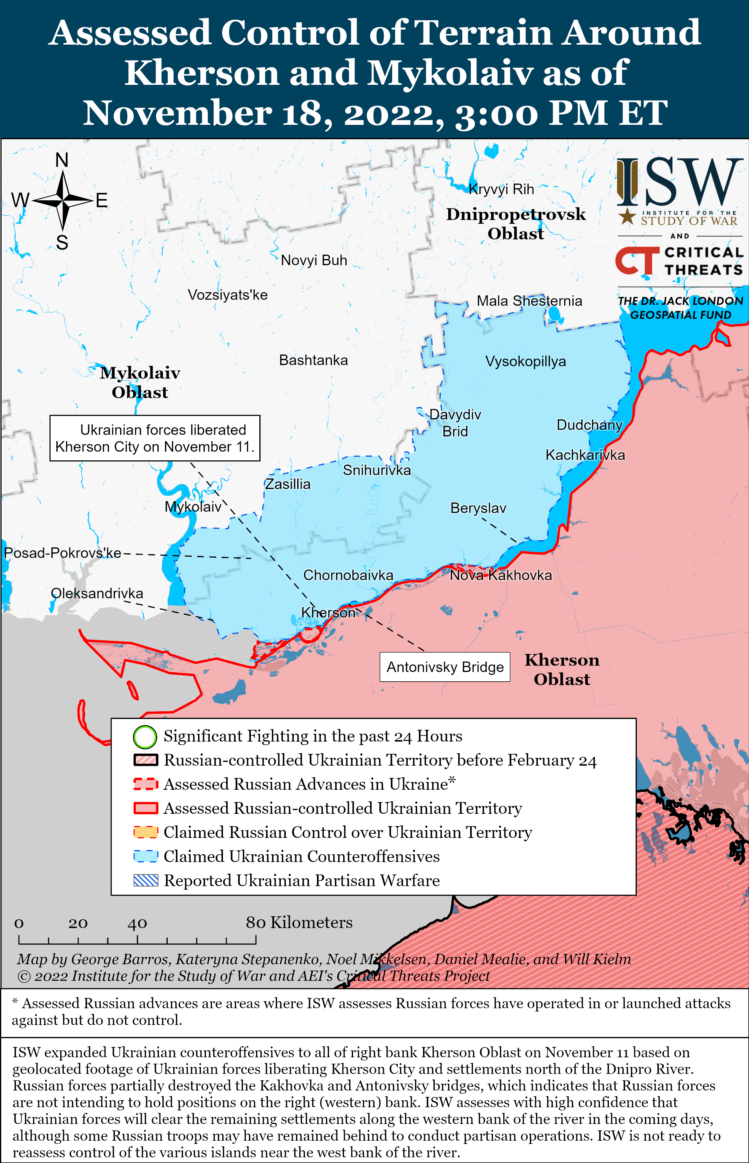 Russian forces continued to conduct defensive operations on the east (left) bank of the Dnipro River in Kherson Oblast on November 18. Ukraine’s Southern Operational Command reported that Russian forces continue to equip defensive lines and replenish their forces in eastern Kherson Oblast.[28] Ukraine’s Southern Operational Command also reported that Russian forces continue to draw further back from the eastern bank of the Dnipro River, forcibly relocating civilians from Novokiivka and transporting medical equipment from Nova Kakhovovka to Crimea.[29] The Ukrainian General Staff reported that Russian forces continued to strike areas on the western (right) bank of the Dnipro River, including Kherson City, Chornobaivka, Antonivka, and Beryslav.[30]