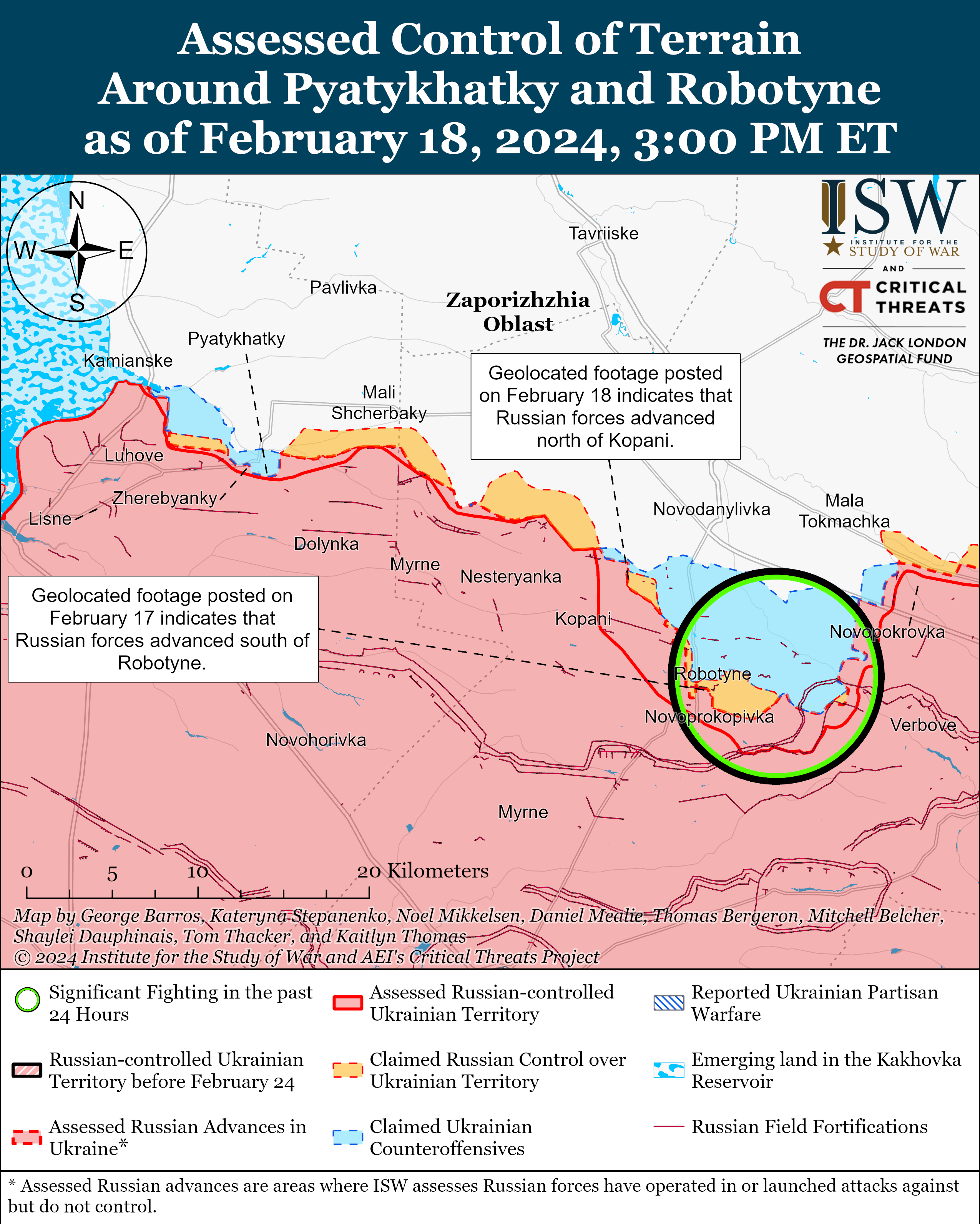 Russian forces made a marginal confirmed gain in western Zaporizhia Oblast following reports of renewed offensive operations on this sector of the front. Geolocated footage posted on February 18 shows that Russian forces recently advanced along a windbreak north of Kopani (6km northwest of Robotyne).[50] Russian milbloggers also claimed that Russian forces advanced up to 1.7 kilometers northwest of Verbove (east of Robotyne) and up to two kilometers near Robotyne itself, although ISW has not observed visual evidence confirming such extensive Russian advances.[51] The Ukrainian Eastern Group of Forces stated on February 18 that Ukrainian forces repelled a Russian attack consisting of ”a fairly large number of personnel” with about 30 vehicles in an unspecified area in the Zaporizhia direction (likely near Robotyne) on February 17, which corresponds with numerous Russian claims that Russian forces renewed offensives towards Robotyne on February 17.[52] A Russian milblogger complained that Russian forces used modernized Soviet era T-55 main battle tanks with poor anti-drone protection and weak hull and turret armor in a large assault near Robotyne on February 17.[53] Elements of the Russian 76th Airborne (VDV) Division and 70th Motorized Rifle Regiment (42nd Motorized Rifle Division, 58th Combined Arms Army [CAA], Southern Military District) reportedly continue operating near Robotyne.[54] Elements of the Russian 7th VDV Division reportedly continue operating in the Zaporizhia direction.[55]