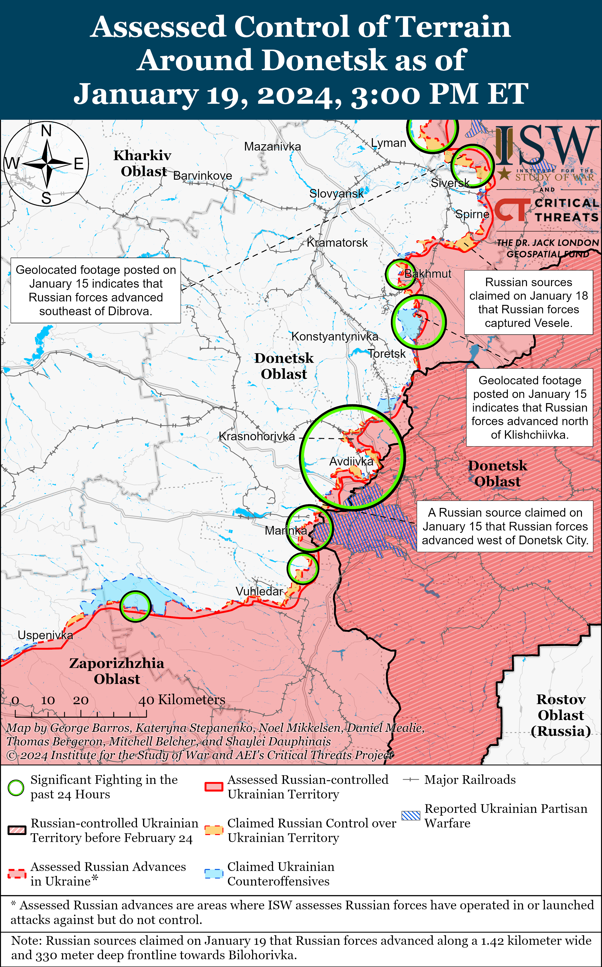 Russian forces reportedly advanced on the outskirts of Avdiivka amid continued positional fighting in the area on January 19. Russian milbloggers claimed that Russian forces made tactical advances on the outskirts of Avdiivka; north of Avdiivka near Stepove; and southwest of Avdiivka near Pervomaiske and Nevelske.[77] Ukrainian journalist Yuriy Butusov claimed that small Russian infantry groups entered Avdiivka, and a Ukrainian soldier operating in the area reported that Russian forces marginally advanced in Avdiivka‘s residential sector in the eastern part of the city.[78] ISW has not observed any confirmation of reported Russian advances near or in Avdiivka, however. Ukrainian and Russian sources reported that positional engagements also continued northwest of Avdiivka near Novokalynove and Novobakhmutivka; west of Avdiivka near Tonenke; near the Coke Plant in northwestern Avdiivka, the “Blue Lakes” quarry immediately north of Avdiivka, and the industrial zone southeast of Avdiivka; and east of Avdiivka near Kamyanka.[79] Avdiivka City Military Administration Head Vitaliy Barabash stated that weather conditions in the Avdiivka direction recently allowed Russian forces to conduct mechanized assaults against the city on frozen ground, but that the ground then thawed and inhibited Russian mechanized attacks on January 18.[80] Barabash also stated that Russian forces no longer have a significant numerical advantage in first-person view (FPV) drones in this area of the front.[81]