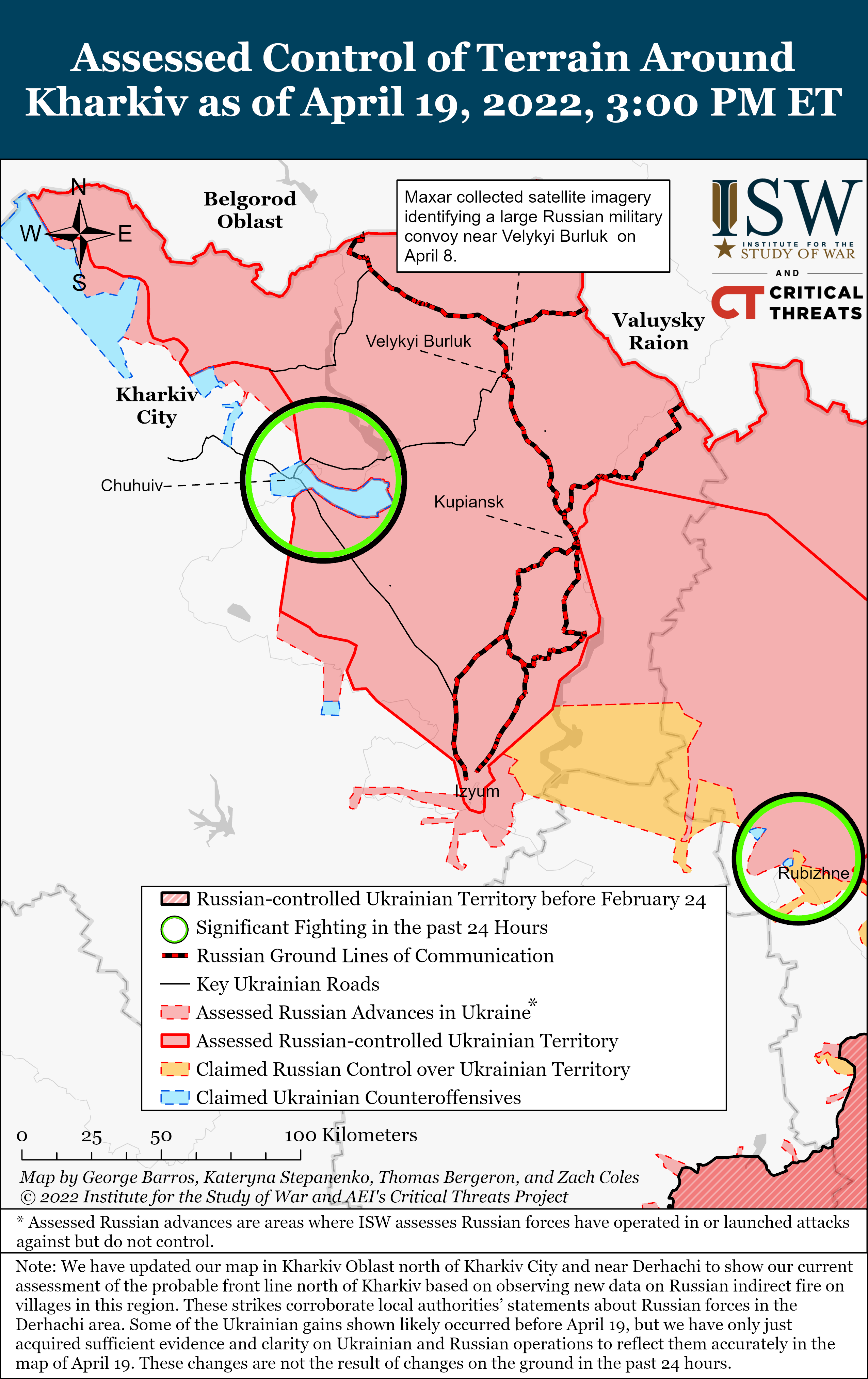 Russian forces continued to shell settlements in Kharkiv Oblast and maintain a partial blockade of Kharkiv city on April 19.[12] The Ukrainian General Staff stated that Russian troops mounted an unsuccessful offensive to the south of Izyum and are generally conducting offensive operations along the east bank of the Siversky Donets River.[13] Vyacheslav Zadorenko, the mayor of Derhachi—which is about 10 miles northwest of Kharkiv City, stated that Russian forces are likely blocking approximately six settlements around Derhachi as of April 10.[14]