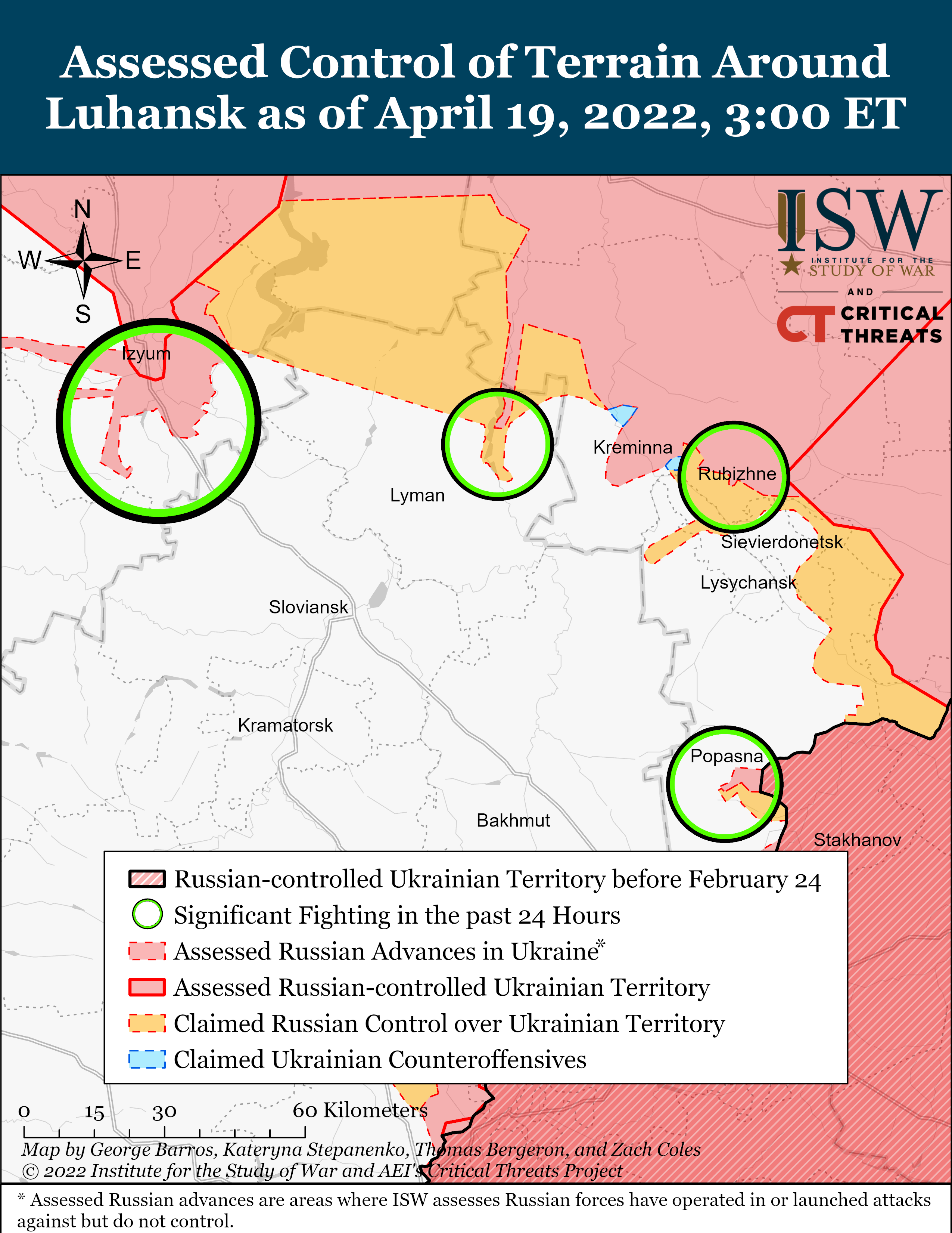 Russian forces intensified offensive operations in Donetsk and Luhansk oblasts on April 19.[7] Russian artillery fire continued to target Popasna, Rubizhe, Lysychansk, and Severodonetsk and shell various settlements in Donetsk Oblast over the last 24 hours.[8] The Ukrainian Ministry of Defense stated that Russian troops are consolidating in the vicinity of Adviivka and Mariinka.[9] Ukrainian forces reportedly repelled attempted Russian advances into Avdiivka, Popasna, and Rubizhne on the night of April 18.[10] Pro-Russian sources additionally claimed that Russian troops entered Torske in order to encircle Ukrainian positions in Lysychansk, Severodonetsk, and Rubizhne, but ISW cannot independently verify this claim.[11]