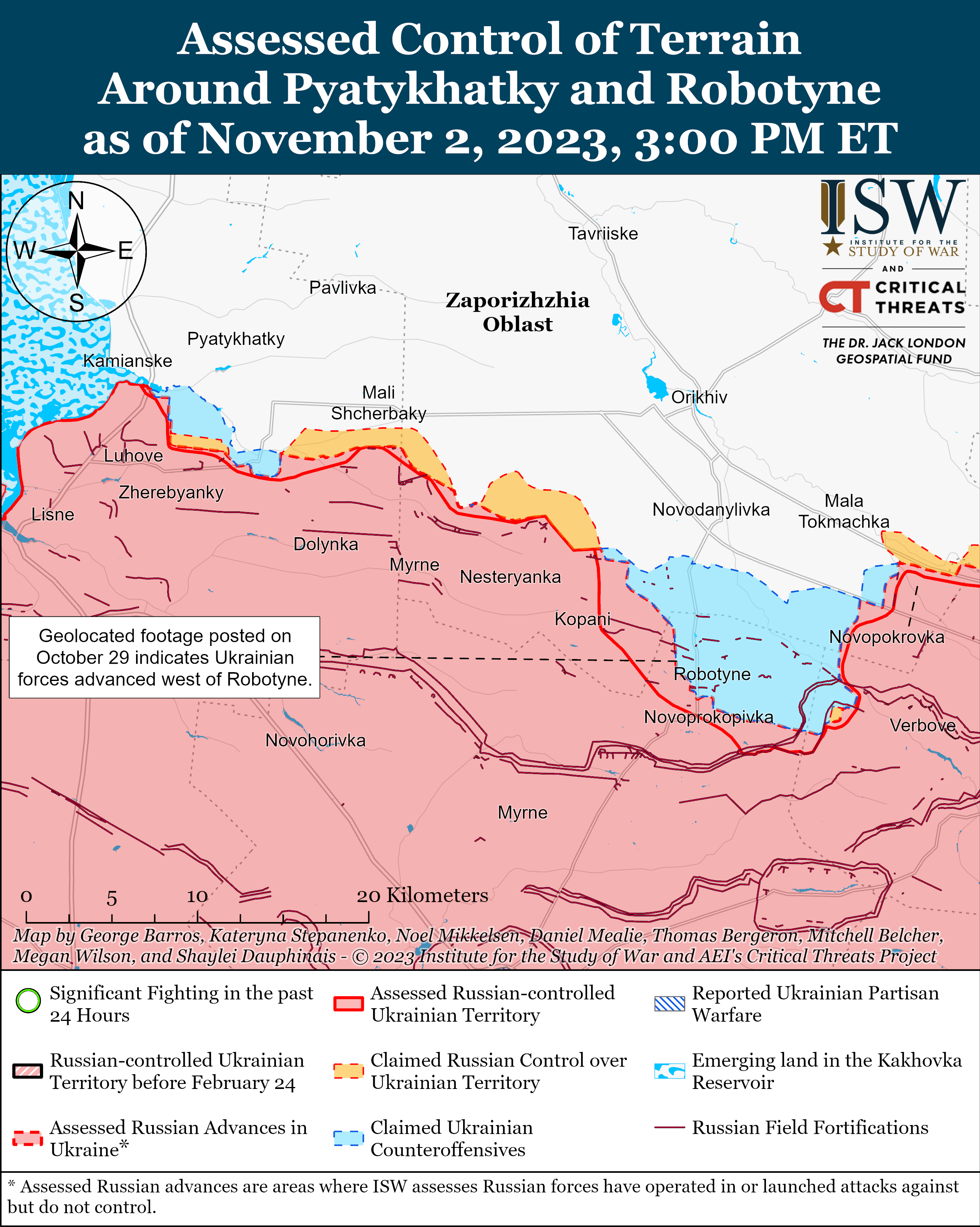 - Ukrainian forces recently advanced near Bakhmut and continued offensive operations in western Zaporizhia Oblast on November 2.