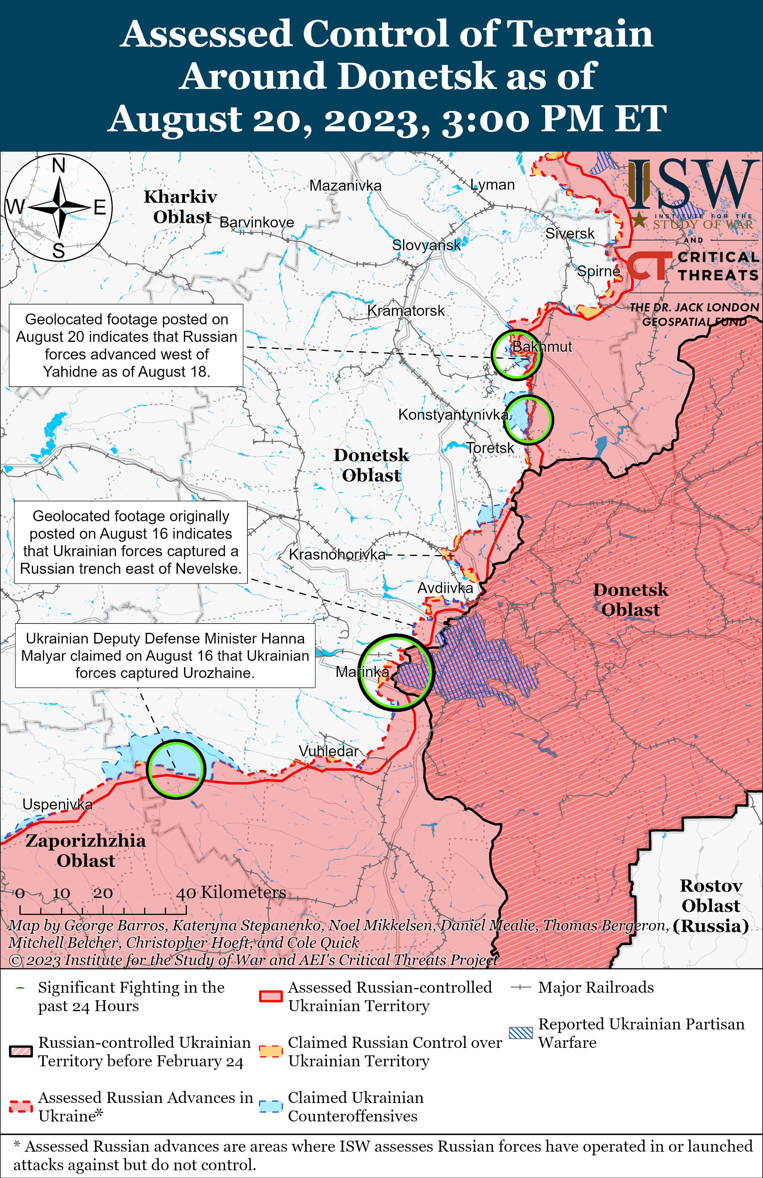 Ukrainian forces continued limited counteroffensive operations in the Bakhmut area and may have advanced on August 20. Geolocated footage published on August 20 indicates that Ukrainian forces have reached positions further west and north of Andriivka (10km southwest of Bakhmut), though it is unclear whether Ukrainian forces still hold these positions.[51] Russian milbloggers claimed that Russian forces repelled recent Ukrainian attacks near Andriivka, but this footage indicates that Russian control north and west of the settlement has degraded regardless of the duration and extent of these Ukrainian advances.[52] The Russian Ministry of Defense (MoD) claimed that Russian forces repelled a Ukrainian attack near Mayorske (21km southwest of Bakhmut).[53] A Russian milblogger claimed that Russian forces also repelled Ukrainian attacks near Berkhivka (6km northwest of Bakhmut) on August 19.[54]