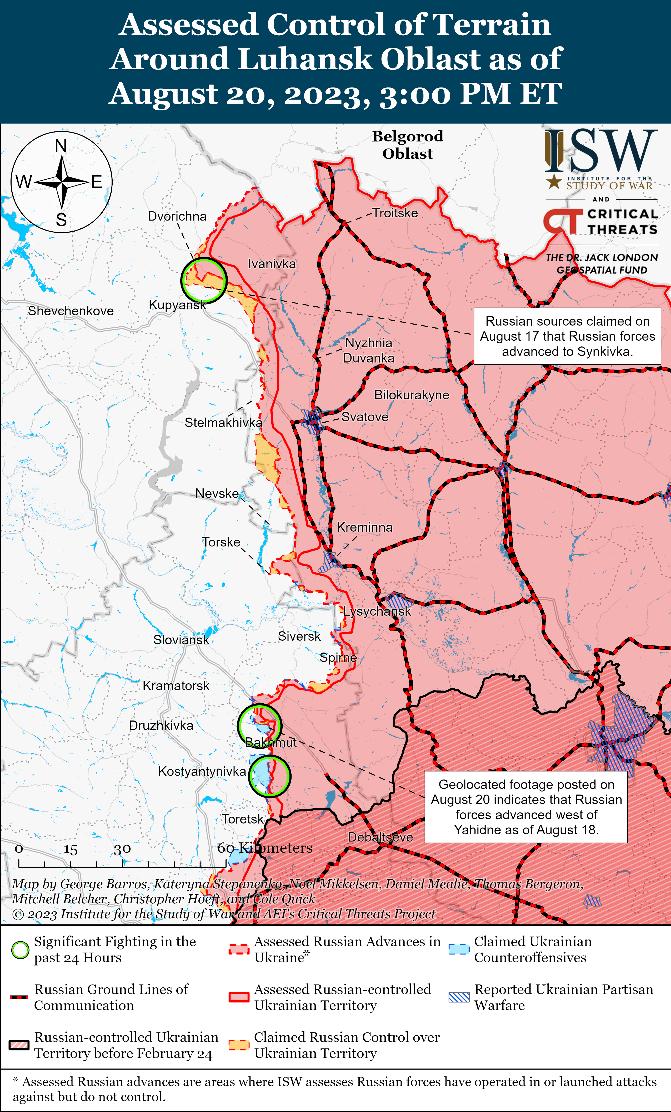Russian forces continued offensive operations northeast of Kupyansk on August 20 but made no confirmed gains. The Ukrainian General Staff reported that Russian forces conducted unsuccessful offensive operations near Synkivka (9km northeast of Kupyansk).[39] Russian Western Grouping of Forces Spokesperson Yaroslav Yakimkin claimed that Russian forces continued offensive operations in the direction of Vilshana (14km northeast of Kupyansk) and captured unspecified Ukrainian positions.[40] Russian milbloggers claimed that elements of the Russian 1st Guards Tank Army (Western Military District) continued to advance near Synkivka but noted that claims about the Russian encirclement or capture of the settlement are premature.[41] Kharkiv Oblast occupation administration head Vitaly Ganchev claimed on August 19 that Russian forces captured five unspecified settlements in Kharkiv Oblast in the past week, although ISW has not observed visual confirmation of this claim.[42] Russian sources have claimed that Russian forces have been steadily advancing northeast of Kupyansk for the past several weeks, although corresponding visual confirmation corroborating these claims has yet to emerge.[43] Russian sources previously claimed extensive Russian advances southwest of Svatove that visual evidence has still yet to confirm, suggesting that Russian sources may be engaging in a wider pattern of exaggerating Russian advances along the Kupyansk-Svatove line.[44] Russian sources may be exaggerating Russian advances to portray localized Russian offensive operations as more threatening in order to support the Russian effort to draw Ukrainian forces away from more operationally significant sectors of the front.[45] A Russian milblogger did acknowledge that Russian forces are struggling to advance near Synkivka and Petropavlivka (6km east of Kupyansk) due to Ukrainian minefields.[46]