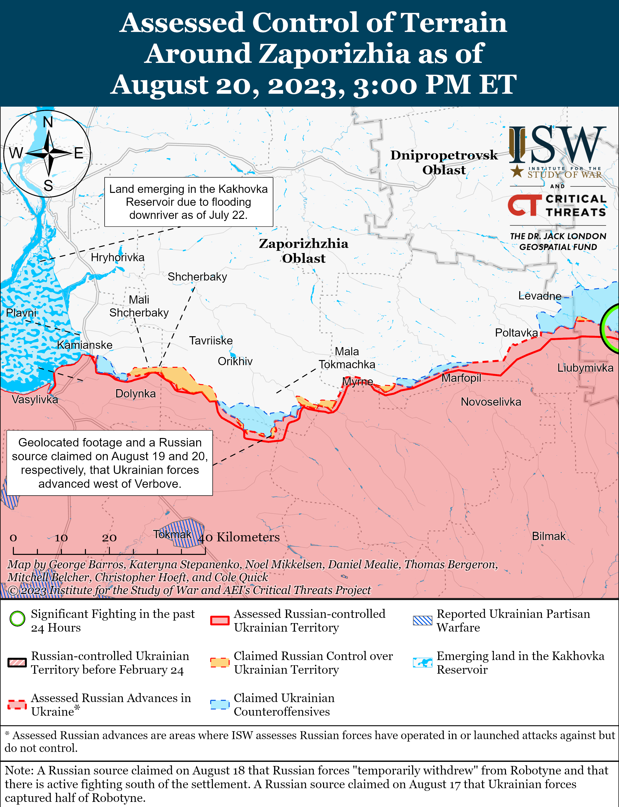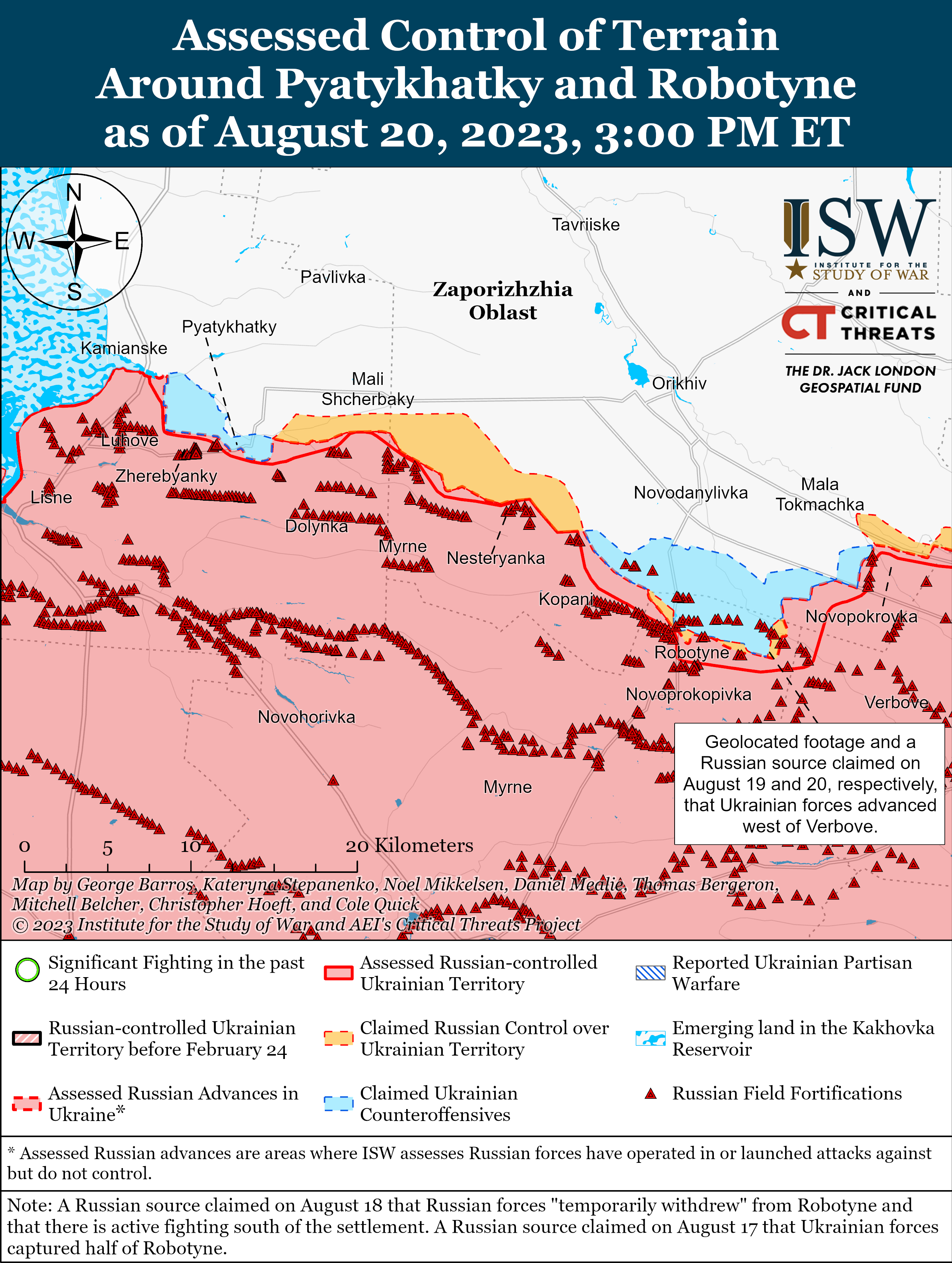 Ukrainian forces conducted offensive operations in western Zaporizhia Oblast on August 20 and recently advanced. Geolocated footage published on August 19 and 20 shows that Ukrainian forces recently advanced east of Robotyne (10km south of Orikhiv).[67] A Kremlin-affiliated milblogger claimed that Ukrainian forces captured unspecified Russian positions west of Verbove (18km southeast of Orikhiv) and continue to attack Russian positions along the Robotyne-Verbove line.[68] Another Russian milblogger claimed that Ukrainian forces have partially succeeded in bypassing Robotyne and breaking through Russian defenses to Novoprokopivka (17km south of Orikhiv).[69] The Ukrainian General Staff reported that Ukrainian forces conducted offensive operations in the Melitopol direction (western Zaporizhia Oblast).[70] Several Russian milbloggers claimed that Ukrainian forces are operating in the northern outskirts of Robotyne and that fighting is ongoing in the settlement itself.[71] A milblogger also claimed that Ukrainian forces attacked near Nesteryanka (10km southwest of Orikhiv) and Kopani (12km south of Orikhiv).[72]