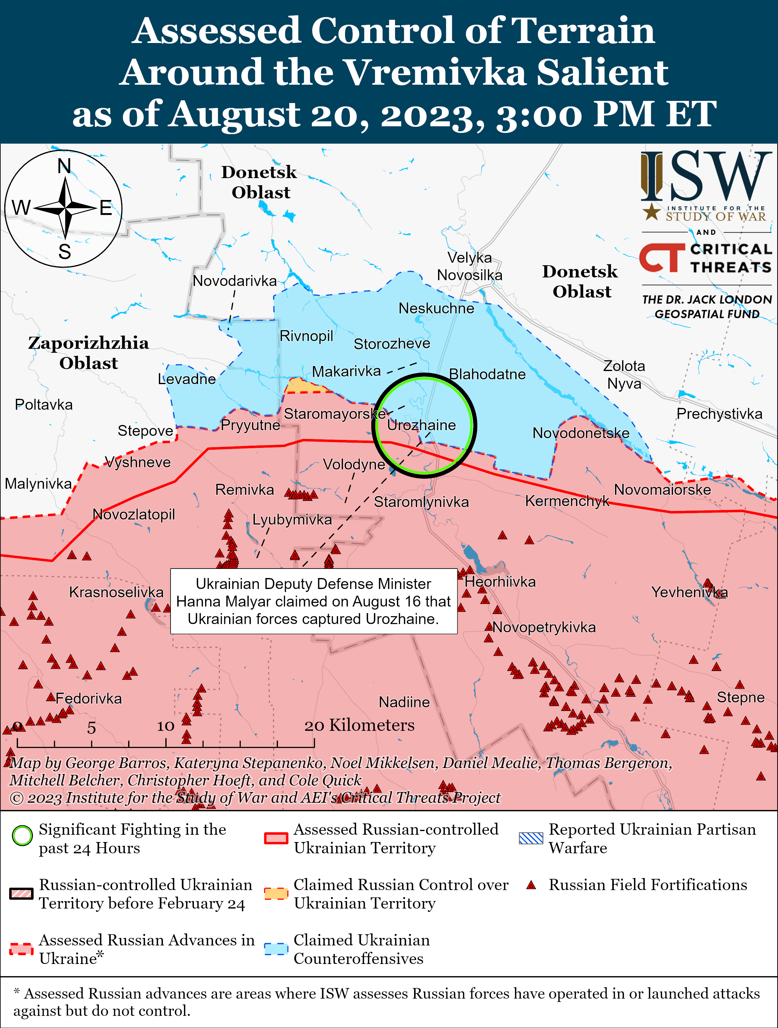 Ukrainian forces conducted offensive operations in the western Donetsk-eastern Zaporizhia Oblast border area on August 20 but did not make any confirmed or claimed advances. The Ukrainian General Staff reported that Ukrainian forces conducted offensive operations in the Berdyansk direction (eastern Donetsk-eastern Zaporizhia Oblast border area).[61] A Russian news aggregator claimed on the evening of August 19 that Russian forces repelled Ukrainian attacks near Urozhaine (9km south of Velyka Novosilka) and Staromayorske (9km south of Velyka Novosilka).[62] A Russian milblogger claimed that Russian forces have been repelling Ukrainian attacks in the direction of Staromlynivka (14km south of Velyka Novosilka) and northeast of Kermenchyk (16km southwest of Velyka Novosilka) since Russian forces withdrew from Urozhaine on August 16.[63]