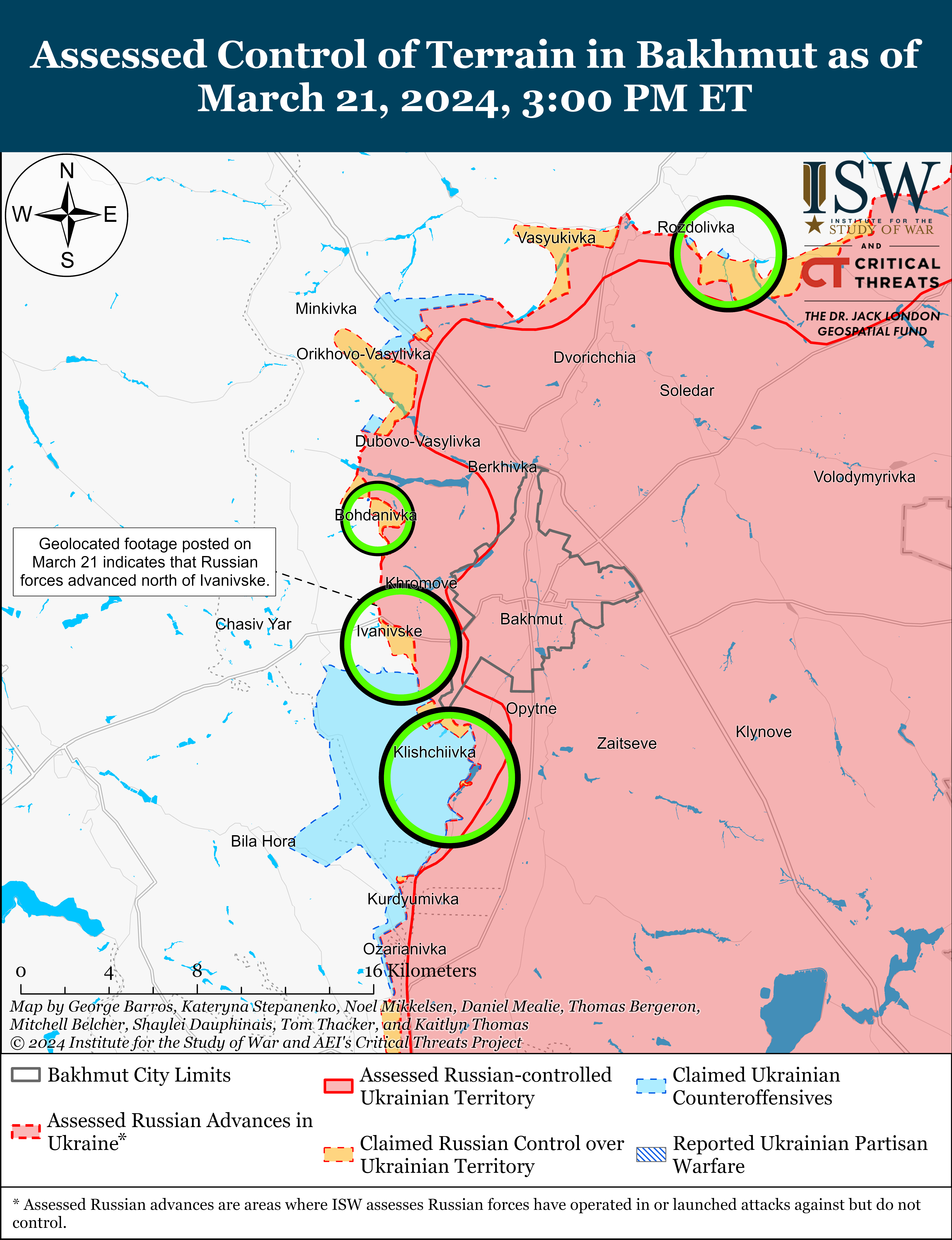 Russian forces recently advanced west of Bakhmut amid continued positional fighting in the area on March 21. Geolocated footage published on March 21 indicates that Russian forces recently advanced north of Ivanivske (west of Bakhmut).[50] The Russian MoD claimed that Russian forces captured the Alebastrova railway station east of Klishchiivka (southwest of Bakhmut), but ISW has not observed confirmation of this claim.[51] Positional fighting continued northwest of Bakhmut near Bohdanivka; west of Bakhmut near Ivanivske; southwest of Bakhmut near Klishchiivka; and south of Bakhmut near Niu York.[52] Elements of the Russian 106th Airborne (VDV) Division continue to operate northeast of Bakhmut near Soledar.[53]