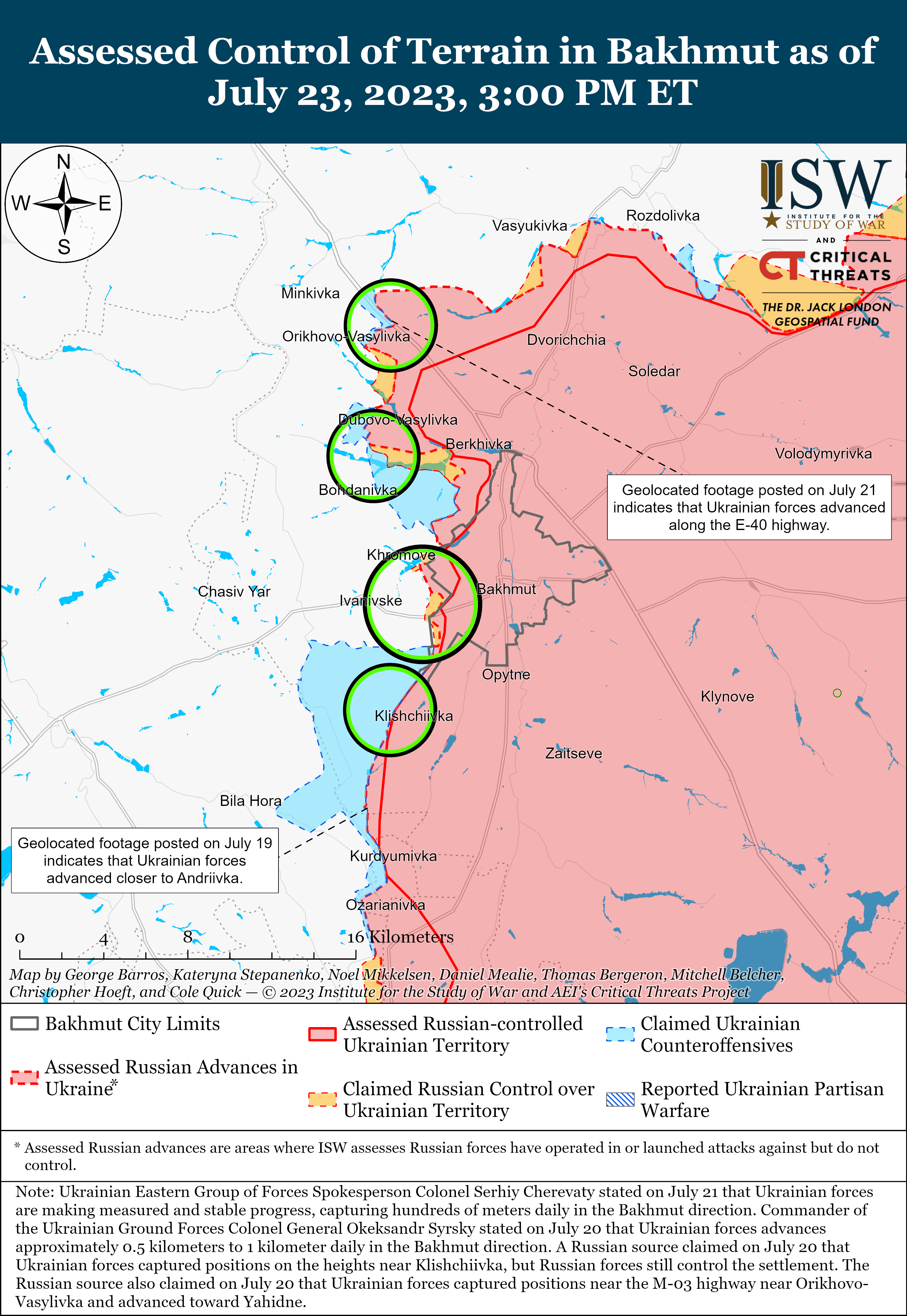 Ukrainian forces continued counteroffensive operations in the Bakhmut area and reportedly made gains near Bakhmut City on July 23. A Ukrainian source reported that Ukrainian forces advanced northwest of Khromove (immediately west of Bakhmut), and a Russian milblogger claimed that Ukrainian forces pushed Russian forces to the city limits of the settlement.[45] The Russian Ministry of Defense (MoD) claimed that Russian elements of the Southern Grouping of Forces repelled Ukrainian attacks near Klishchiivka (7km southwest of Bakhmut) and Mayorske (20km south of Bakhmut).[46] A Russian milblogger claimed that Ukrainian forces are conducting ongoing offensive actions near Kurdyumivka (13km southwest of Bakhmut).[47]