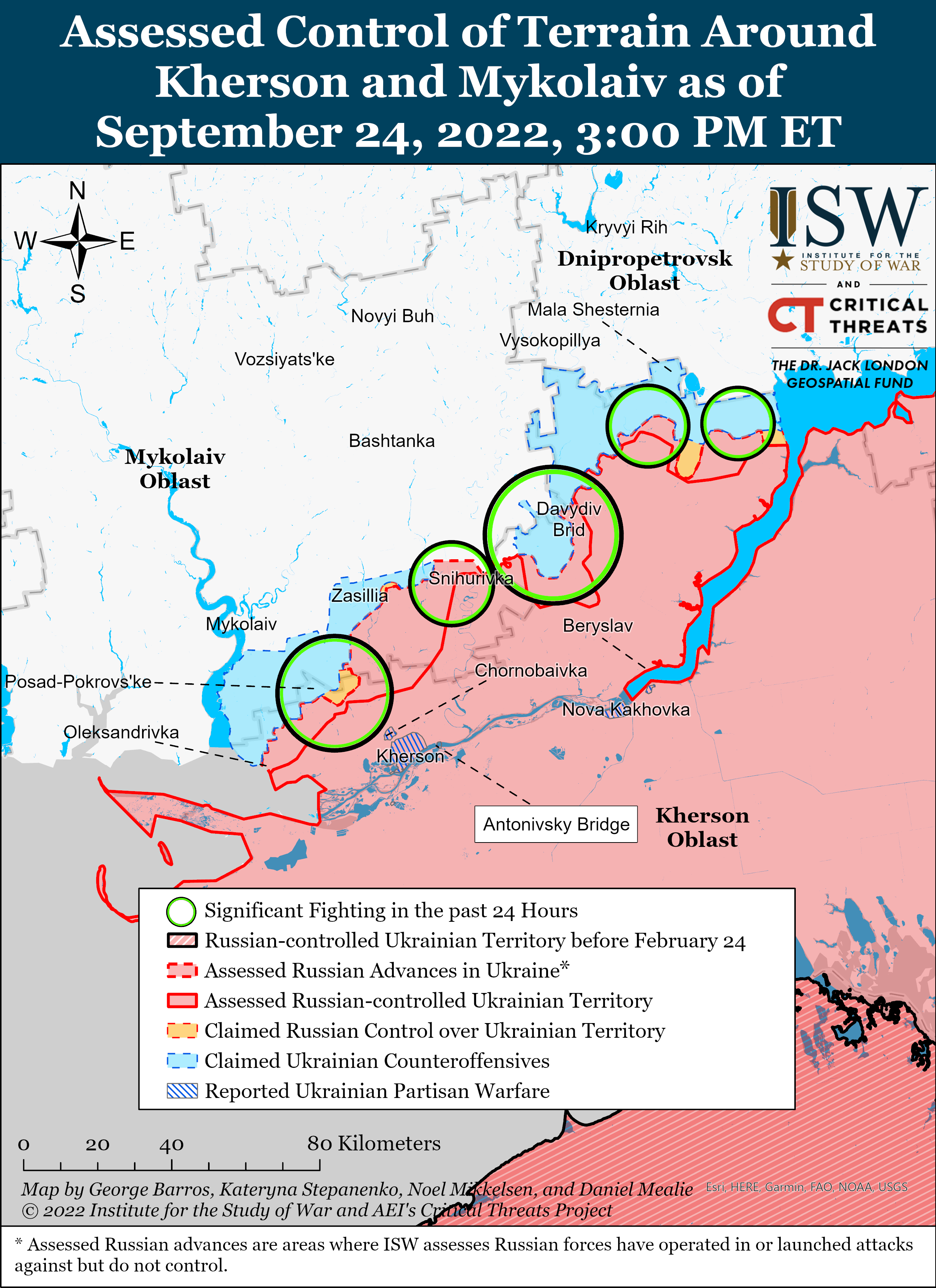 Russian sources identified three locations where Ukrainian troops conducted active ground operations in Kherson Oblast on September 23 and 24—northern Kherson Oblast, western Kherson Oblast near the Inhulets River, and northwest of Kherson City near the Kherson-Mykolaiv Oblast border. Russian milbloggers claimed that Ukrainian troops are preparing to push south of Novovoznesenske (about 16km south of the Dnipropetrovsk-Kherson Oblast border) and are pulling forces to Osokorivka (25km northeast of Novovoznesenske) to continue efforts to push southwards.[24] Russian sources additionally claimed that Ukrainian troops are continuing to fight in northern Kherson Oblast near Olhyne and Arkhanhelske.[25] Russian sources additionally claimed that Ukrainian troops are fighting in western Kherson near the Inhulets River and continuing positional battles near Sukhyi Stavok.[26] Russian milbloggers additionally indicated that Ukrainian troops are continuing ground maneuvers and positional battles northwest of Kherson City in the Posad-Pokrovske area and pulling reserves from Mykolaiv City to reinforce positions along the Mykolaiv-Kherson Oblast border.[27]