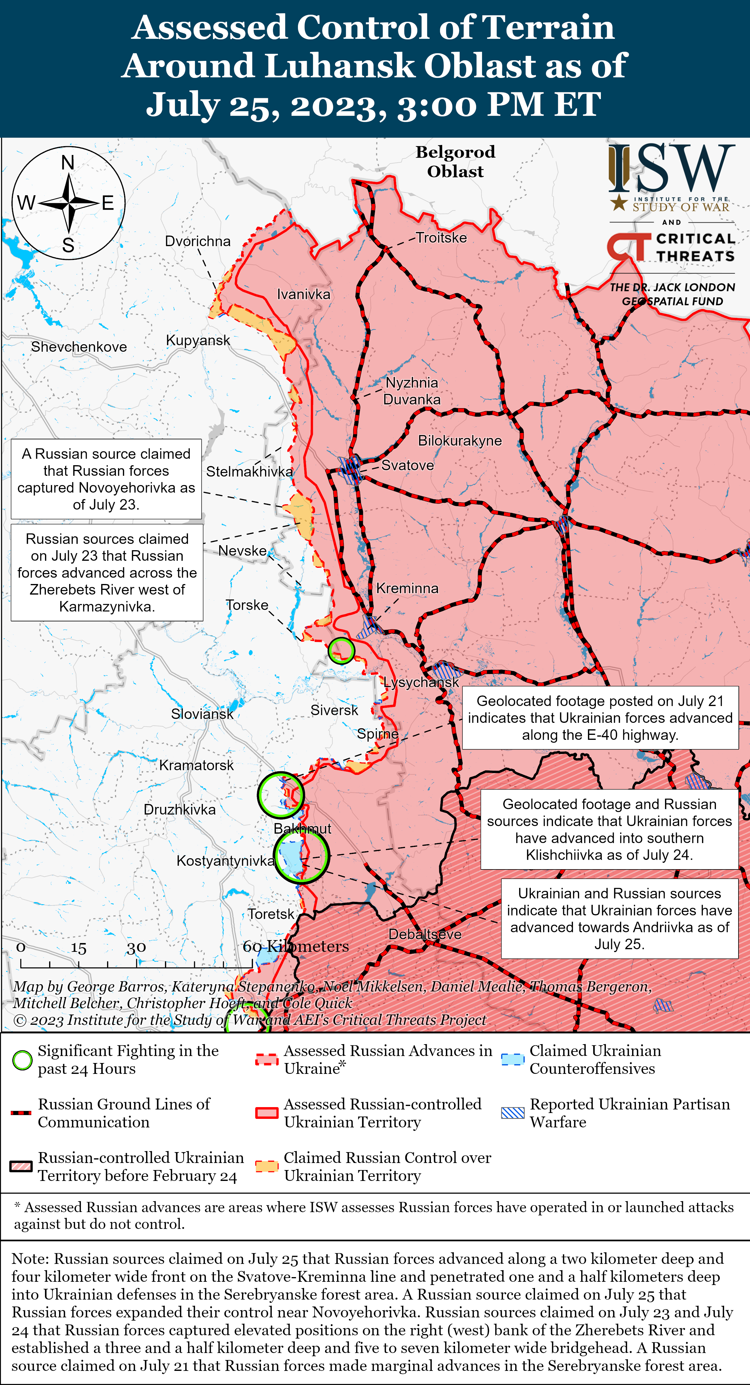 Ukrainian forces conducted offensive operations in the Bakhmut area and made tactically significant gains south of Bakhmut on July 25. Geolocated footage posted on July 25 shows that Ukrainian forces advanced south of Klishchiivka (7km southwest of Bakhmut).[40] A Kremlin-affiliated milblogger claimed that Ukrainian forces gained a position on the heights adjacent to Klishchiivka on July 24 and that there is heavy fighting on the outskirts of the settlement.[41] Several milbloggers also claimed that Ukrainian forces occupied a section of the heights near Klishchiivka and that Ukrainian forces entered the southern and southwestern outskirts of the settlement.[42] One Russian milblogger claimed that Ukrainian forces occupy 90 percent of the forest area along the western outskirts of Klishchiivka.[43] Several milbloggers claimed that neither Russian nor Ukrainian forces control the entire settlement, however.[44] The Ukrainian General Staff reported on July 25 that Ukrainian forces conducted offensive operations north and south of Bakhmut and that Russian forces withdrew from Andriivka (20km southwest of Bakhmut and directly south of Klishchiivka.[45] A Russian milblogger also claimed that Ukrainian forces broke through Russian defensive lines to Andriivka (10km southwest of Bakhmut), though other milbloggers claimed that Ukrainian forces have increased offensive operations but have not advanced to the settlement.[46]