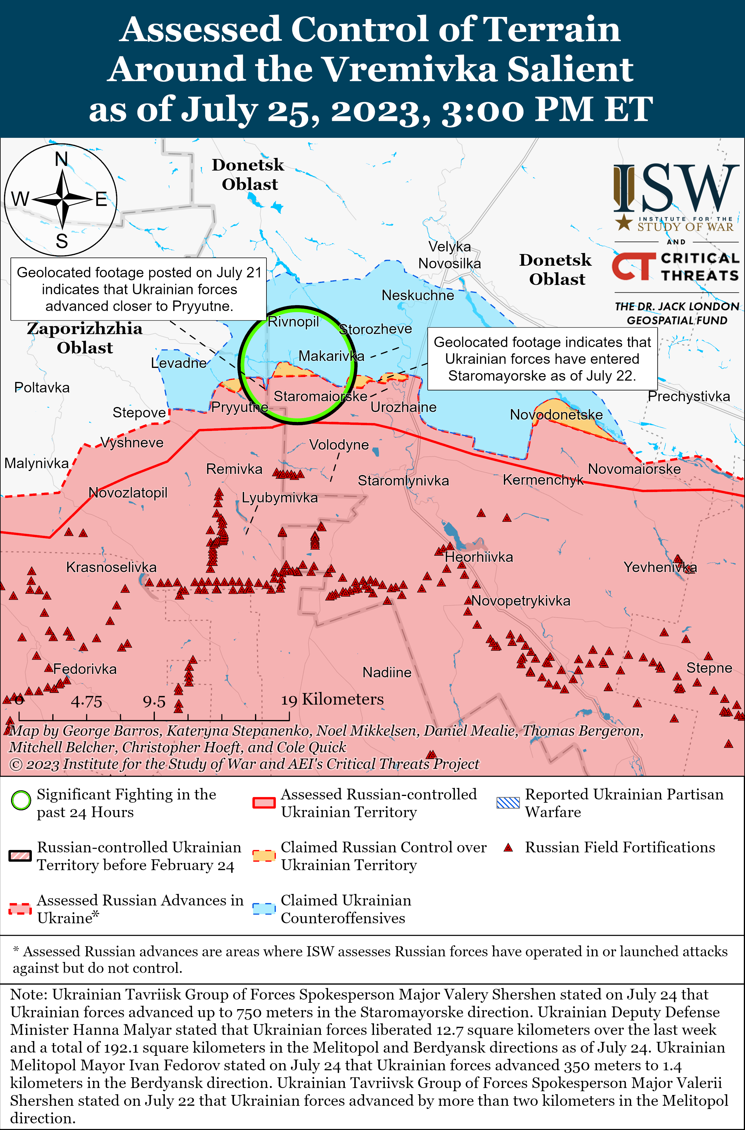 Ukrainian forces continued counteroffensive operations on at least three sectors of the front and advanced on July 25.[10] Geolocated footage published on July 25 shows that Ukrainian forces have made tactically significant gains south of Klishchiivka (7km southwest of Bakhmut).[11] The Ukrainian General Staff reported that Ukrainian forces conducted offensive operations in the Bakhmut, Melitopol (western Zaporizhia Oblast), and Berdyansk (Zaporizhia-Donetsk Oblast border area) directions.[12] Ukrainian sources reported that Ukrainian forces advanced up to 750 meters in the direction of Staromayorske (9km south of Velyka Novosilka), and Russian sources claimed Ukrainian forces made marginal advances west of Orikhiv.[13] Ukrainian Deputy Defense Minister Hanna Malyar reported that Russian forces are dying at a rate eight times higher than Ukrainian forces in the Bakhmut area and 5.3 times higher in the Berdyansk and Melitopol directions.[14] ISW has previously assessed that Ukrainian counteroffensive operations aim to create an asymmetrical attrition gradient that conserves Ukrainian manpower at the cost of a slower rate of territorial gains, while gradually wearing down Russian manpower and equipment.[15]