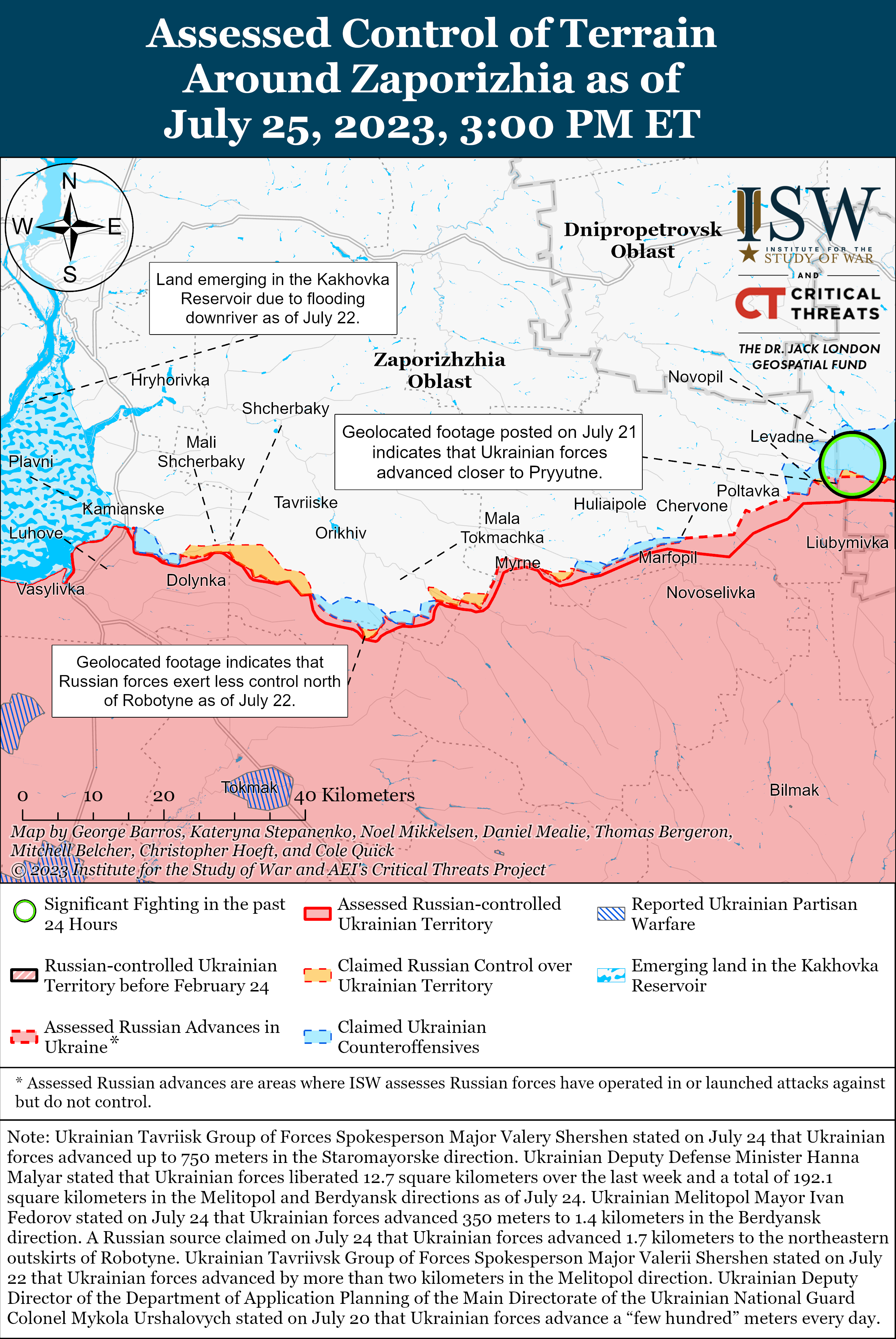 Ukrainian forces continued counteroffensive operations in western Zaporizhia Oblast and reportedly made marginal advances west of Orikhiv on July 25. The Ukrainian General Staff reported that Ukrainian forces continued offensives in the Melitopol (western Zaporizhia Oblast) direction.[63] Russian milbloggers claimed that Ukrainian forces conducted assaults from near Lobkove (26km southwest of Orikhiv) towards Luhove (31km southwest of Orikhiv) and noted that Ukrainian forces in the area usually conduct assaults from near Pyatykhatky (25km southwest of Orikhiv) towards Zherebyanky (26km southwest of Orikhiv).[64] Russian milbloggers claimed that Russian forces retreated to unspecified prepared lines of defense in the area.[65] Other Russian milbloggers claimed that Russian forces repelled Ukrainian assaults in the Pyatykhatky area and that Russian artillery units struck a small Ukrainian group with armored vehicles that tried to advance in the direction of Robotyne (12km south of Orikhiv).[66]